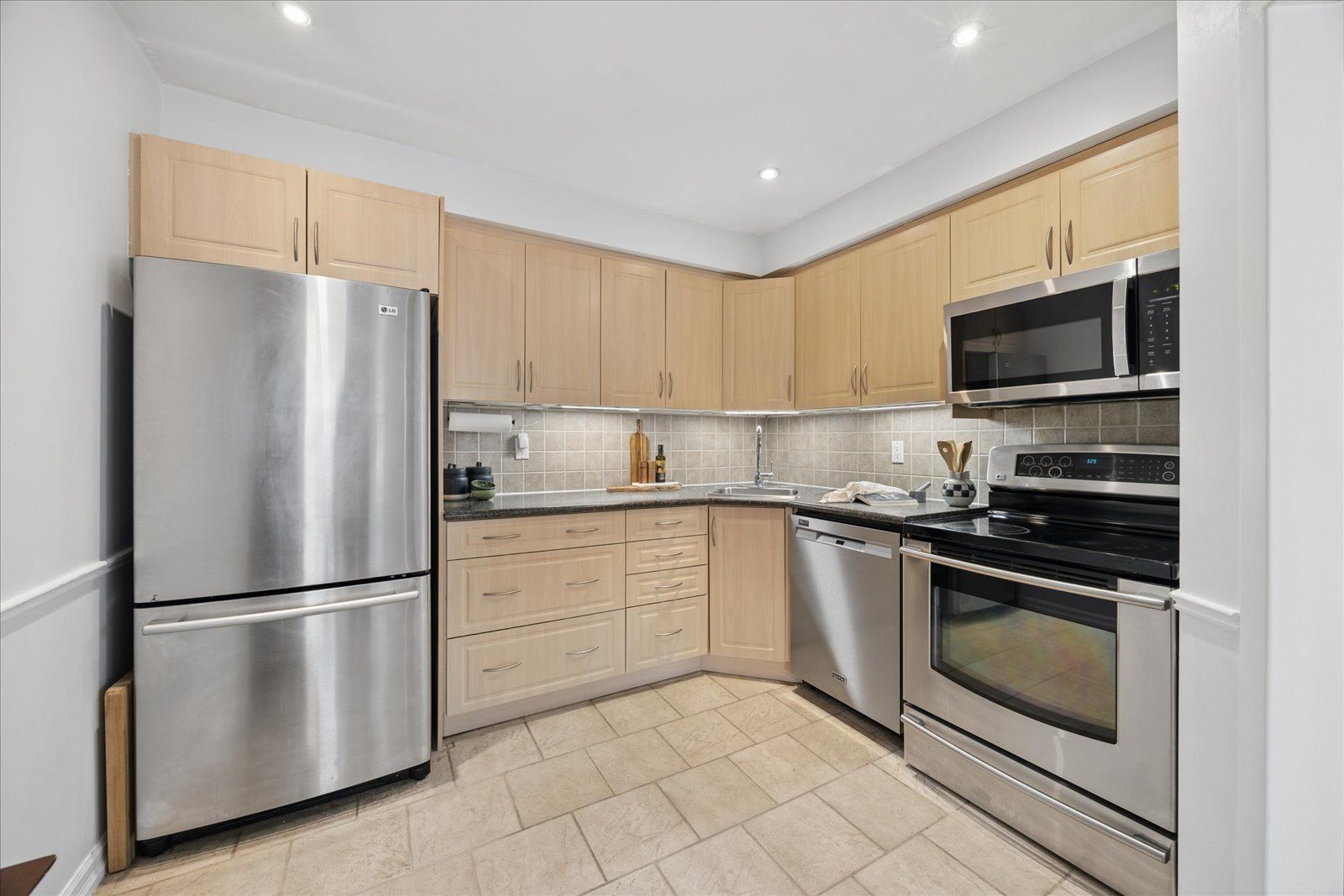 • Functional kitchen with stainless steel appliances and stylish backsplash.