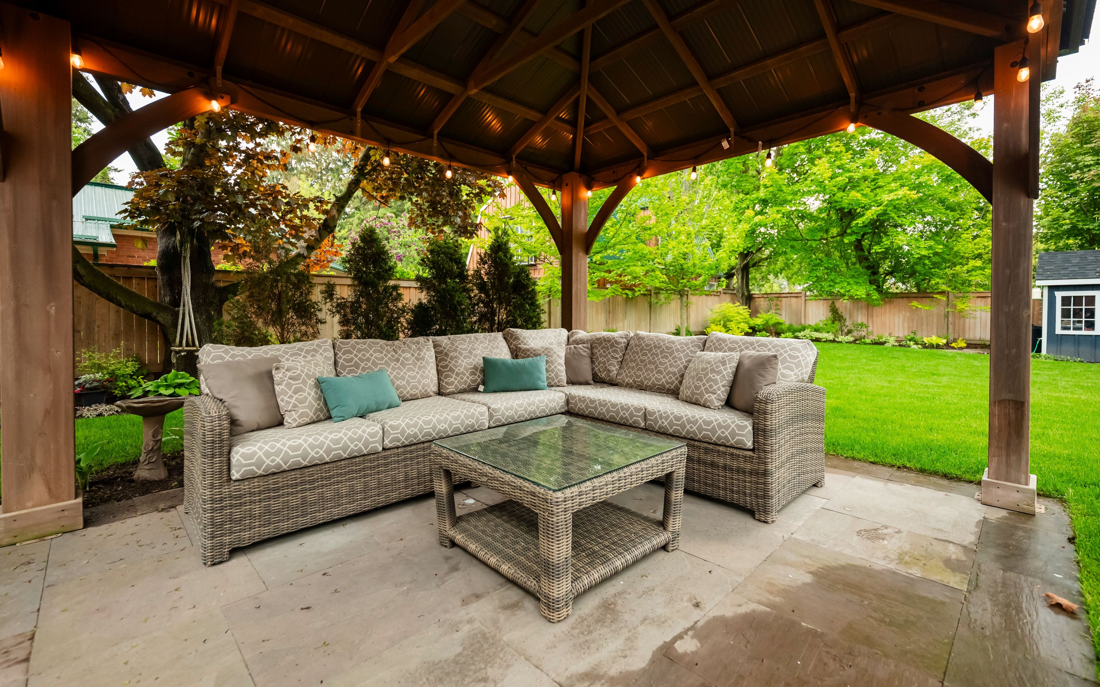 • Stunning backyard with stone patio, lush gardens, and a gazebo.