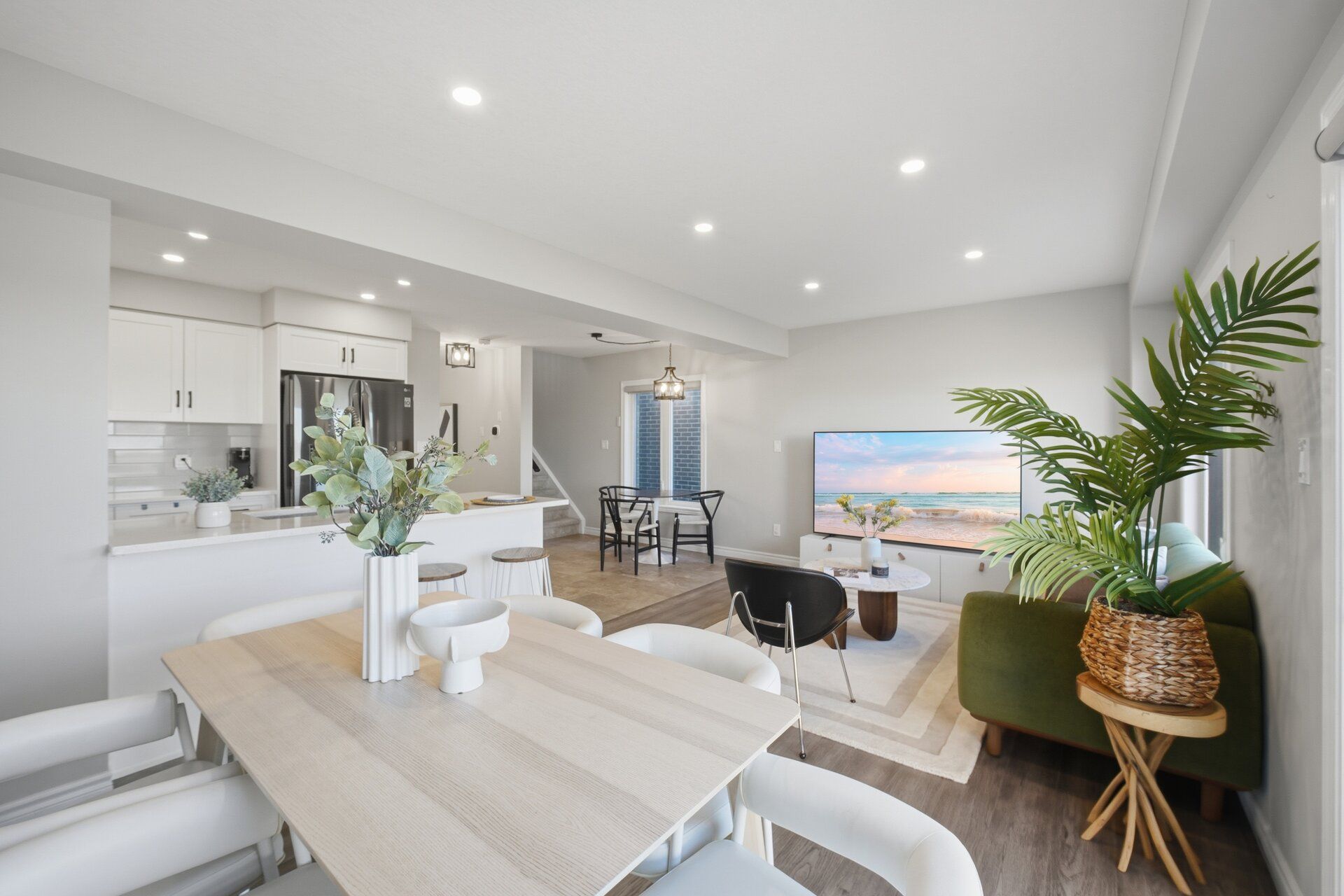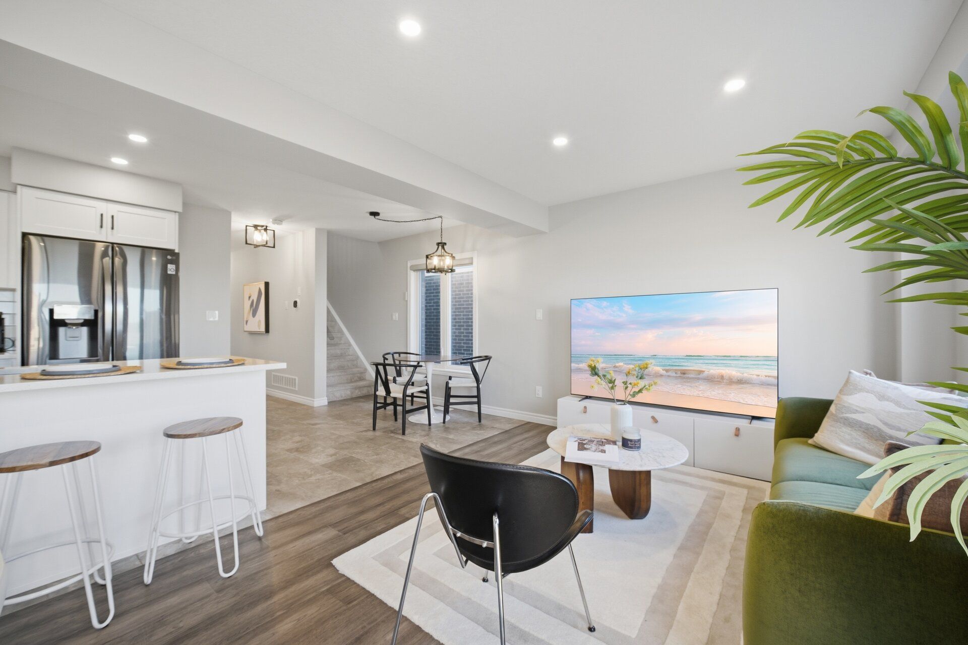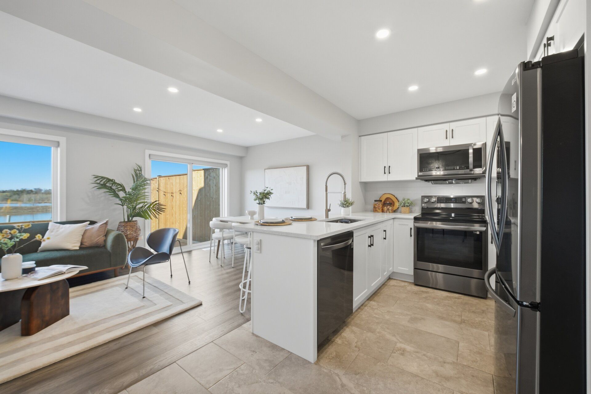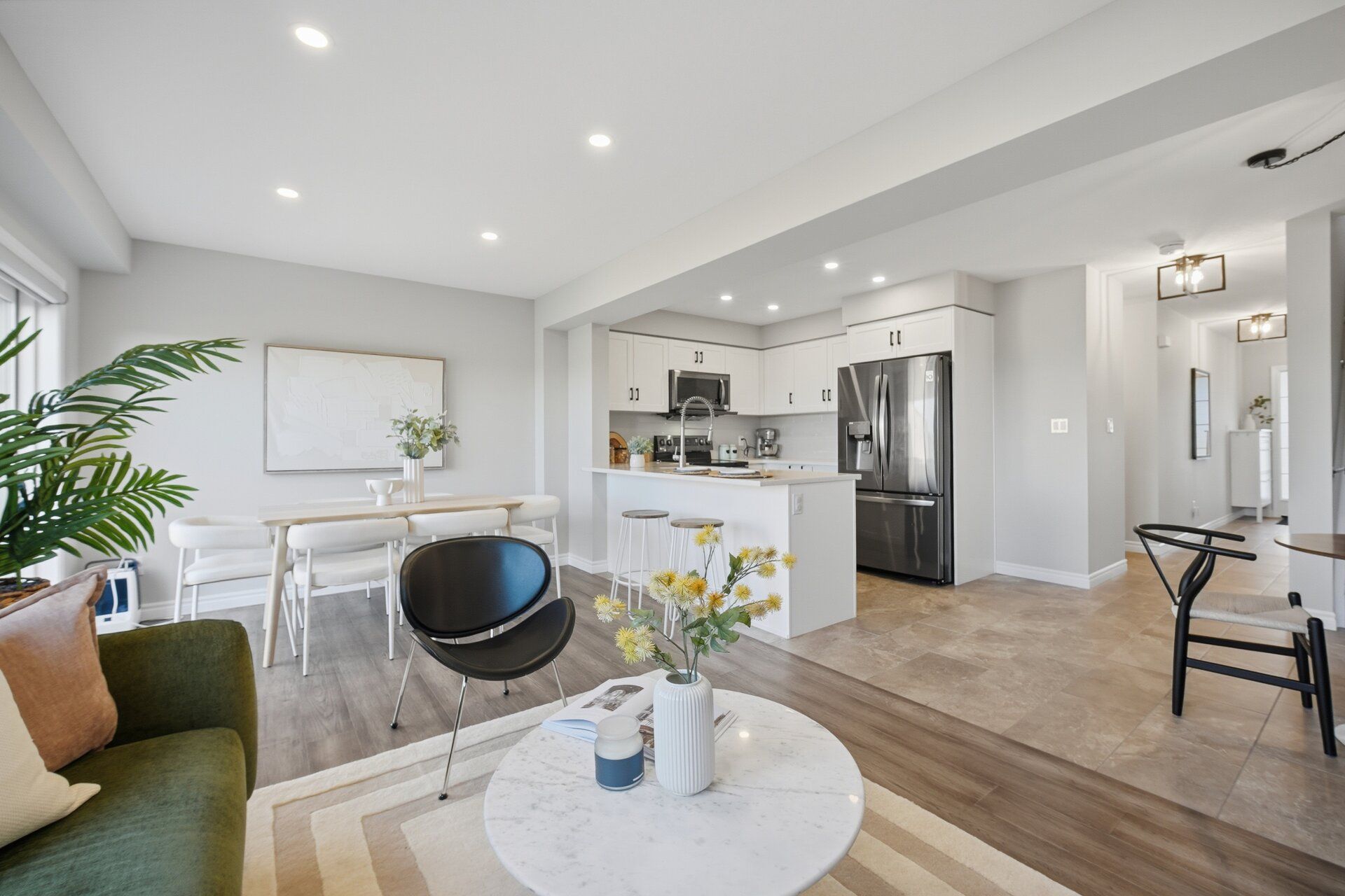 • Open-concept layout with modern kitchen, quartz countertops, and stainless steel appliances.