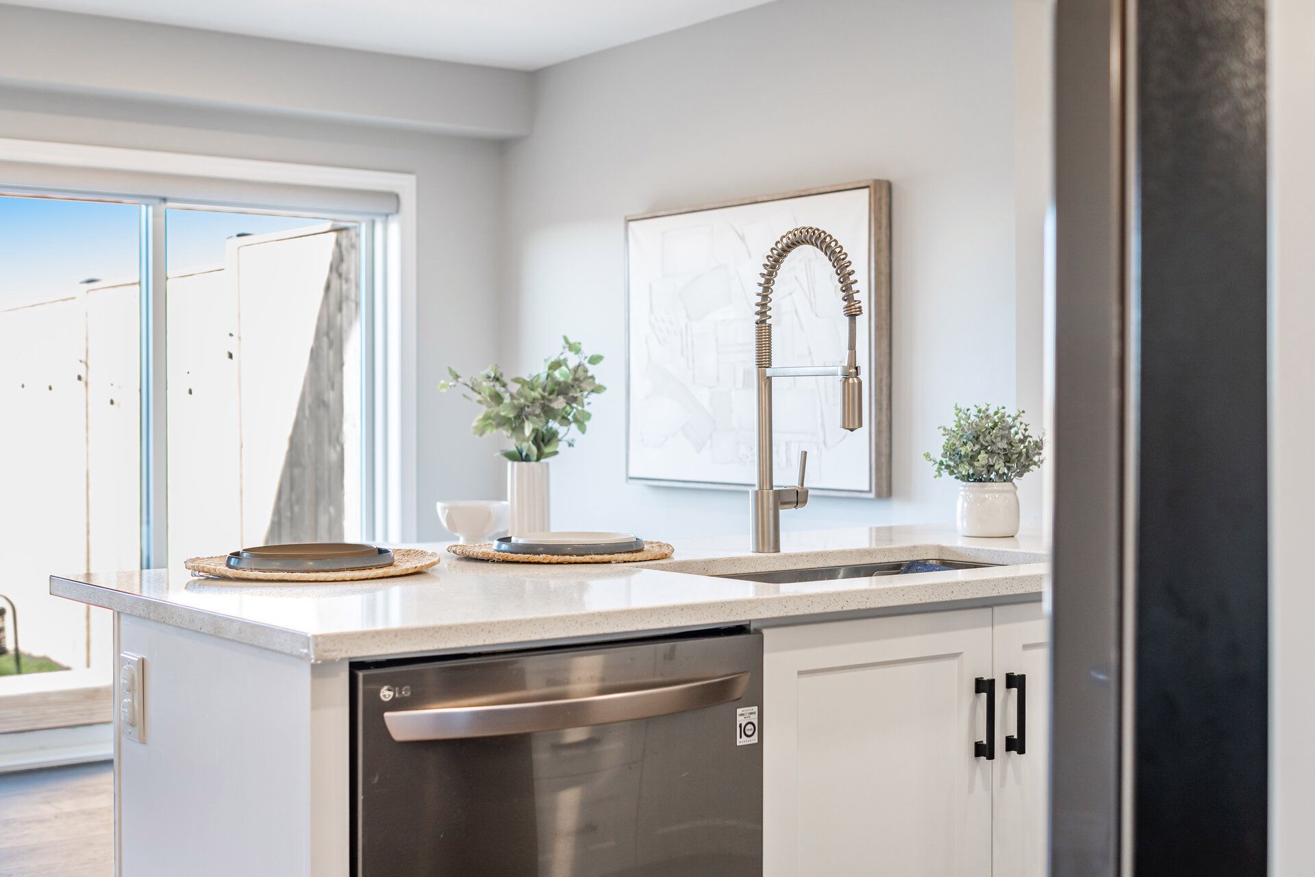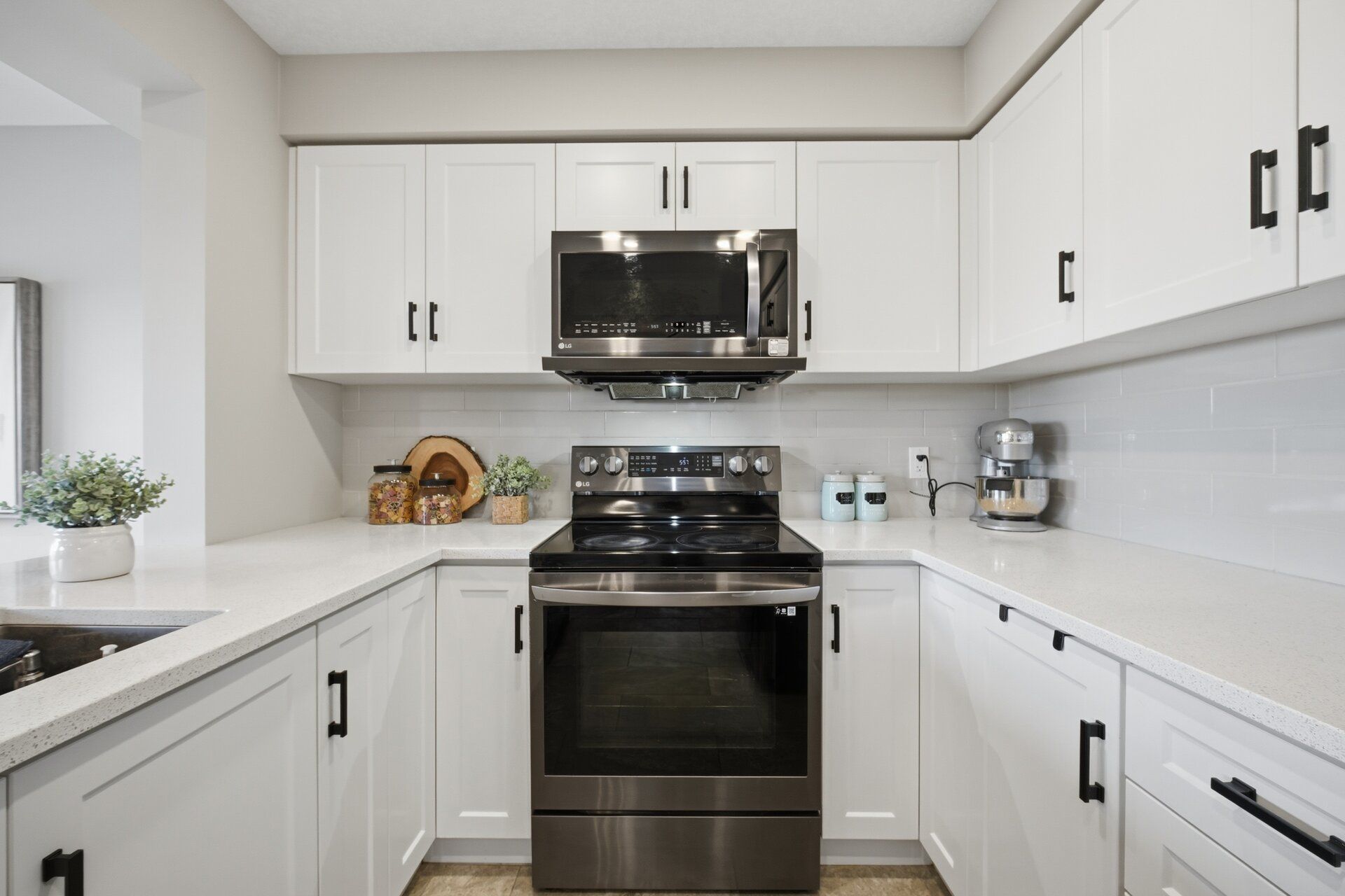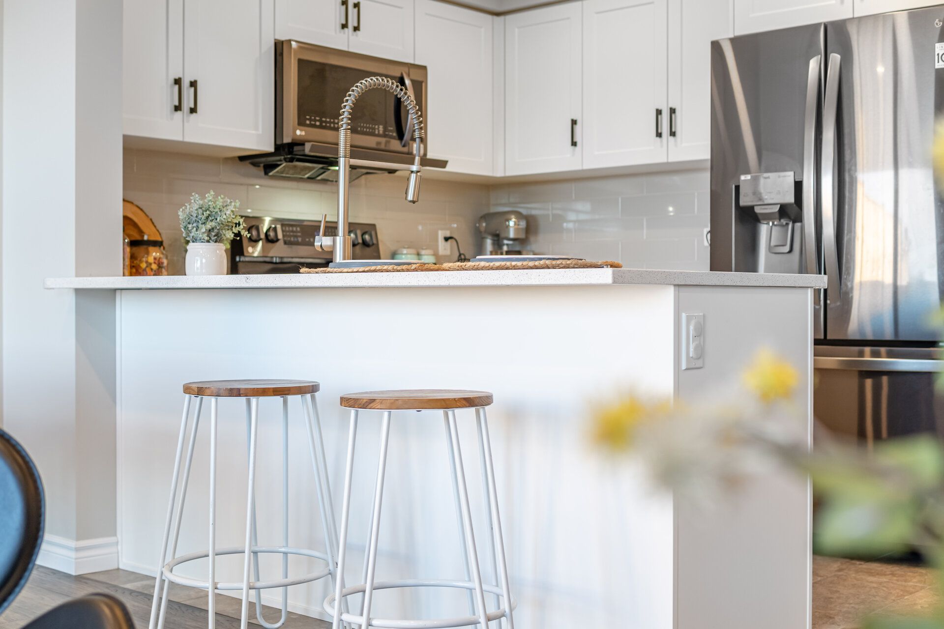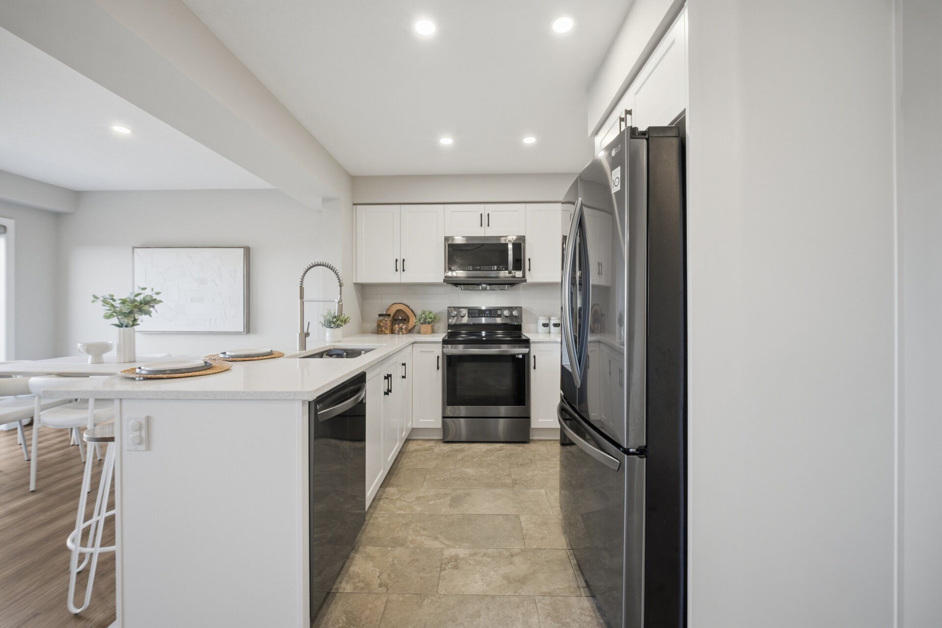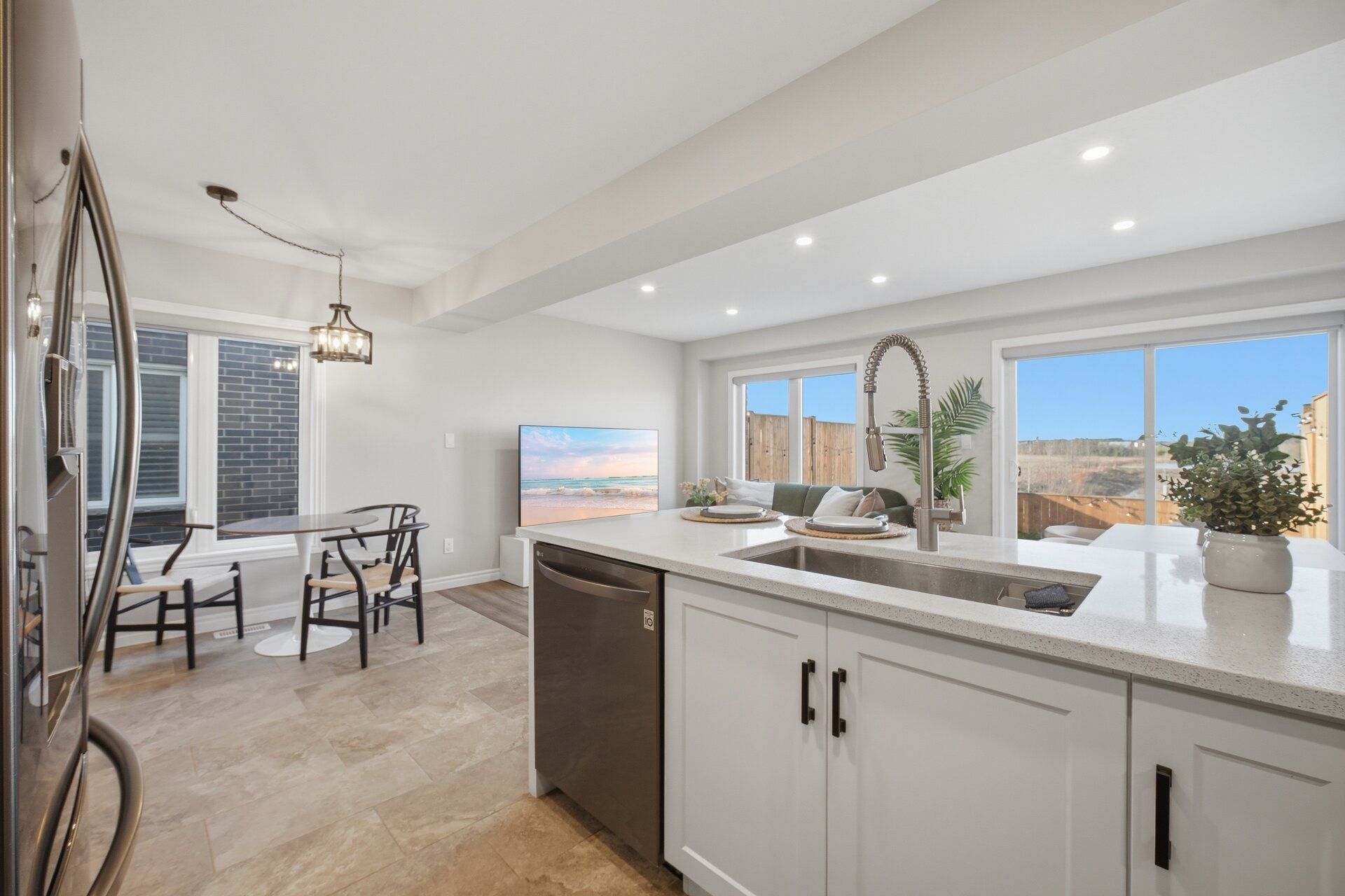 • Open-concept layout with modern kitchen, quartz countertops, and stainless steel appliances.