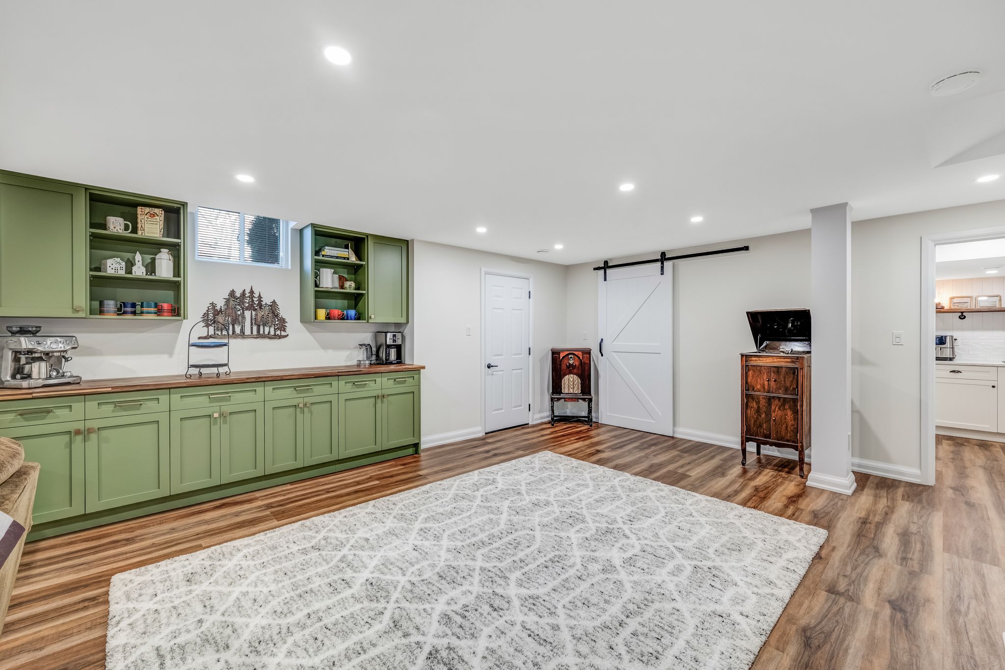 • Finished basement includes recreation room, kitchenette, and separate entrance.