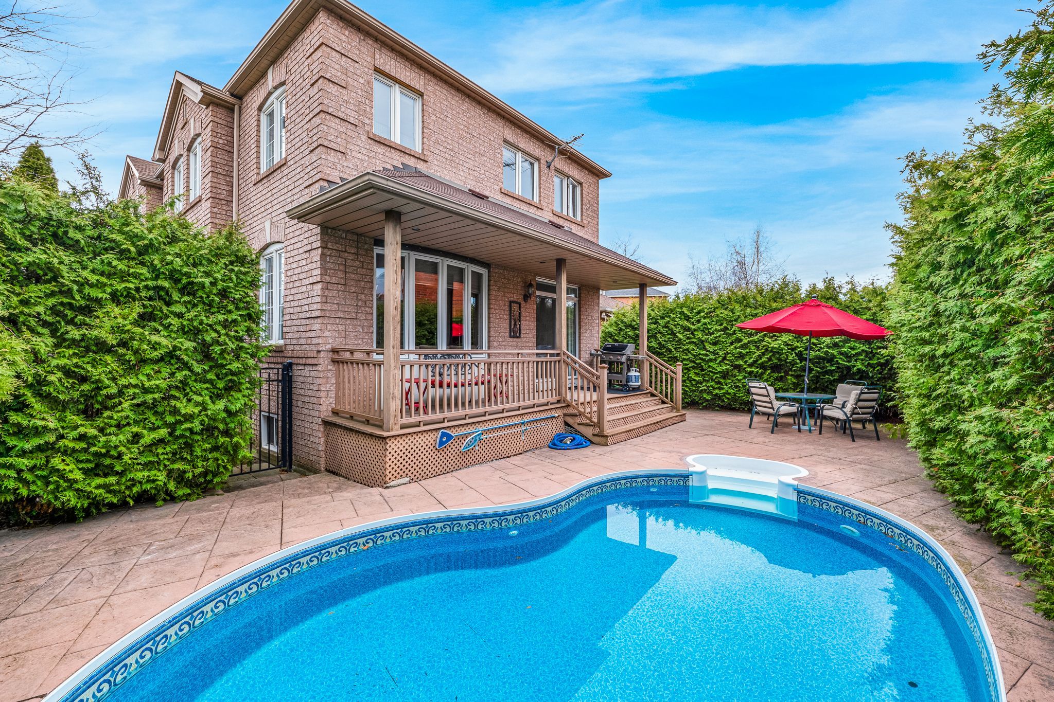 Welcome to 56 moreau trail in desirable clairlea-birchmount. This spacious detached 2-storey home offers approximately 2,544 sq ft above grade plus a finished basement, featuring 5 bedrooms, 3 bathrooms, and a double built-in garage with 4 total parking spaces. Main floor highlights include hardwood flooring, open concept living and dining room, separate family room with gas fireplace, and an updated kitchen with granite countertops, breakfast area, and walk-out to deck, backyard and inground pool. Ideal layout for families and entertaining. Upper level features a large primary bedroom with walk-in closet and 4-piece ensuite, plus four additional bedrooms perfect for growing families, home office, or guest rooms. Finished basement includes recreation room with kitchenette, beautiful built-in cabinetry, and additional living space for media room, gym and more. There is a separate entrance to the basement through the garage. Exterior offers brick construction, private driveway, double garage, and inground pool on a 37 x110 ft lot. Located steps to public transit and approximately 5 minutes to warden subway station. Close to schools, parks, shopping, and major routes including warden avenue and st. Clair avenue east. Perfect for families seeking space, transit convenience, and a move-in ready detached home in east toronto.