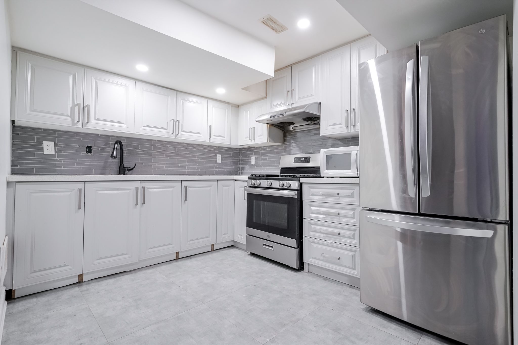 • Upgraded eat-in kitchen featuring stylish backsplash and ceramic flooring.