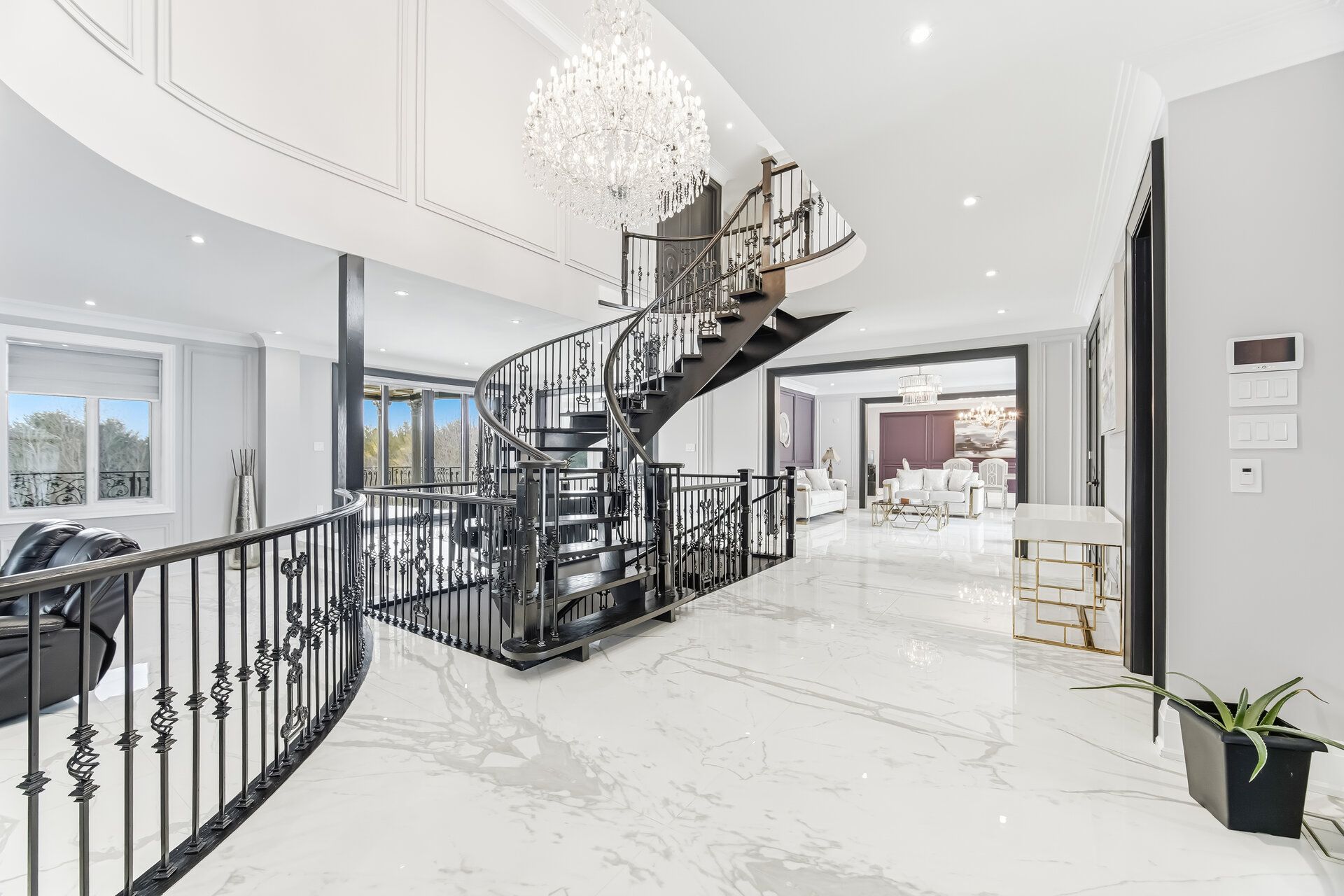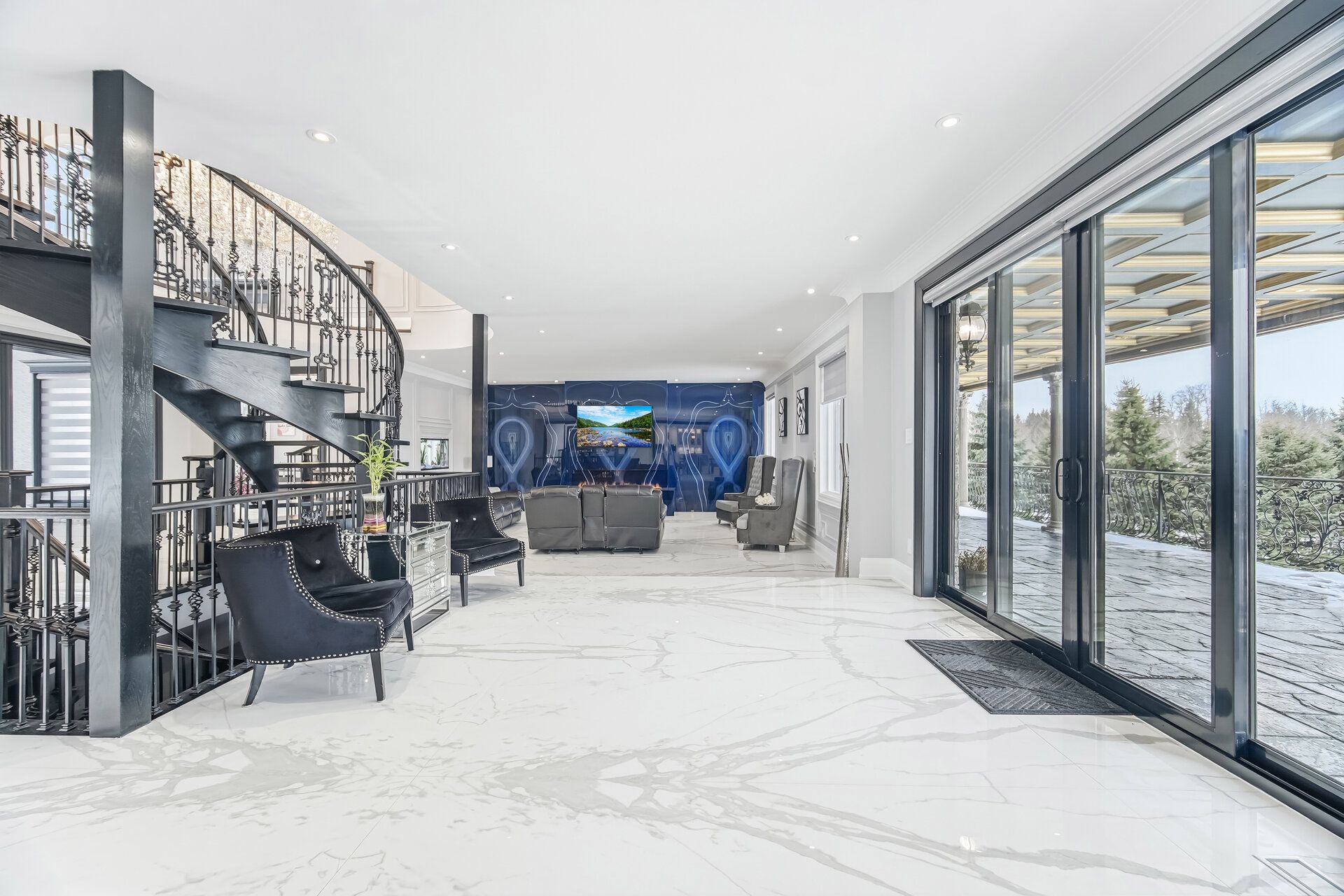 Presenting 56 orico court-an italian-inspired, architecturally designed castle located on a premier 1. 7 acre ravine lot backing on to the conservation as far as you can see in the prestigious enclave of kleinburg. Offering exceptional privacy and serenity, this one-of-a-kind residence showcases unparalleled craftsmanship, sophistication, and scale. Boasting 7800 sq. Ft. Of refined living space, the home features 4+1 spacious bedrooms and 5 luxurious bathrooms. Italian bookmatched 8ft by 4ft porcelain slabs are seamlessly installed throughout the floors, bathrooms, and rare 10ft by 5ft blue designer slabs in the family room, creating a dramatic and cohesive design statement. The main chef's kitchen & the spice kitchen are true showpiece, complete with premium wolf, sub-zero & cove appliances with an oversized bookmatched quartzite island sourced from spain. Custom millwork, real marble countertops, elegant crown moulding's, crystal chandeliers, and thoughtfully curated ambient lighting elevate the interior & exterior experience throughout. Rarely does a property of this caliber and pedigree become available. A true architectural masterpiece offering luxurious, family-focused living in one of kleinberg's most desirable and prestigious neighborhood.