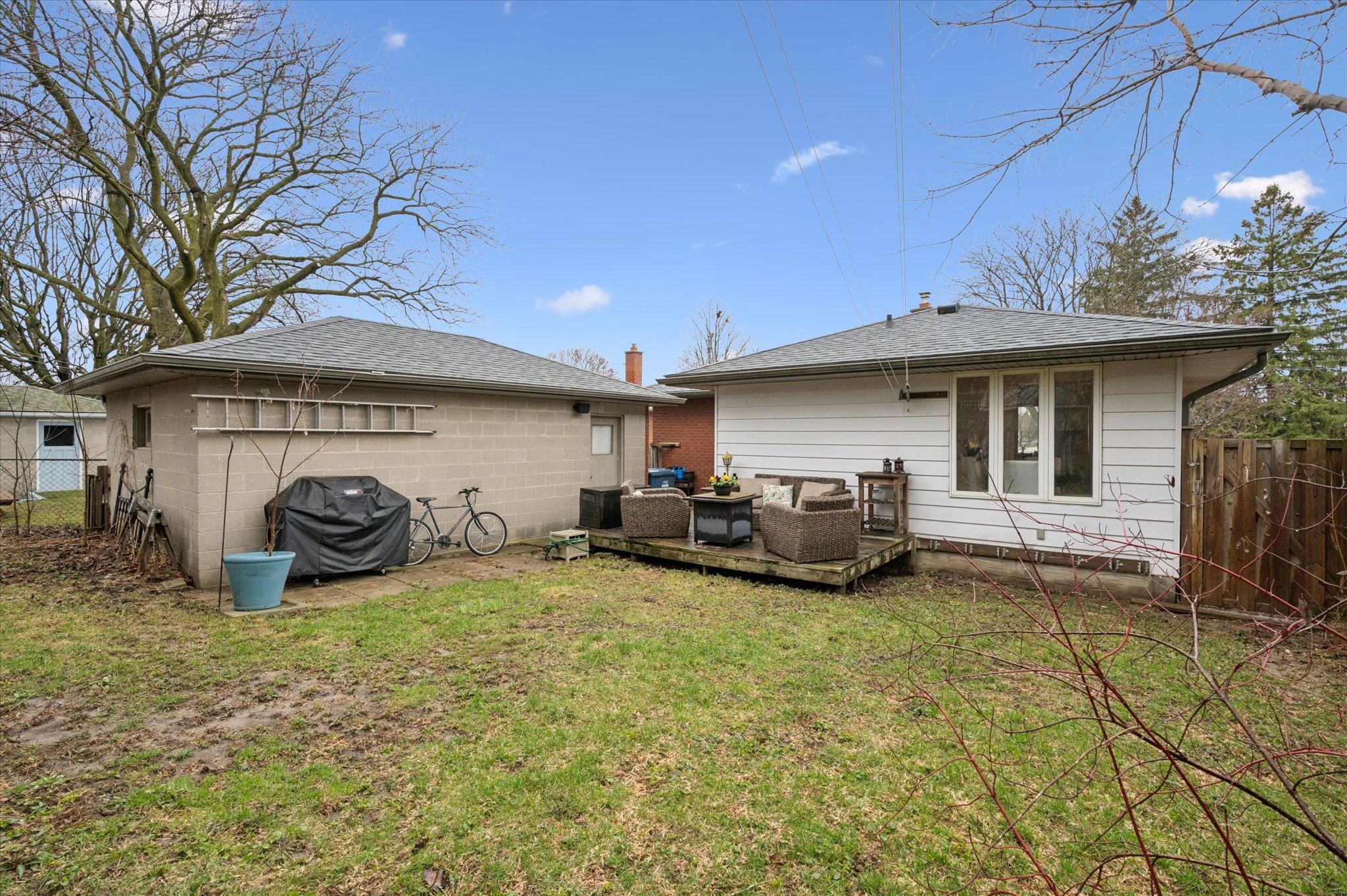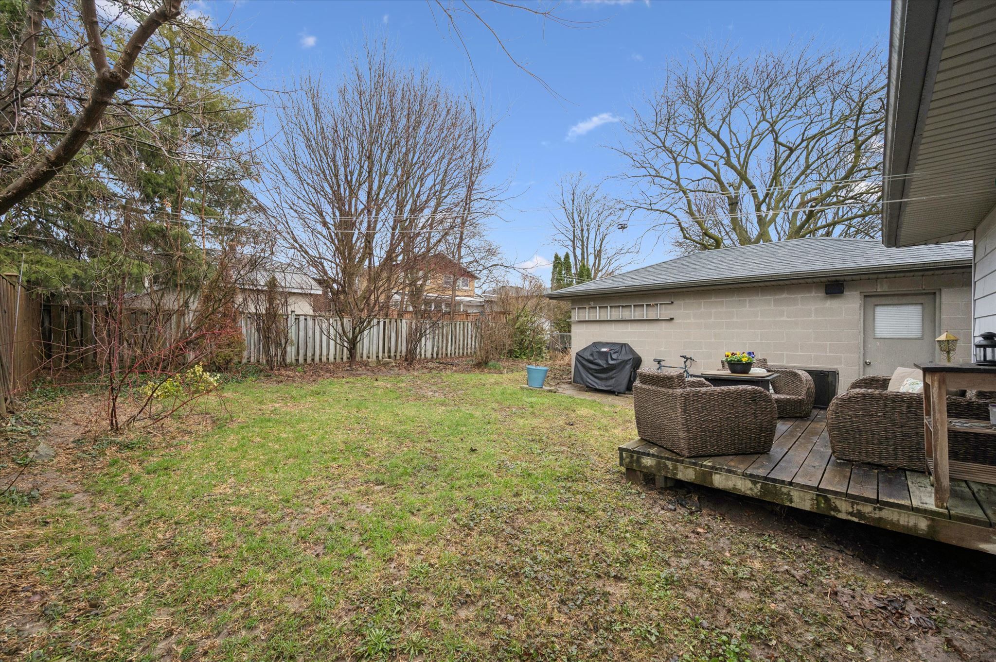 • Private backyard with a large deck and mature greenery for outdoor enjoyment.
