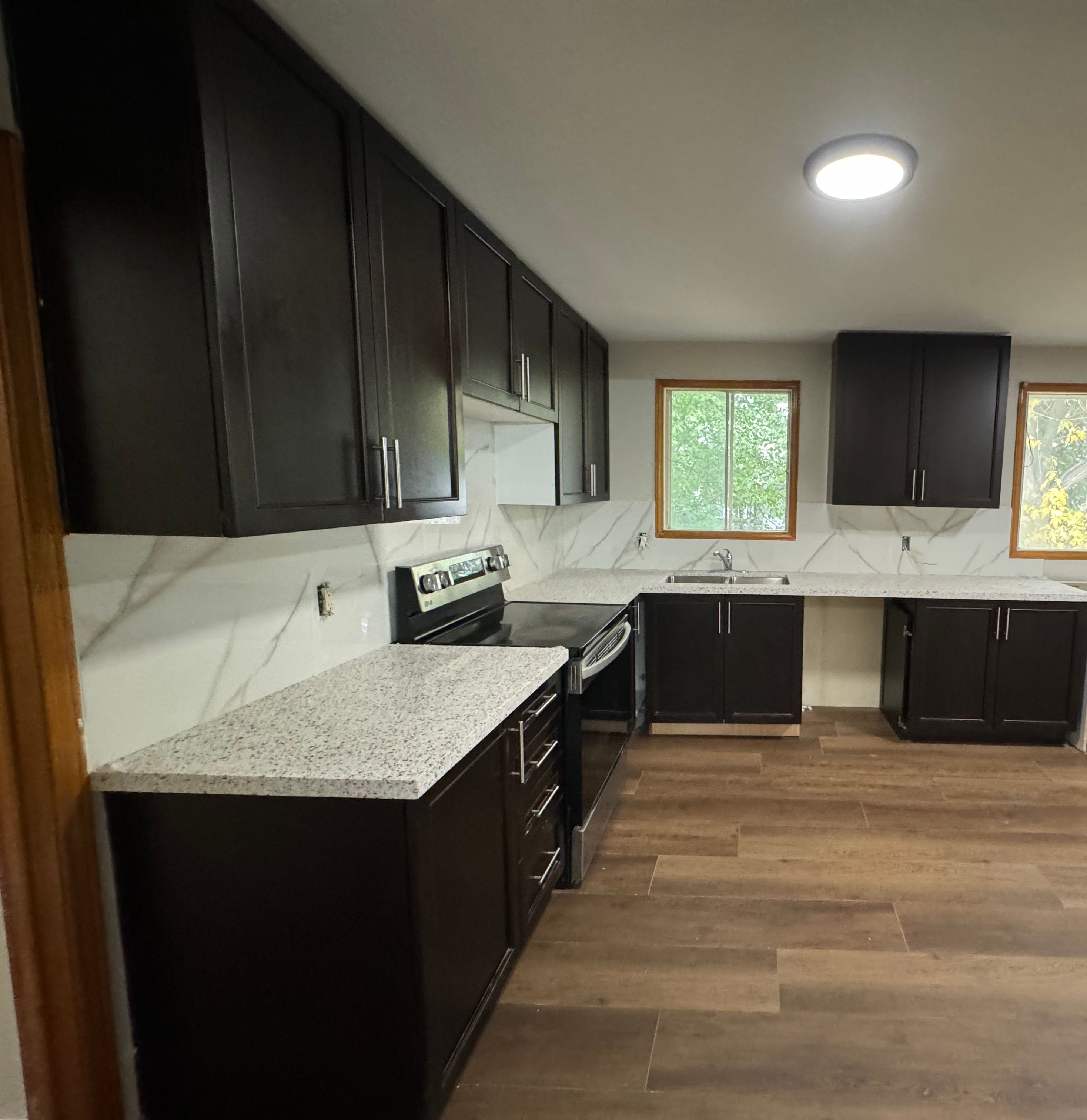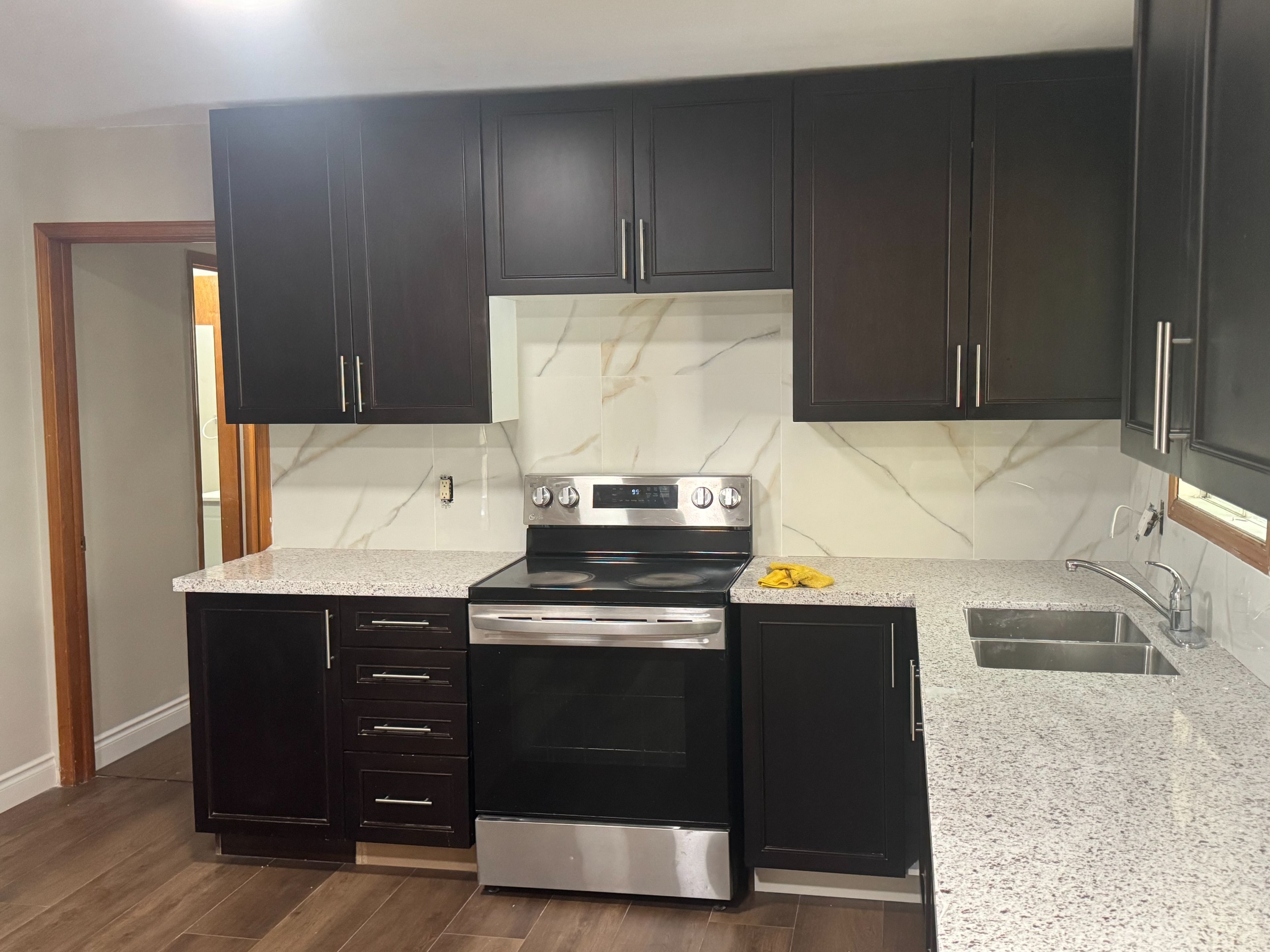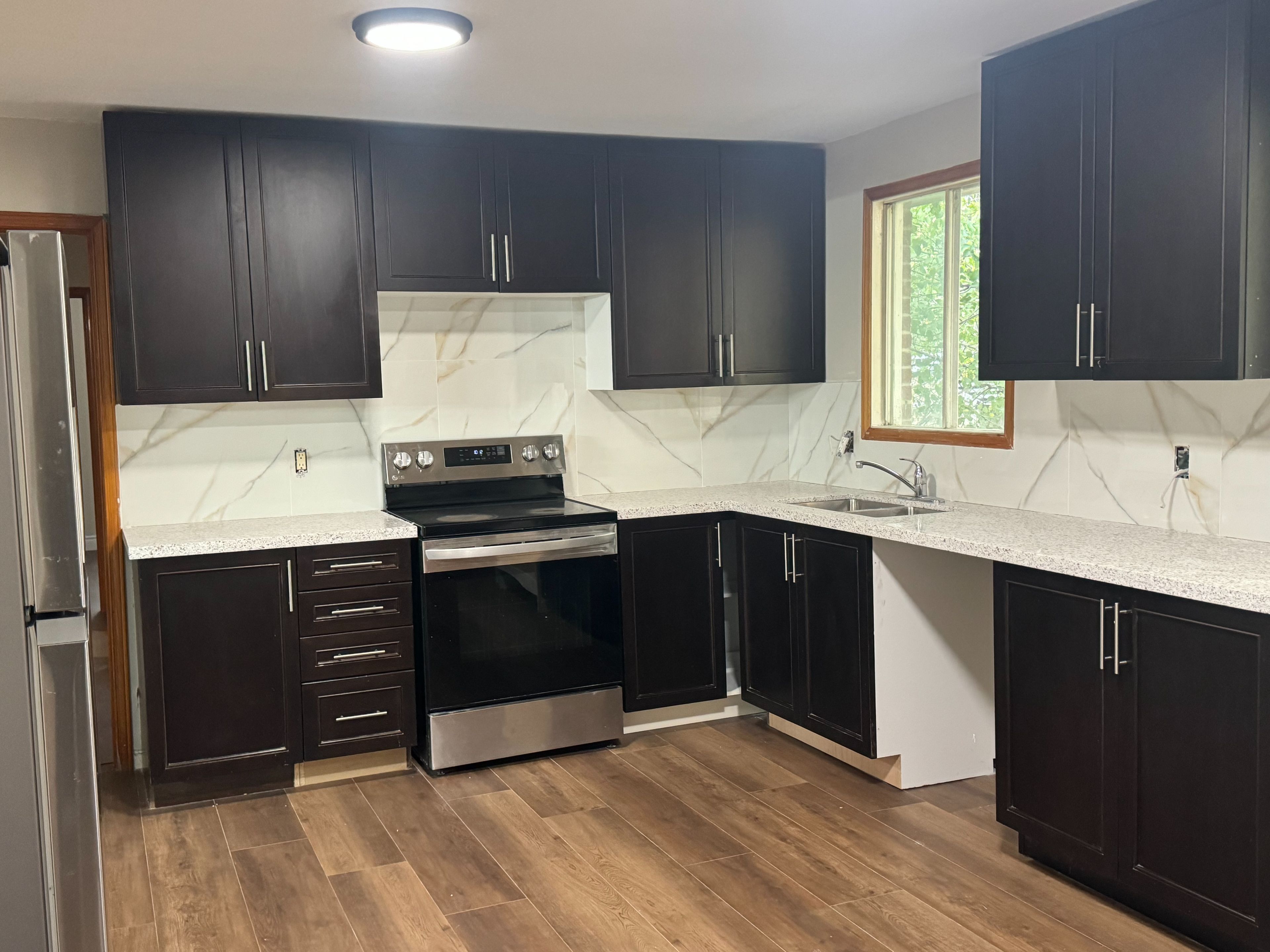 • Large living room and eat-in kitchen with stainless steel appliances.
