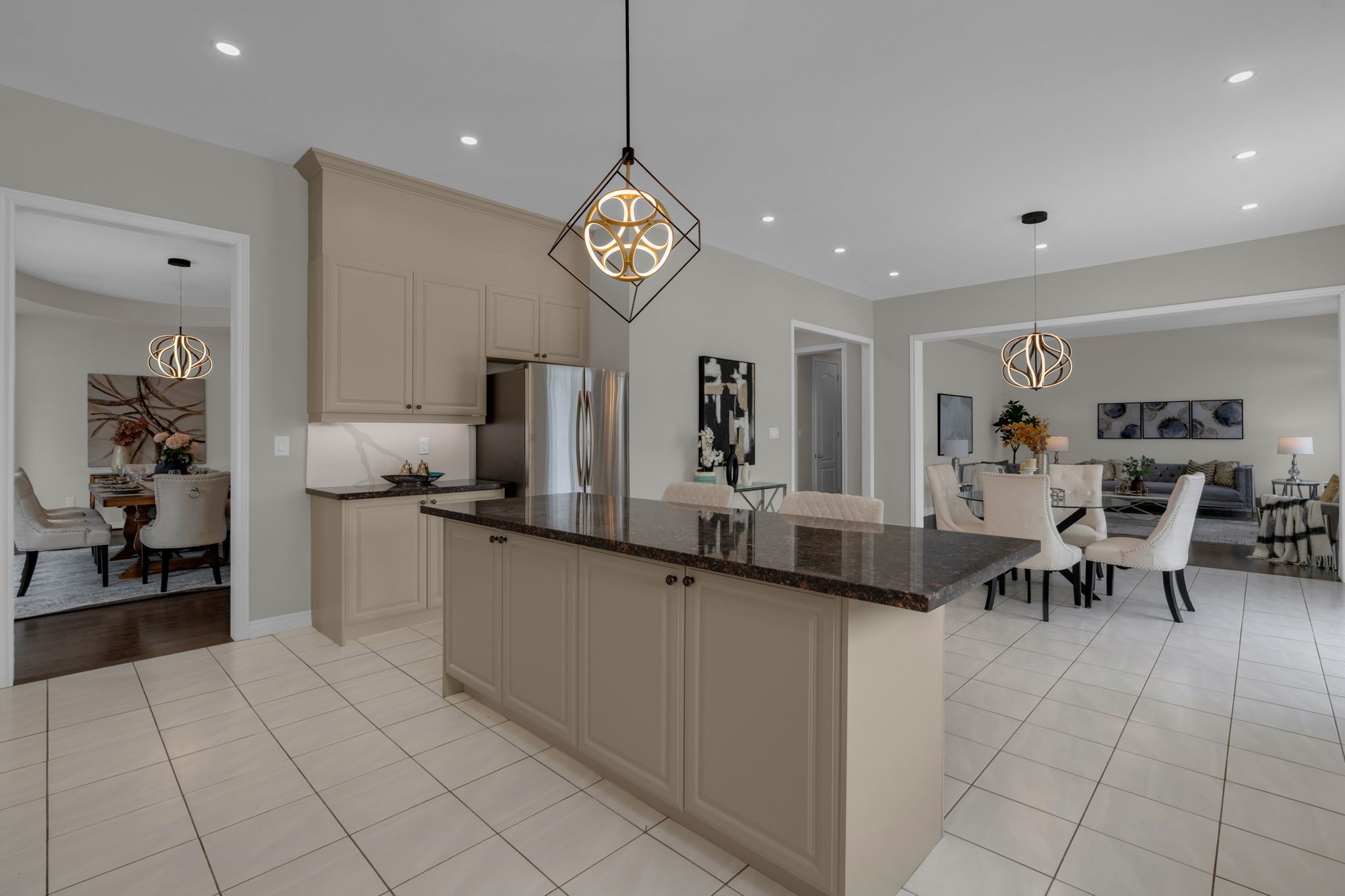 • Large kitchen with granite countertops and a functional island.
