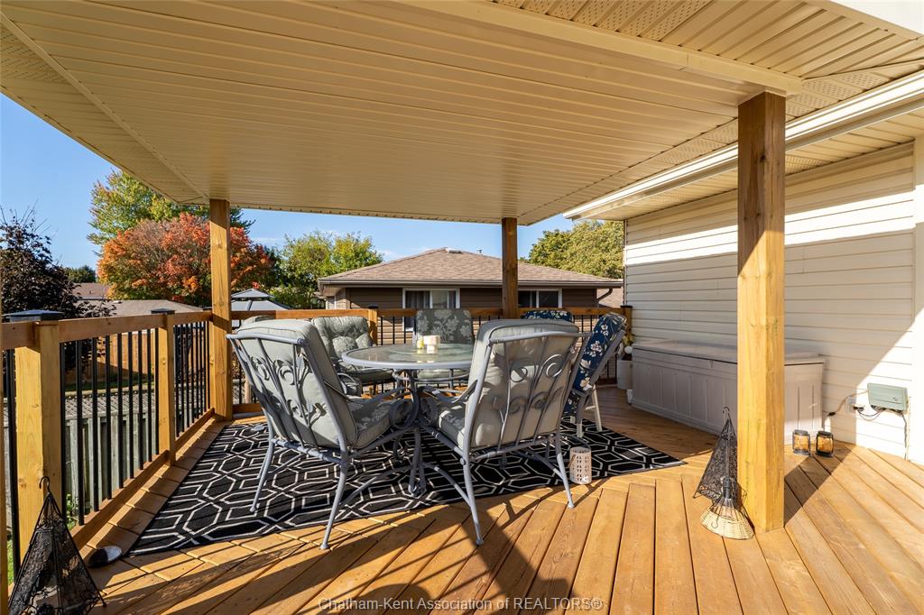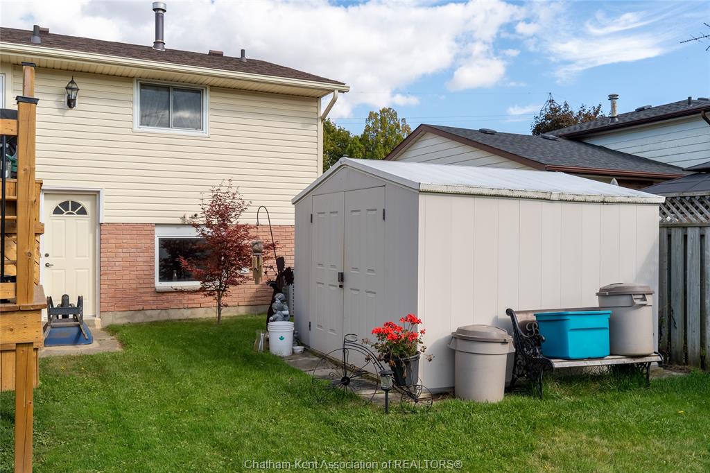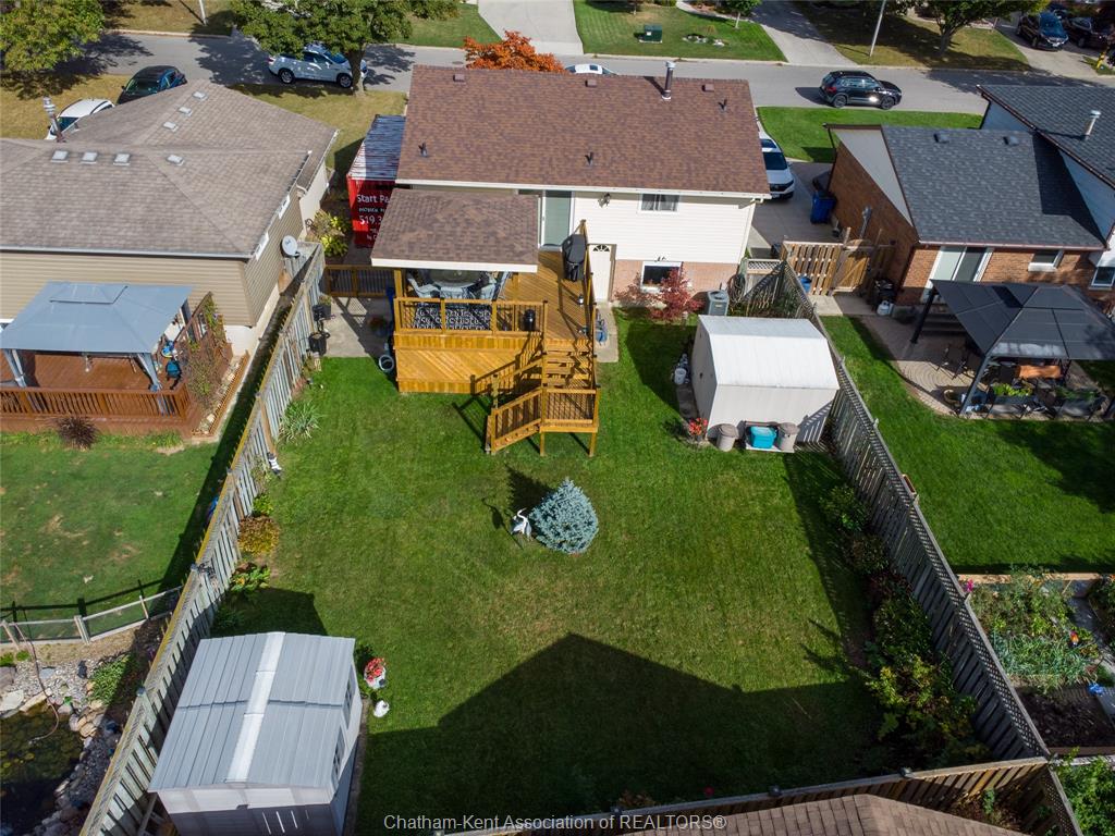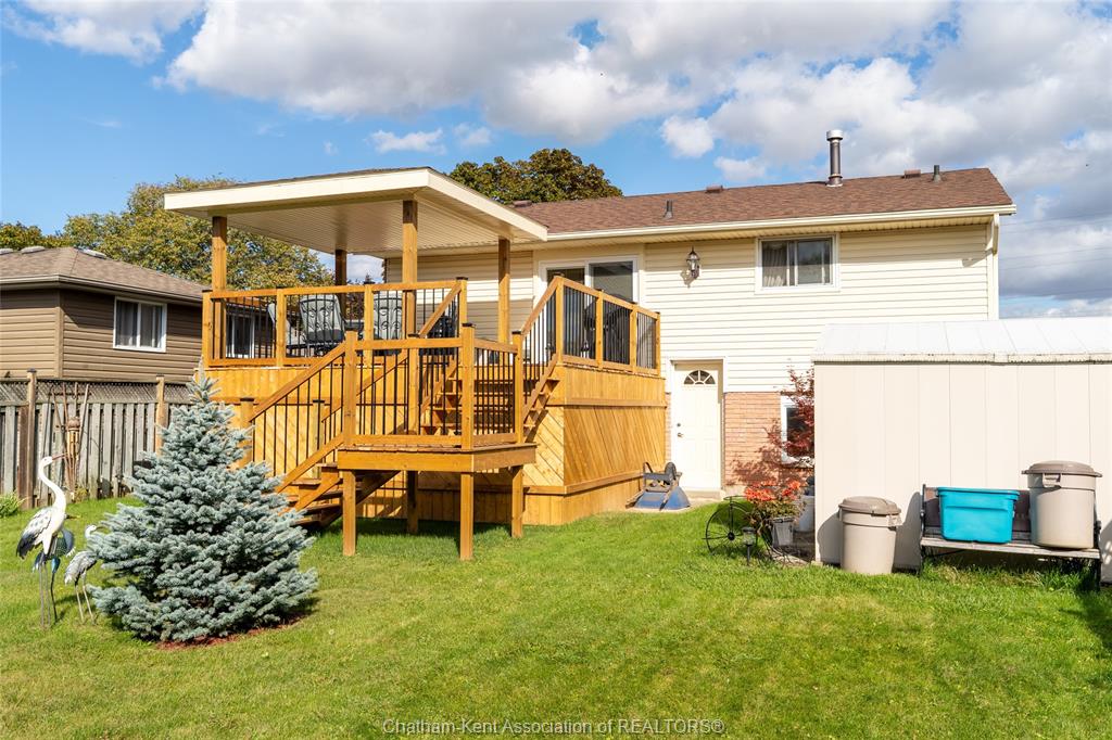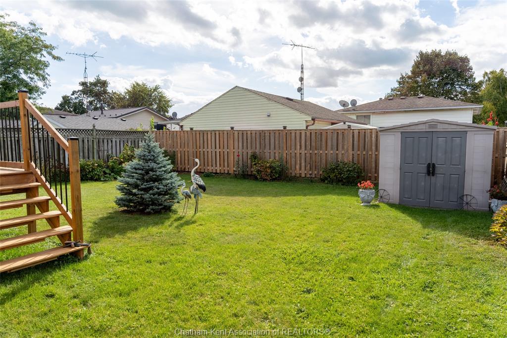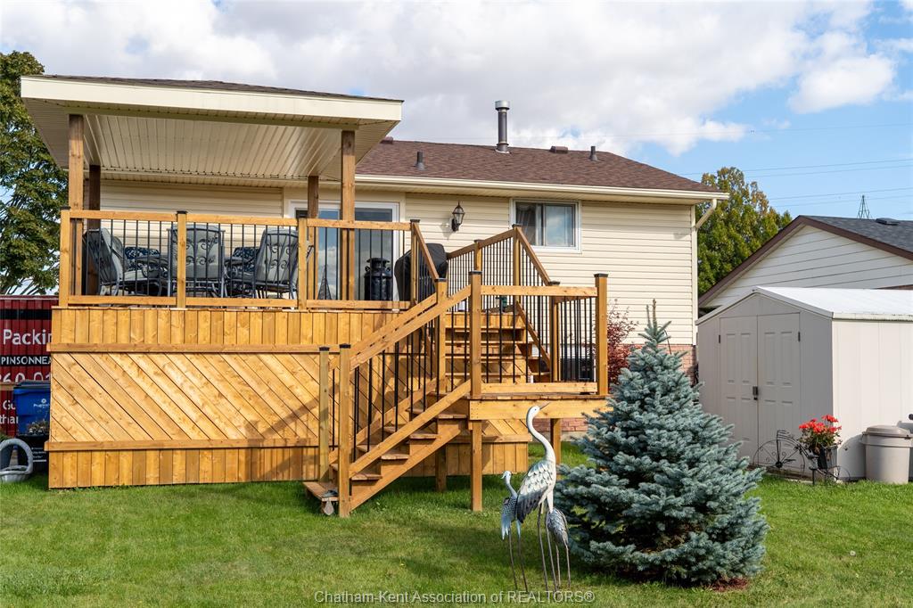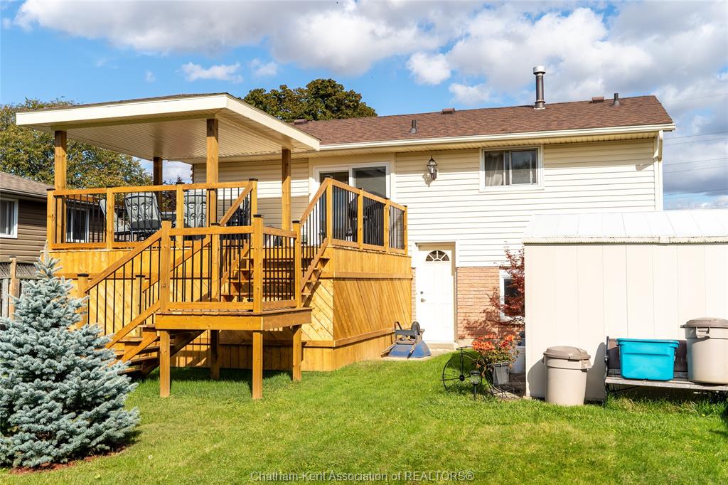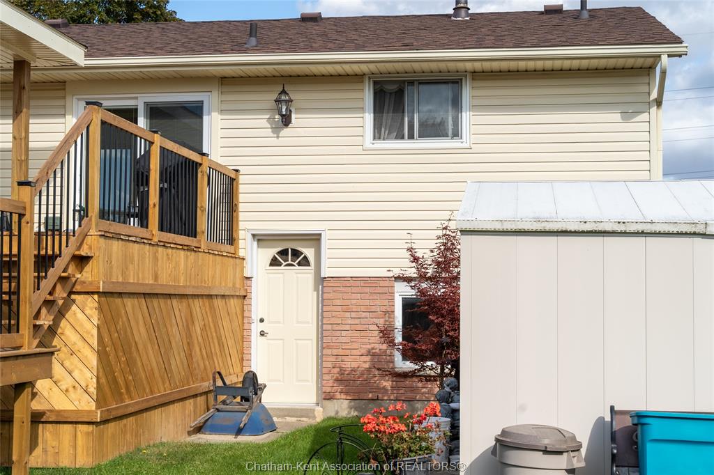 Welcome to this beautifully maintained raised ranch on a quiet crescent in chatham’s desirable northside neighbourhood. Pride of ownership is evident inside and out, with immaculate landscaping, lush gardens, and an inground sprinkler system front and back keeping everything picture-perfect. The main level offers a bright, inviting open-concept living and dining area, a custom oak eat-in kitchen with built-in cabinetry, and new patio doors (2025) leading to a spectacular multi-level covered deck built in 2025 — ideal for entertaining or relaxing while overlooking the beautifully fenced backyard. Two comfortable bedrooms and a 4-piece bath complete the main floor. The lower level features a spacious family room with fireplace, a third bedroom or optional home office, a convenient 2-piece bath, laundry area, storage, and a walk-out to the backyard. Outdoors, enjoy two storage sheds, a manicured lawn, and tasteful landscaping that enhance this home’s curb appeal and functionality. Located in a peaceful, family-friendly area close to parks, schools, and shopping — this home is move-in ready and a true standout for those seeking quality, comfort, and care.