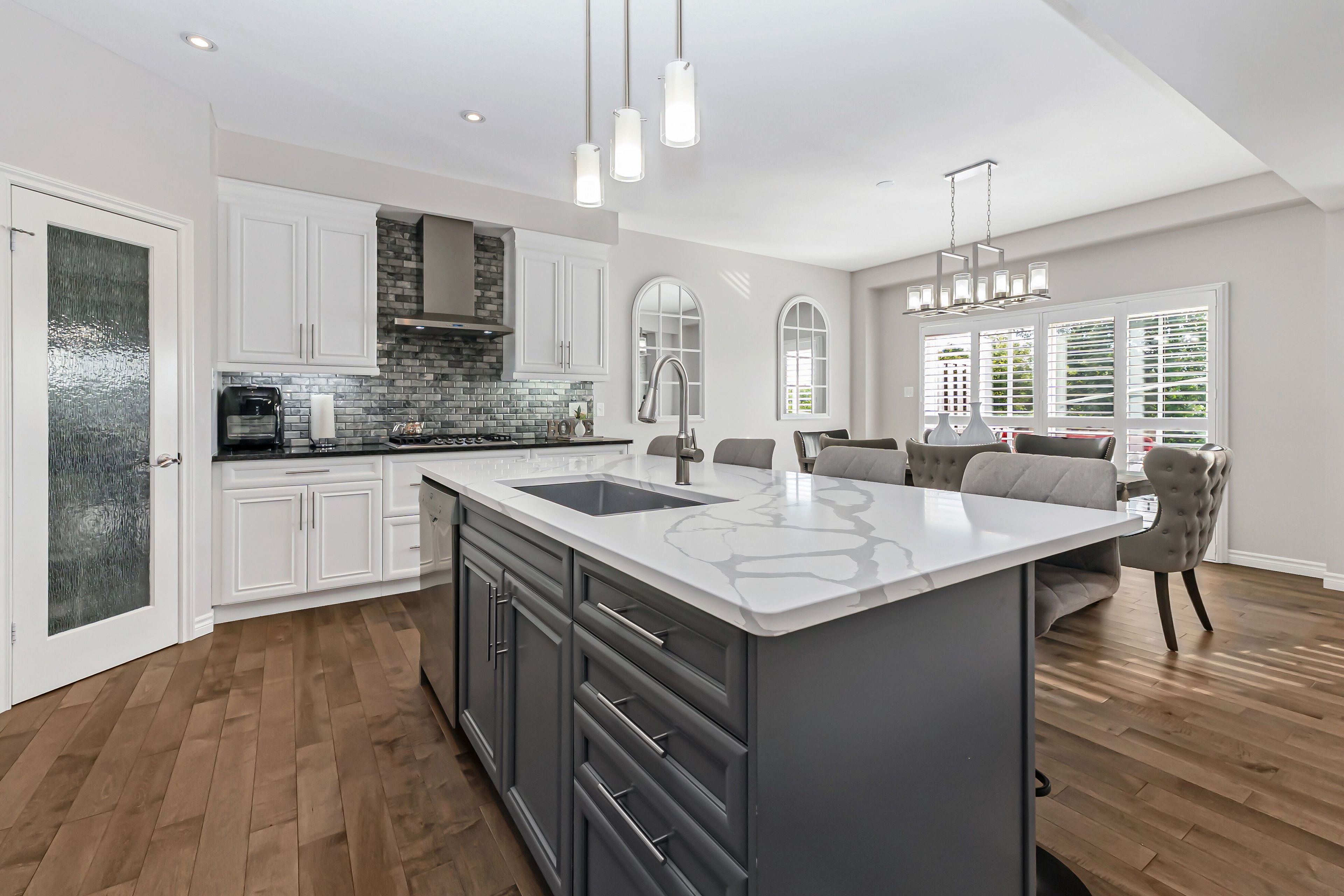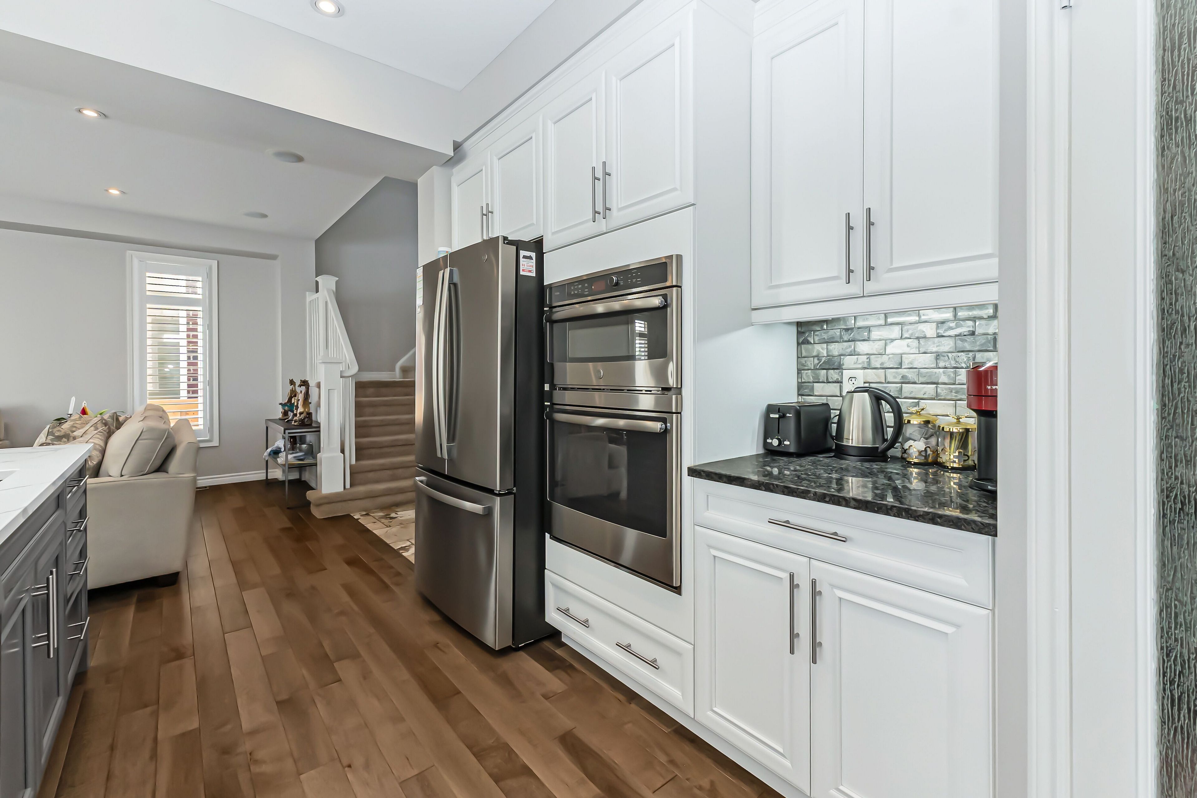 • Modern kitchen with quartz countertops and built-in appliances.