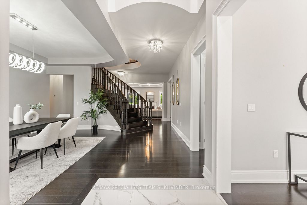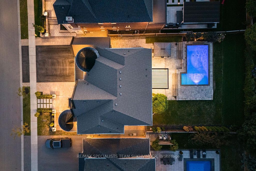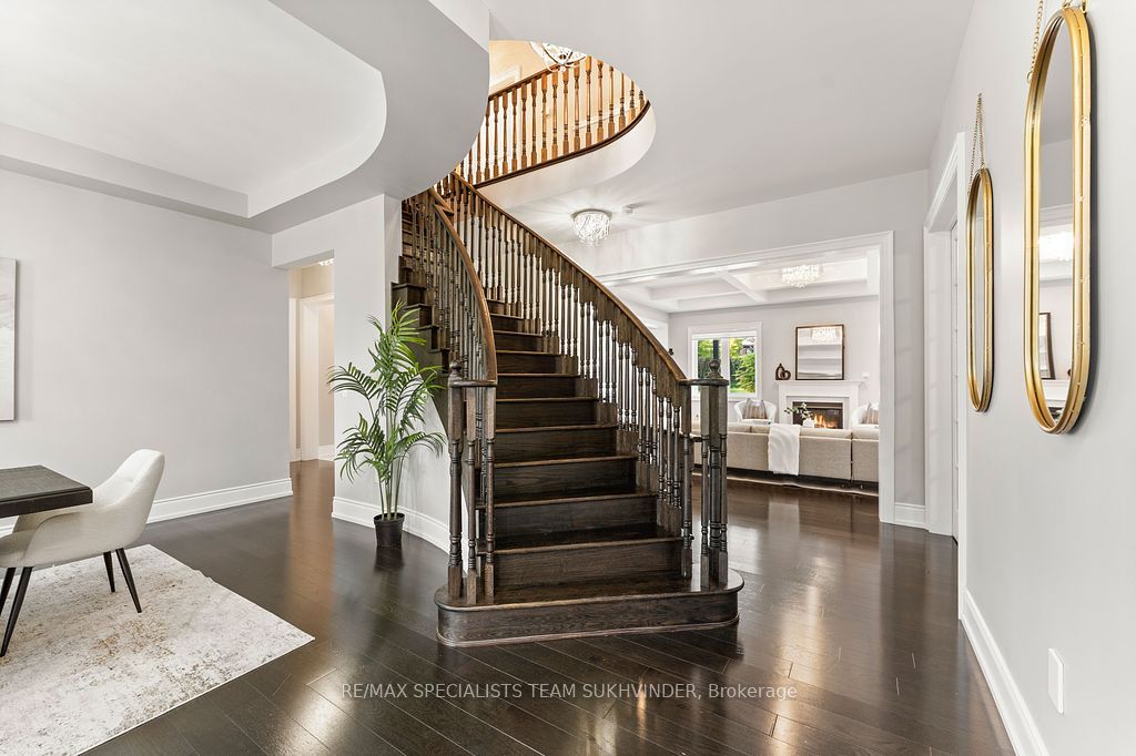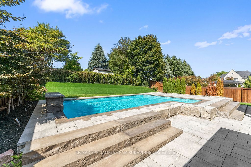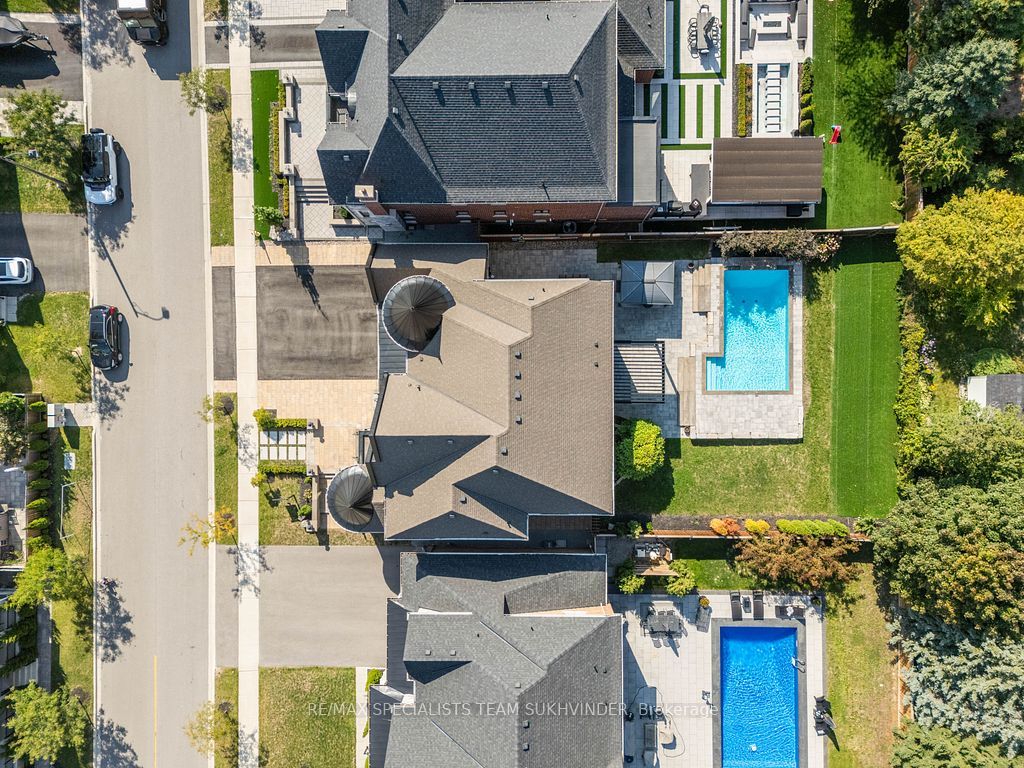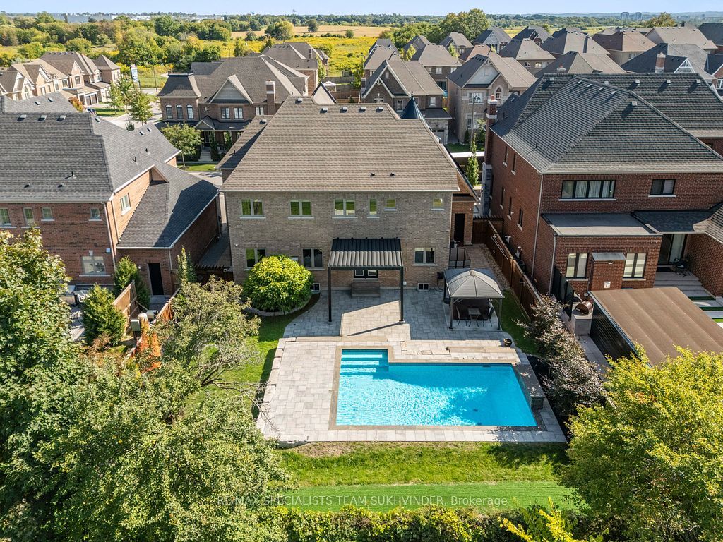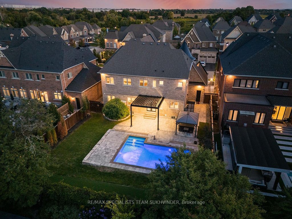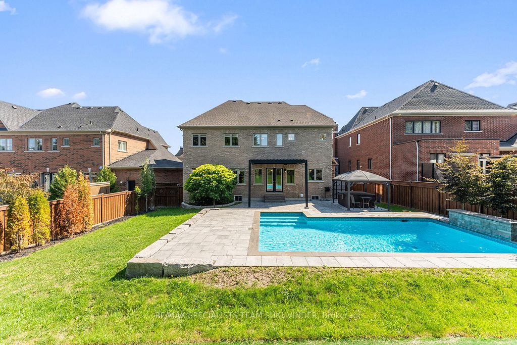 Architecturally captivating estate in sought-after sharon, set on a premium 69 x142 ft lot. Showcasing over 4,100 sq ft above grade, this luxuryresidence blends timeless elegance, modern indulgence, and resort-style living. A 3-car garage with parking for 9 vehicles enhancesconvenience and prestige. Step inside to a dramatic open to above foyer with a curved staircase, dazzling chandelier, and expansive sunlitwindows. The main level boasts soaring 10 ft ceilings, designer-curated finishes, and refined formal entertaining spaces. The chefs kitchen is atrue show piece sleek cabinetry, quartz counters, oversized island, and professional-grade stainless steel appliances flowing seamlessly into aluminous breakfast area and a grand family room with intricate waffle ceilings. The main-floor laundry features heated floors and bespoke builtins, elevating everyday functionality. The upper level offers an elegant primary retreat, complete with a tray ceiling, massive walk-in closet, and aspa-inspired ensuite featuring a freestanding soaker tub, opulent walk-through shower with dual entries, and elegant double vanities. Threeadditional bedrooms are spacious each with access to bathrooms. The lower level hosts an in-law suite with private ensuite, perfect forextended family or guests, with the flexibility to customize the remaining space. Outdoors, the backyard is a private resort professionallylandscaped grounds with extensive stonework, a pergola, hot tub, and a sparkling inground pool with stone surround, complemented by aconvenient outdoor shower. Perfectly designed for both lavish entertaining and tranquil everyday enjoyment. All within minutes to go transit,hwy 404, upper canada mall, top schools, parks, and scenic trails. This exceptional residence defines luxury living in sharon.