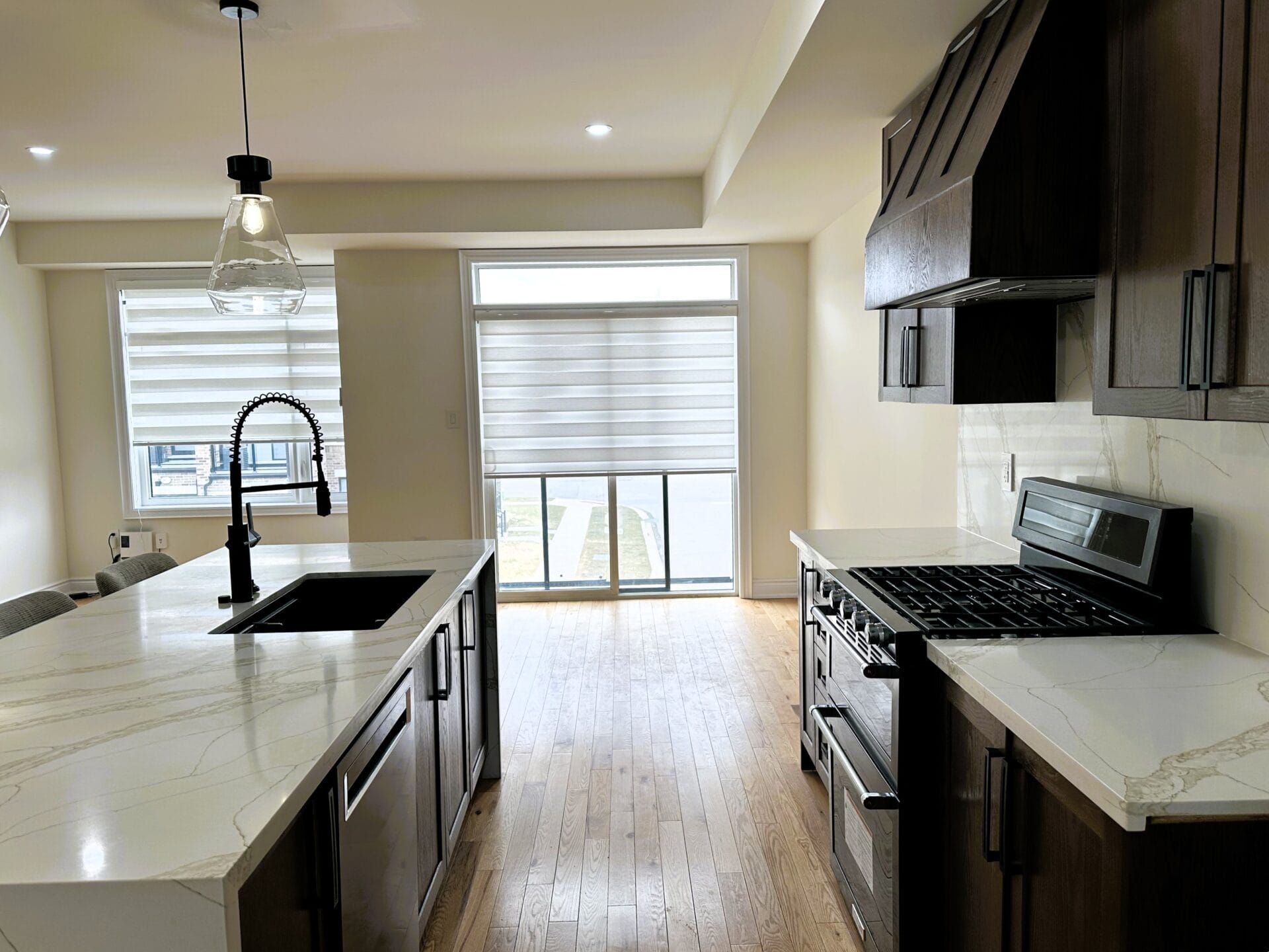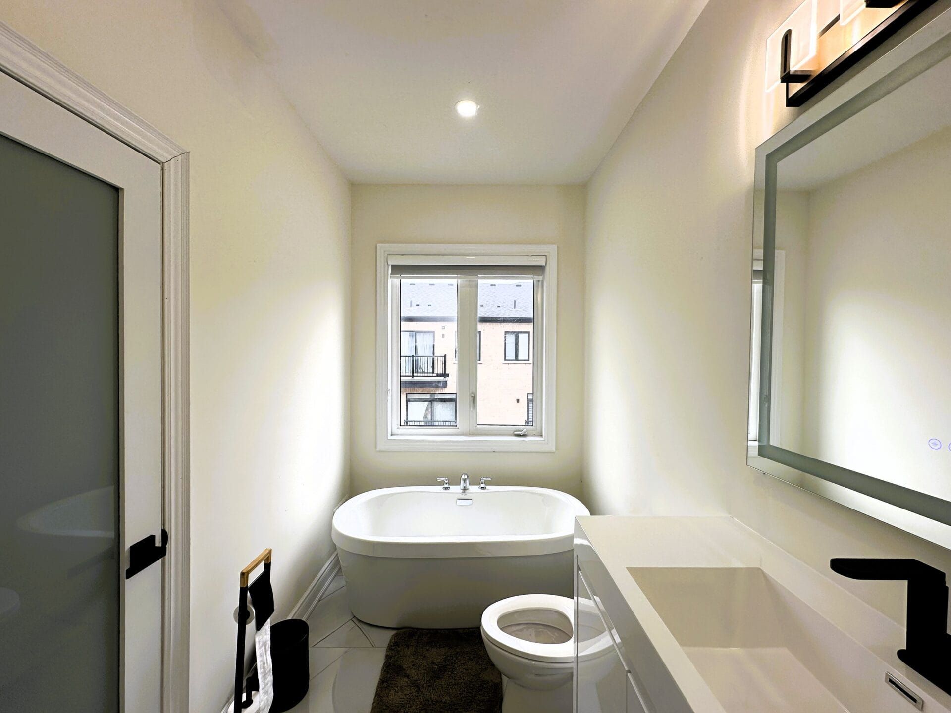 Welcome to this newly built freehold townhouse at 56 tennant circle, woodbridge. Featuring 3 bedrooms+ den and 2. 5 bathrooms across three thoughtfully designed floors, this home combines modern finishes with functional living. The main floor offers a versatile den, perfect for a home office. The second floor features an open-concept kitchen with gas stove, butler's pantry, dining area, living room with mounted electric fireplace, and powder room. Tinted windows and remote-controlled blinds provide privacy and convenience. The ensuite bathroom includes a rainfall shower head, while hardwood floors and a marble foyer elevate the style throughout. The unfinished basement offers ample storage, and the garage comes with a remote opener. Fridge to be installed prior to occupancy. Ideal for families or professionals seeking a move-in-ready home in a vibrant woodbridge neighbourhood with easy access to schools, parks, shopping, and major highways. *for additional property details click the brochure icon below*