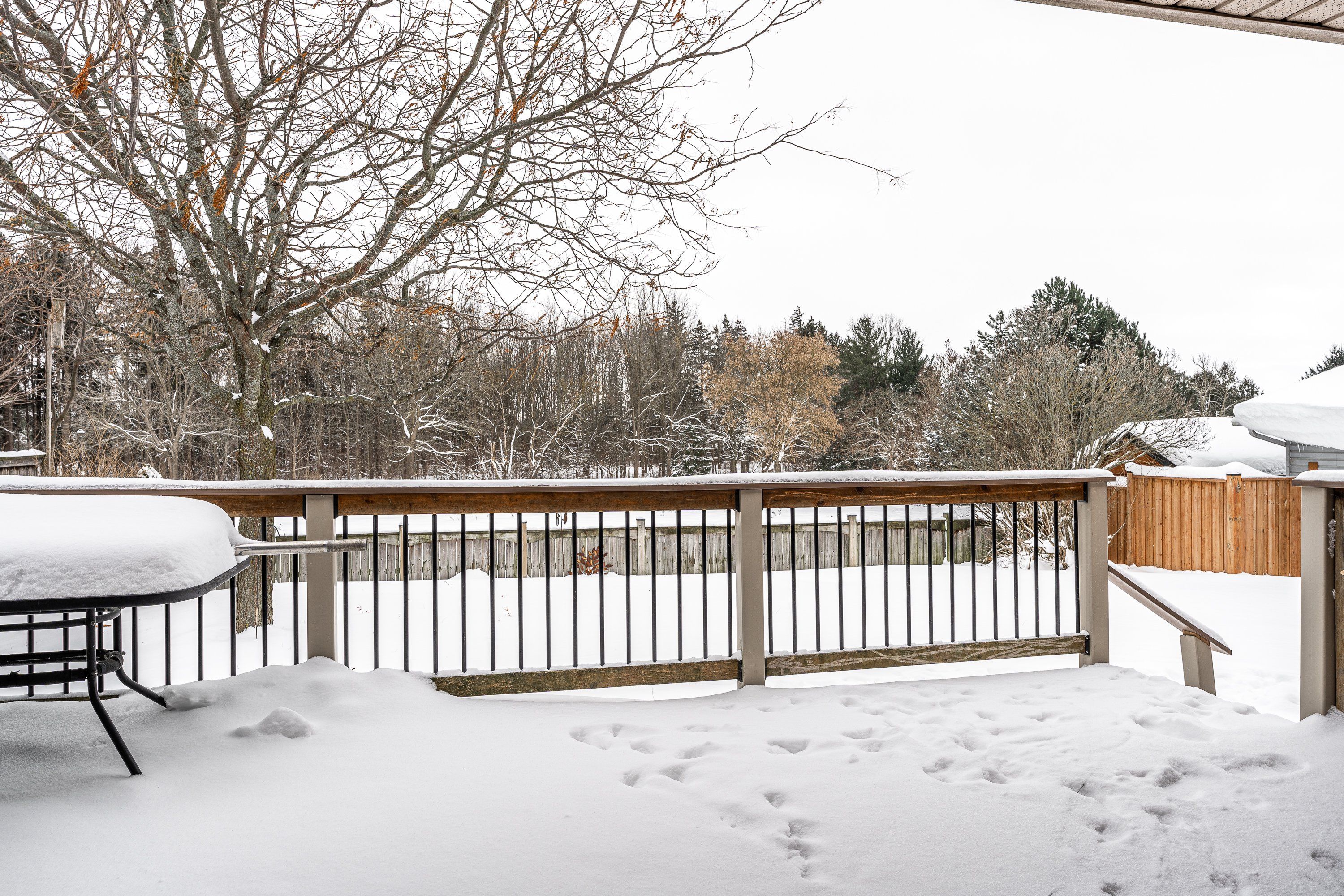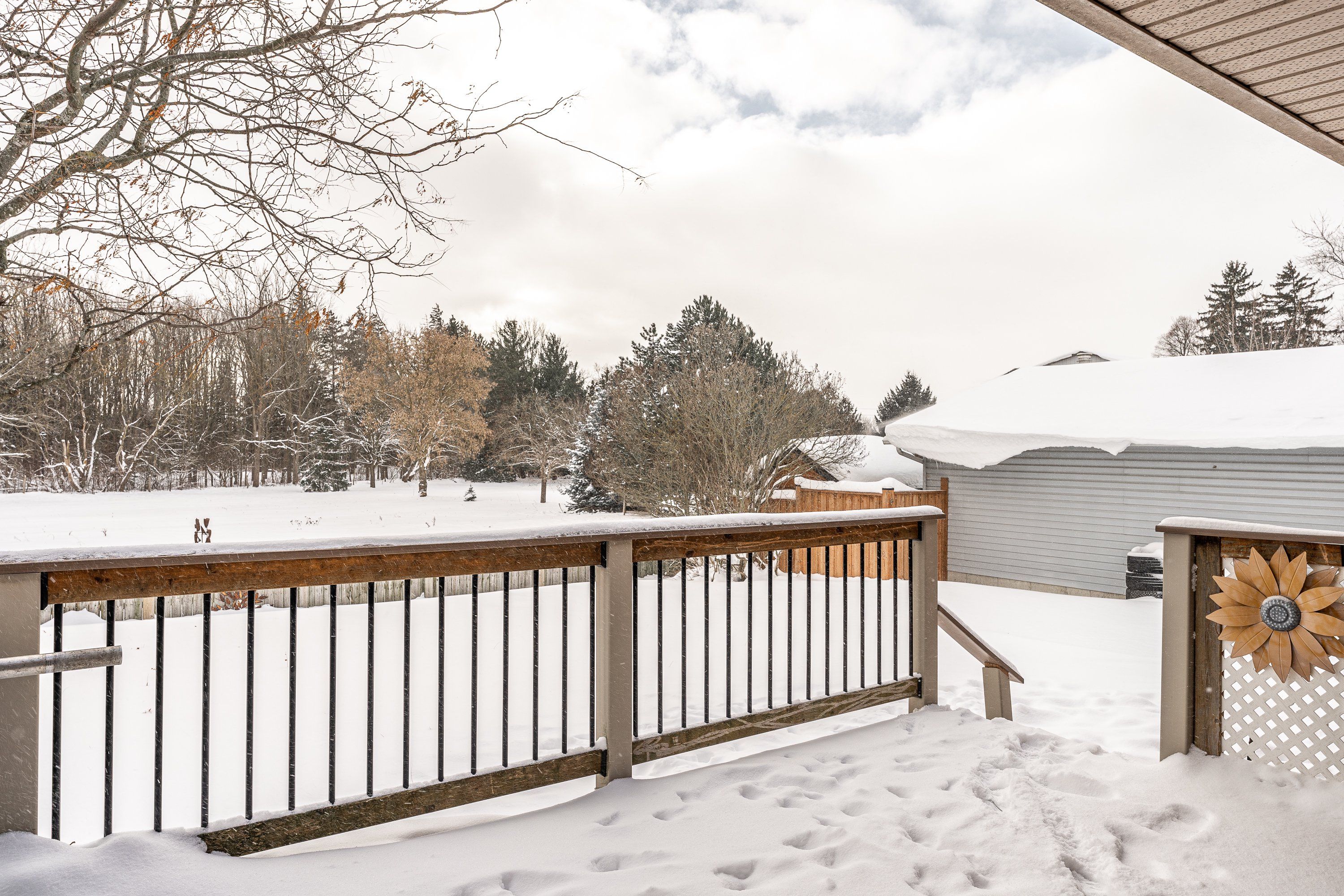 • Partially covered deck overlooking open space, great for relaxation.