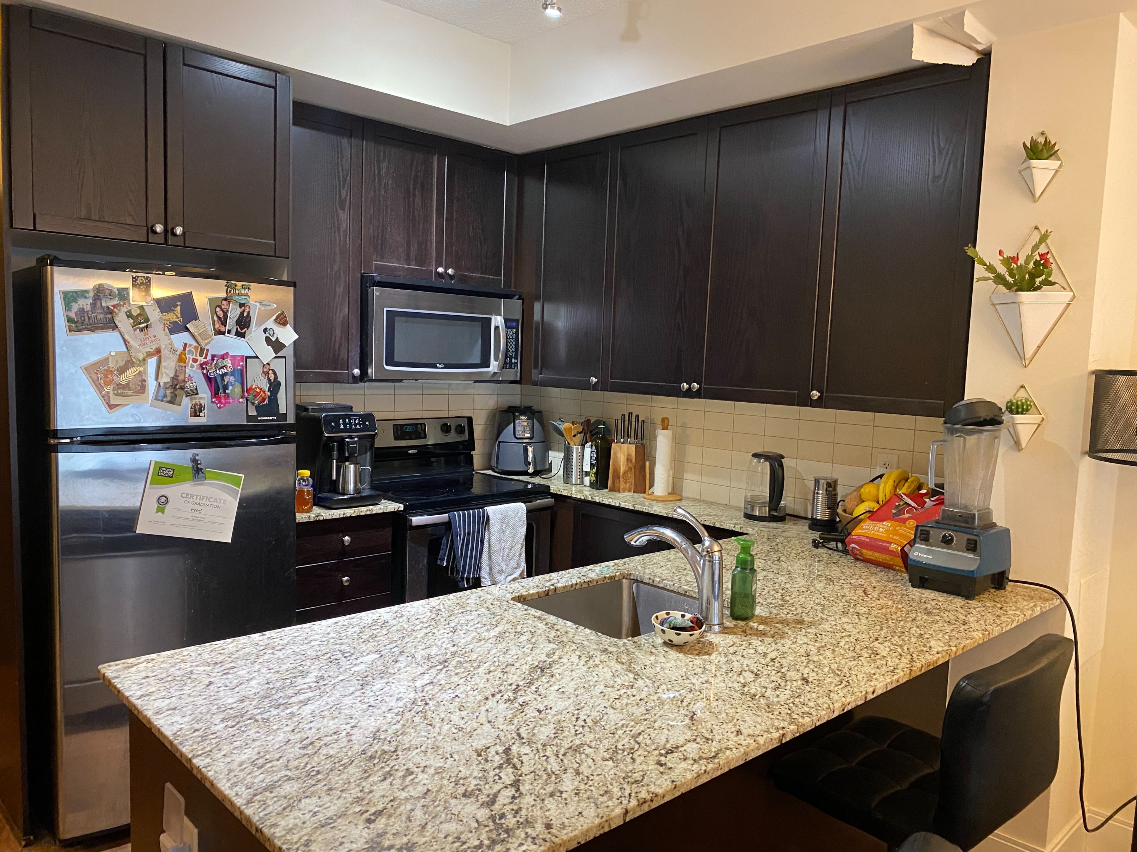 • Modern kitchen with stainless steel appliances and granite countertop.