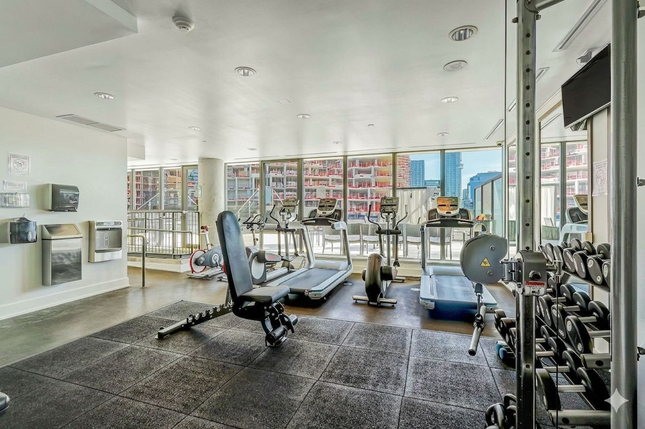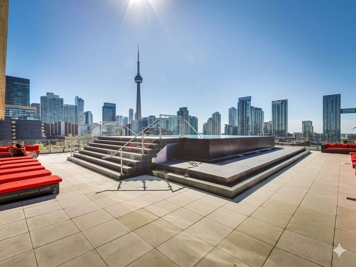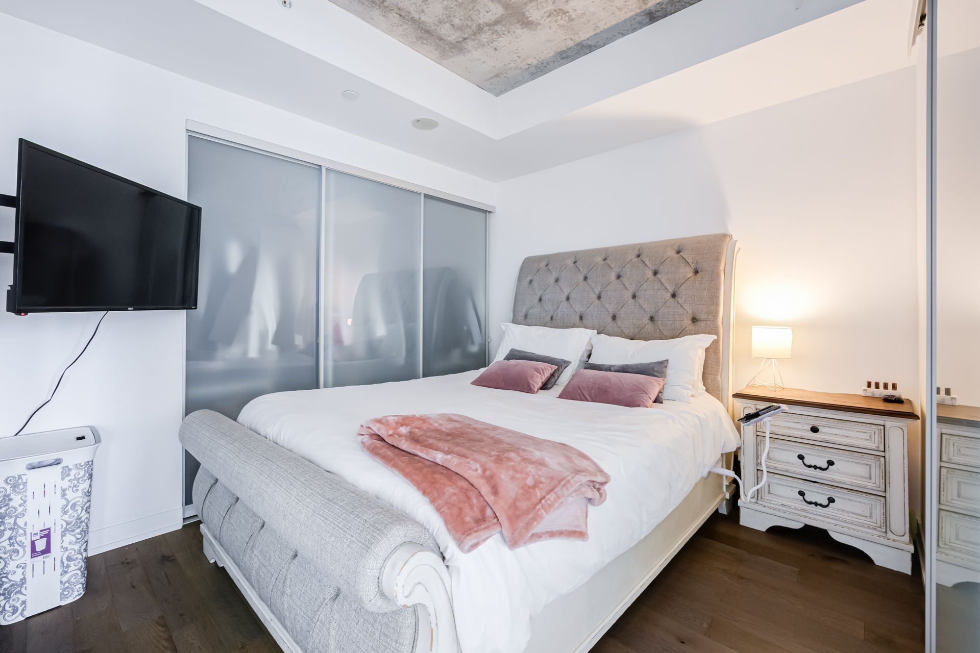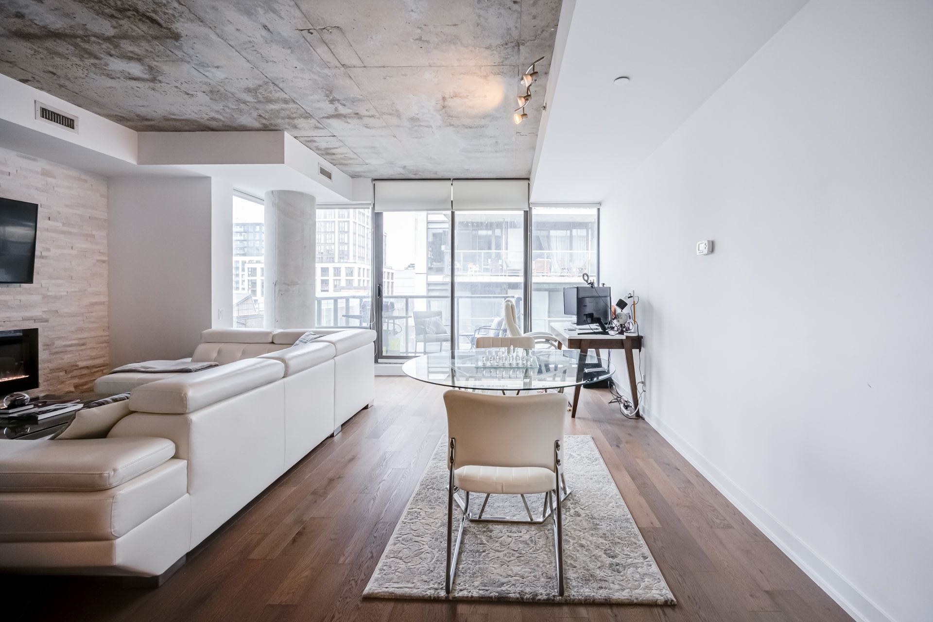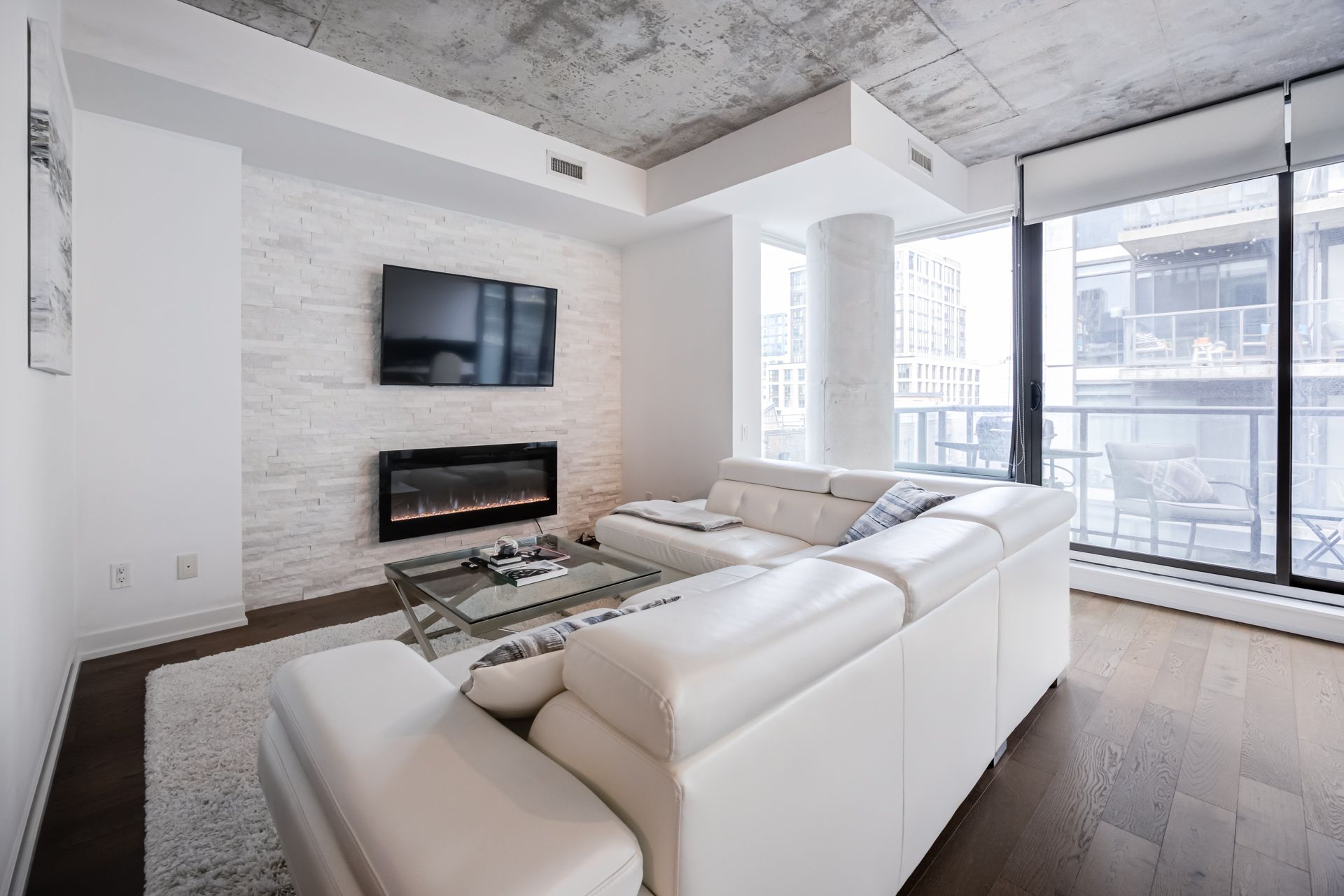 Fully furnished & move-in ready! Experience elevated living at the iconic fashion house in the heart of king west. This designer 1-bedroom corner suite offers 721 sqft and showcases a refined loft aesthetic with 9 ft exposed concrete ceilings, wide-plank hardwood flooring, and a thoughtfully curated interior. The sleek scavolini kitchen features stainless steel appliances, caesarstone countertops, and open shelving, flowing seamlessly into an expansive living and dining space anchored by a stunning feature fireplace wall. Beautifully appointed with premium, high-end modern furnishings, this turnkey residence offers both style and comfort. Floor-to-ceiling windows flood the space with natural light and open to a private balcony with a bbq included-perfect for entertaining or relaxing outdoors. A dedicated work-from-home area adds everyday functionality, while the spacious bedroom and spa-inspired bathroom complete the experience. Residents enjoy world-class amenities including a rooftop infinity pool with skyline views, 24-hour concierge, fitness centre, and stylish lounge spaces. Unbeatable location steps to the well, queen west, top-tier dining, cafés, nightlife, and ttc transit-offering the very best of downtown living.