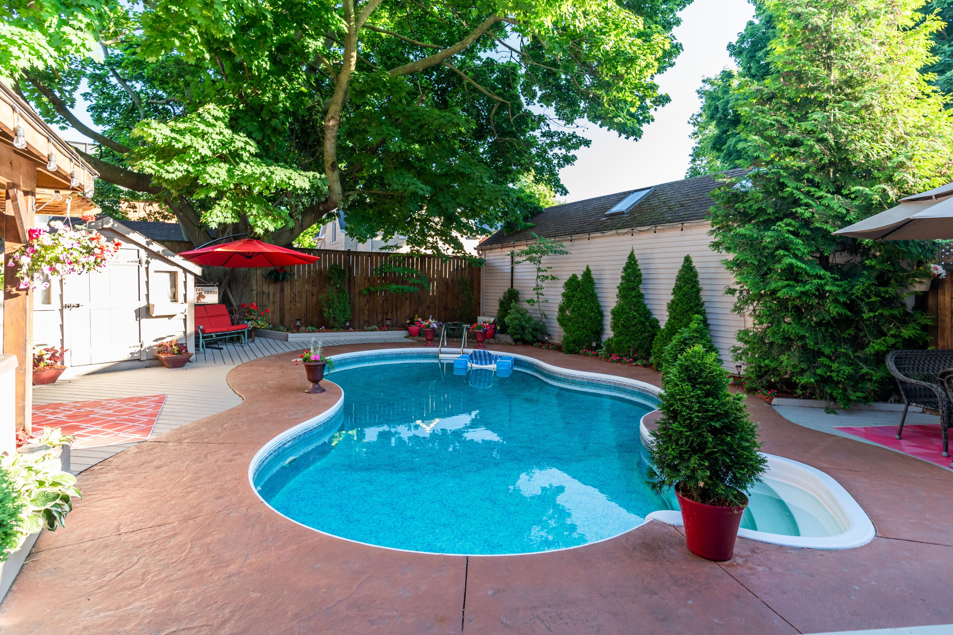 • Private backyard oasis includes a heated saltwater pool and hot tub.