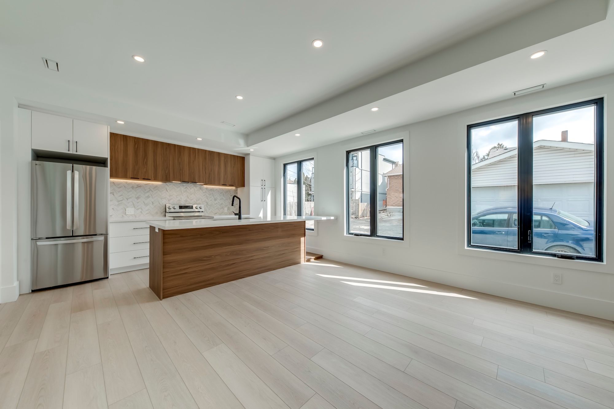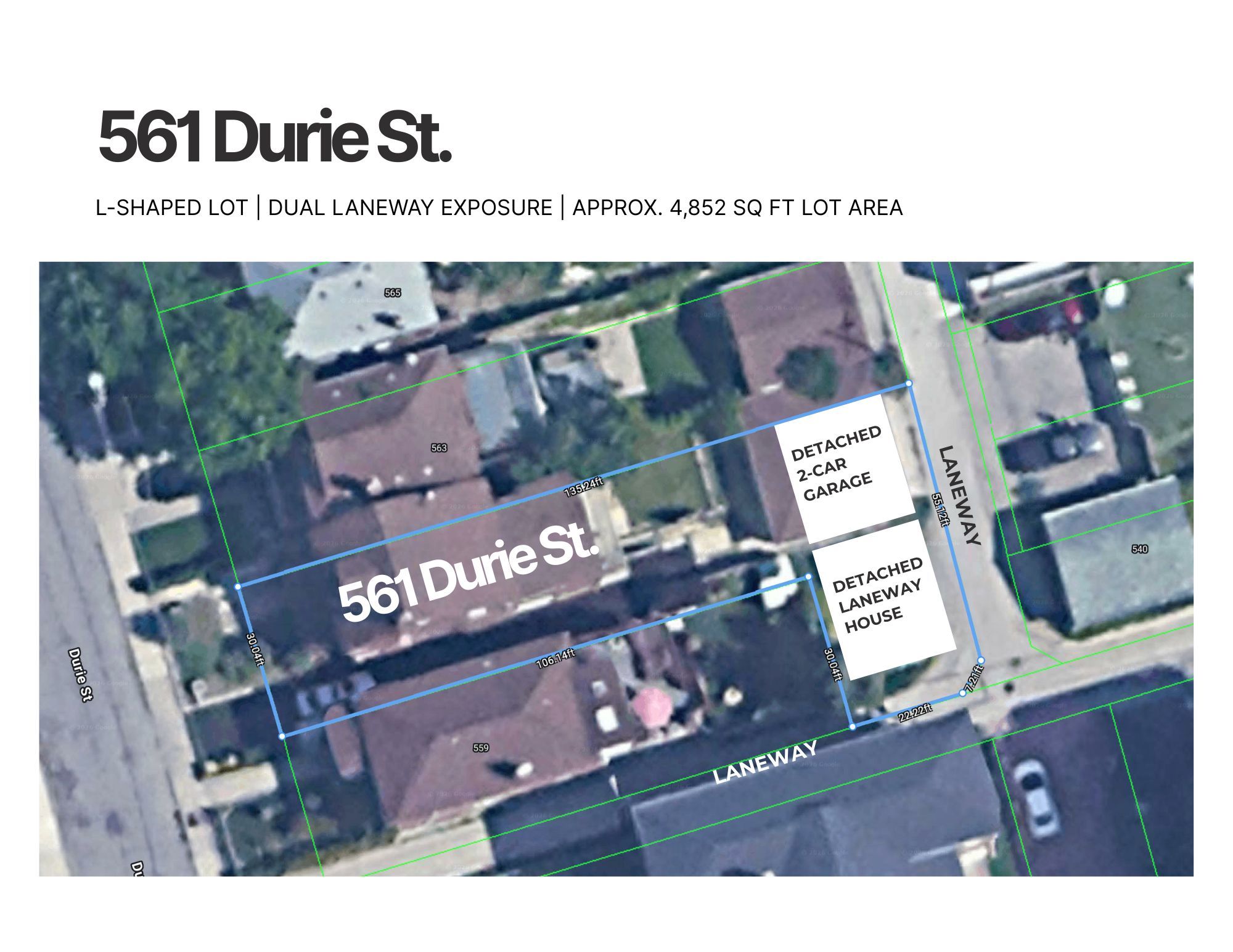 561 durie street is a rare west-end multi-structure property with scale, separation, and real flexibility already built in. Set on an exceptional l-shaped lot with dual laneway exposure, the property includes a 3-storey main residence, a self-contained lower-level suite, a detached 2-storey laneway house, and a detached 2-car garage. 8 bedrooms total, 7 bathrooms total, 3 kitchens, 3 laundry areas, and 4,805 sq ft of total residential area. The main house offers 5 bedrooms and a bright, open interior shaped by large rear glazing, multiple skylights, and a clean glass-railed staircase that carries light through the core of the home. White oak engineered hardwood, carefully integrated built-ins, banquette seating, and a full wall of family-room cabinetry give the house both warmth and structure. The primary retreat features approx. 10. 5-ft ceilings, custom built-ins, dressing area, and a beautifully finished ensuite. The third level adds 2 more bedrooms, a lounge/study, and its own sense of separation for older children, guests, or work-from-home use. The lower level includes a separate entry, kitchen, living area, heated floors, and separate laundry. Privately positioned on the lot, the detached laneway house includes 2 bedrooms, 2 bathrooms, laundry, independent access, and a bright, well-resolved layout that lives more like a small home than a secondary structure. Well suited to multigenerational living, extended family, or buyers seeking integrated supplementary space without giving up privacy. Located in the runnymede-bloor west village area, close to transit, parks, schools, village shops, and the everyday conveniences that support west-end family living.