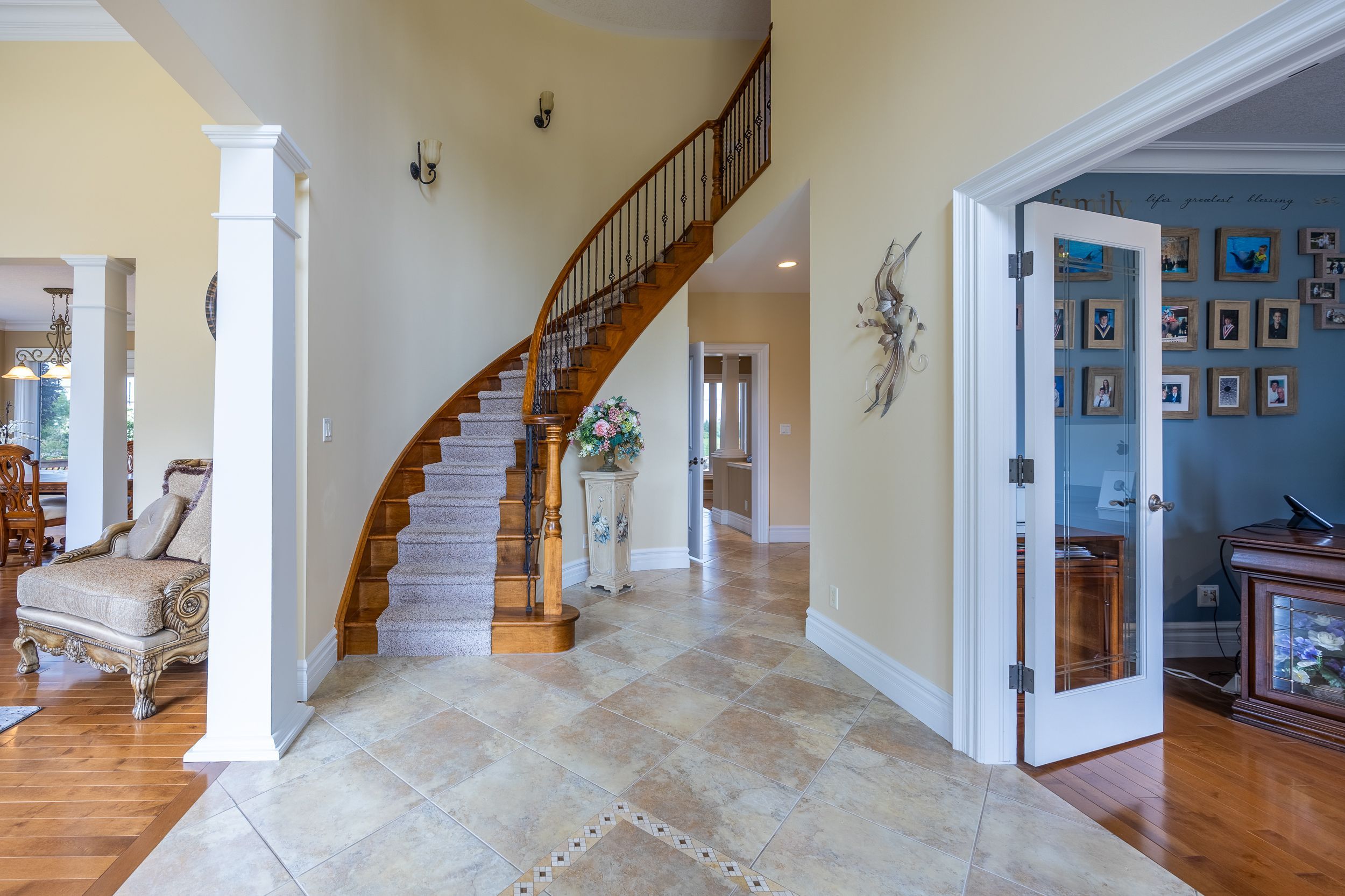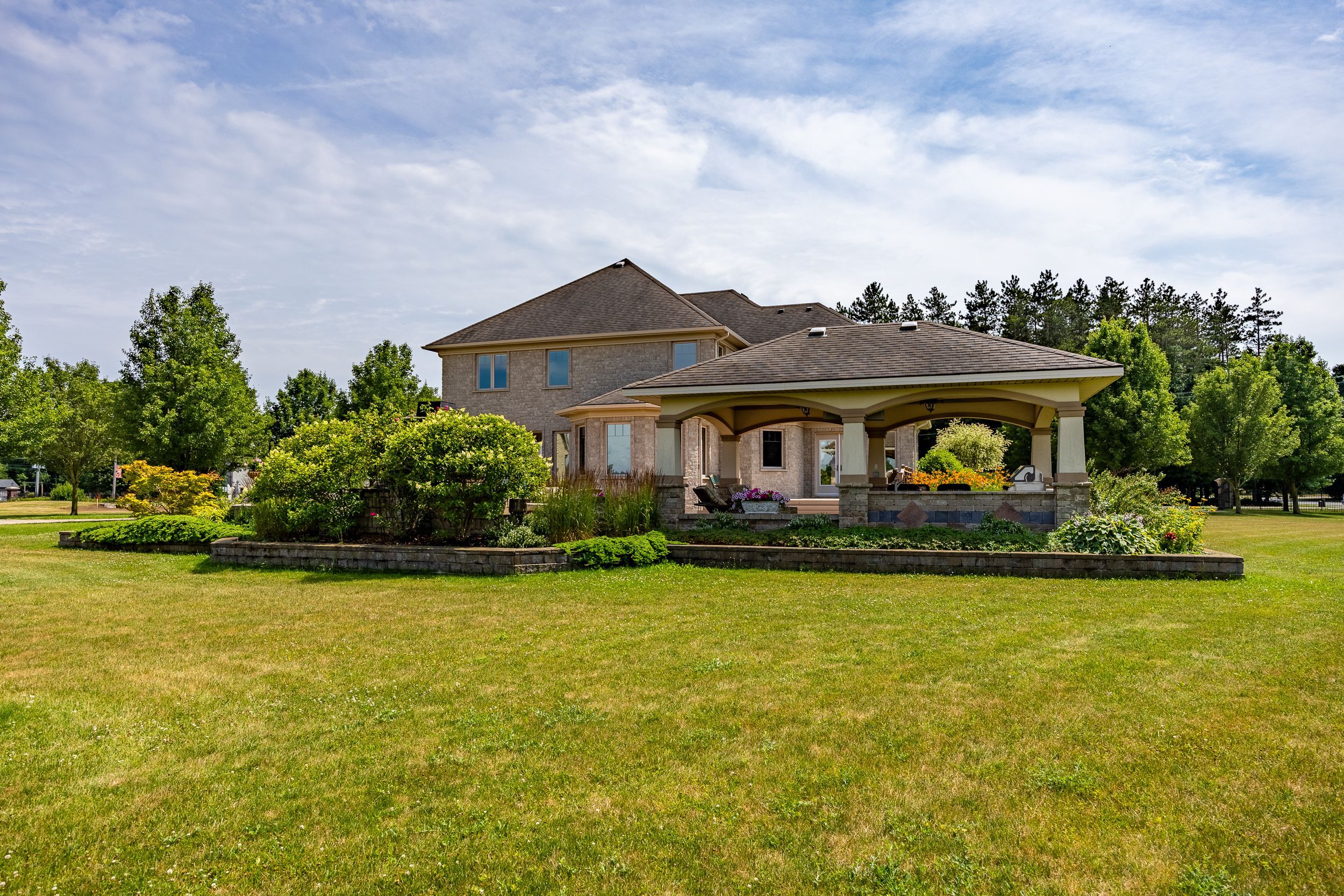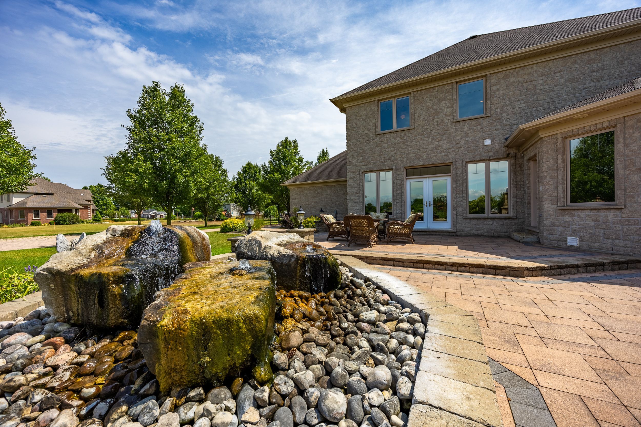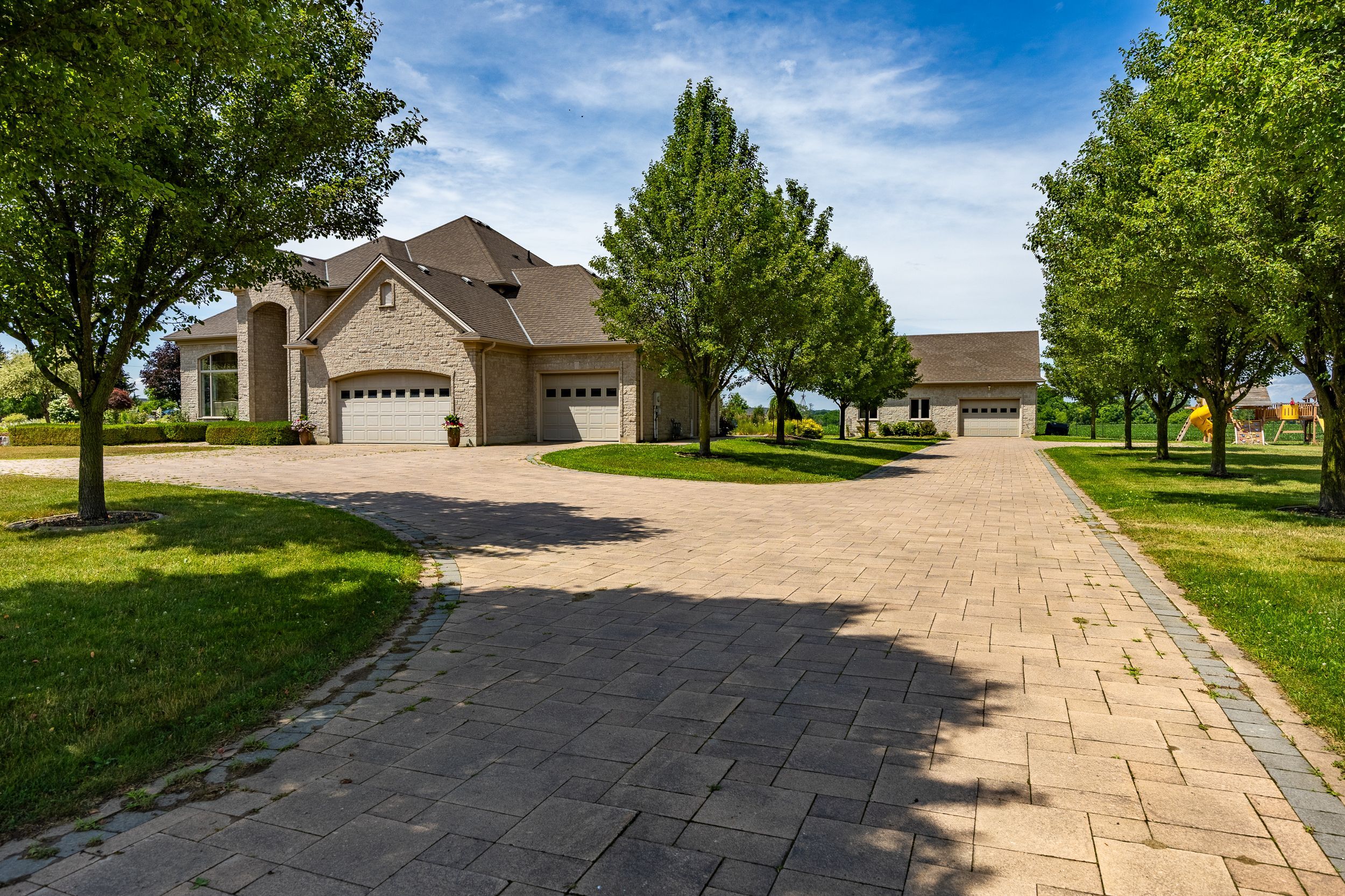 Luxurious estate with outdoor living oasis, dual garages and premier security. Welcome to your dream home. An exquisite estate that perfectly balances luxury, privacy, and everyday functionality. Designed for both families and sophisticated entertaining, this executive home offers spacious, thoughtfully planned living areas. As you enter the grand foyer a striking spiral staircase serves as a dramatic architectural focal point, leading to three generously sized bedrooms and two elegant bathrooms. Two floor-to-ceiling gas fireplaces enhance the ambiance in both the family room and formal living room, providing warmth and style. The formal dining room offers a warm and elegant space for family gatherings and entertaining guests, with room for a large table and decor suited to any occasion. A versatile den/home office provides a quiet and private area, ideal for working from home, studying, or managing daily tasks designed for comfort and productivity in mind. At the heart of the home, the expansive kitchen impresses with built-in appliances, quartz countertops, a walk-in pantry, breakfast bar, and a sun-filled dining area. The lower level boasts heated floors throughout the recreation room, games room, and bathroom ensuring year round comfort. Walk-up from basement to garage. The exterior is equally remarkable, featuring professionally landscaped grounds, a wide circular interlocking brick driveway and a stately brick facade that leaves a lasting first impression. The backyard is designed for connection, with multiple gathering area and a bubbling rock water feature. Water gently bubbles from the tops of three hand-selected stones, creating soothing sounds and a peaceful atmosphere an eye-catching focal point that blends naturally with the surrounding greenery. Enjoy dining in the covered, custom-built outdoor kitchen. The additional detached garage/shop offers extra space for vehicles, workshop or custom storage solutions.