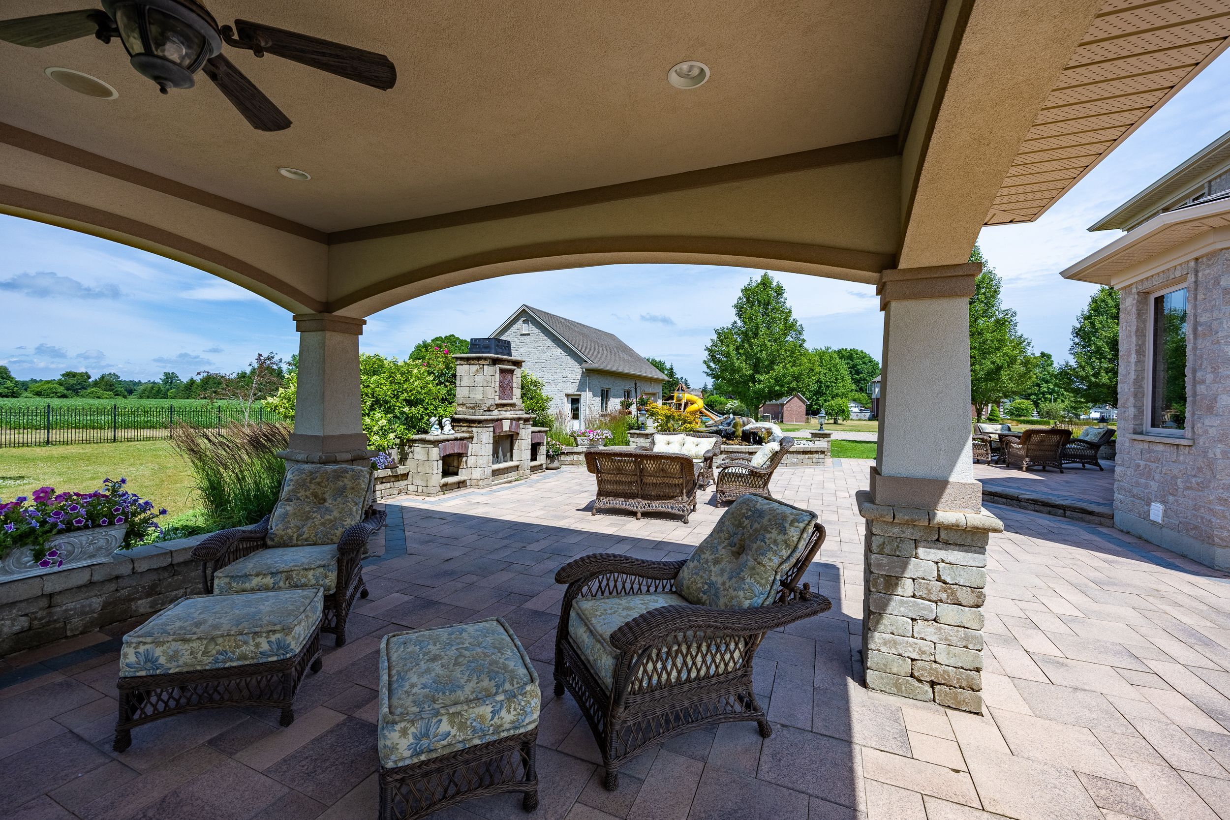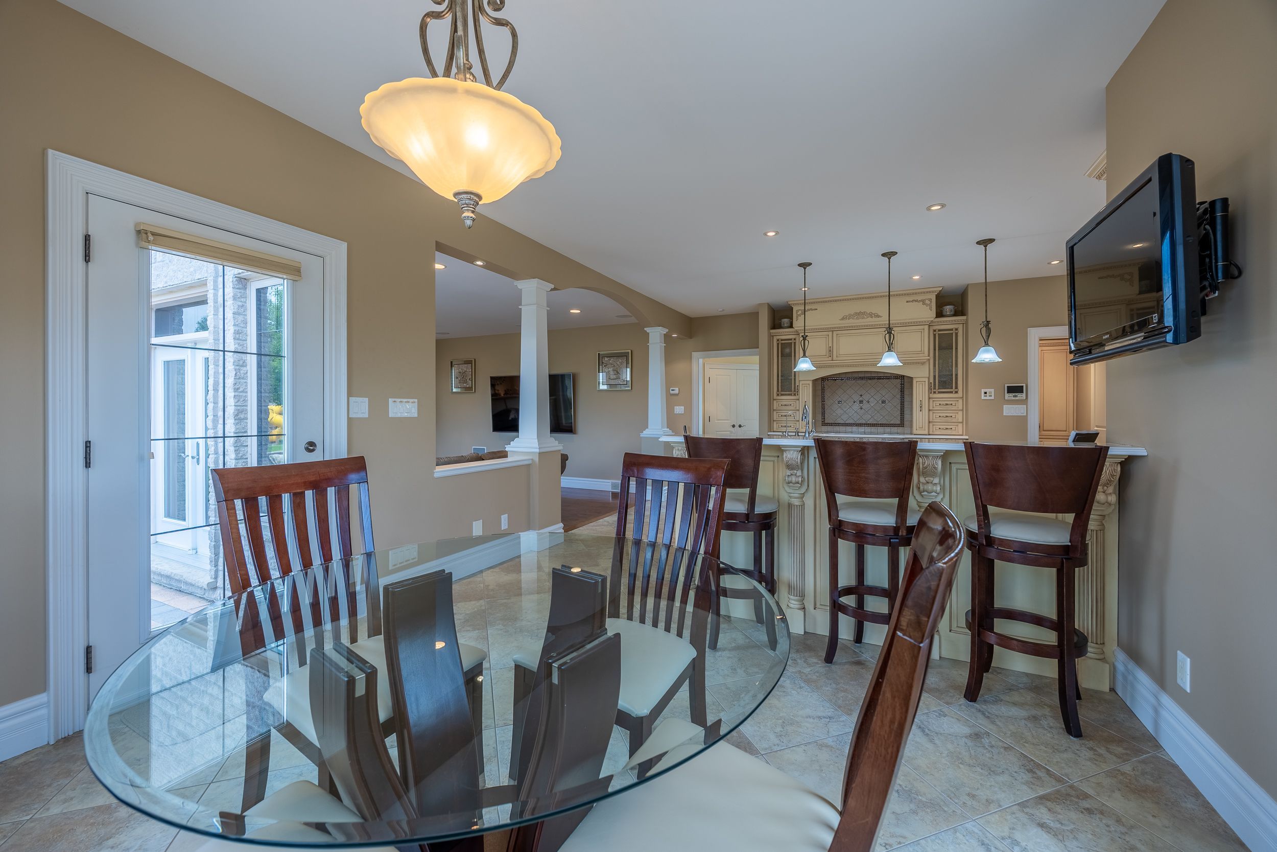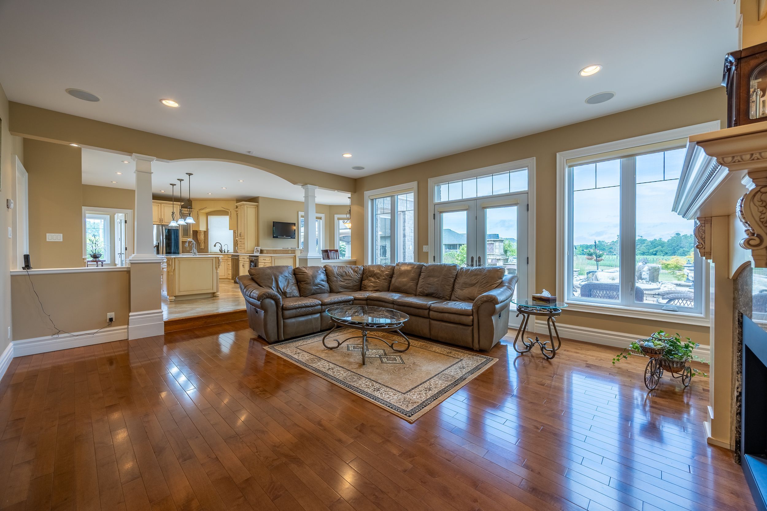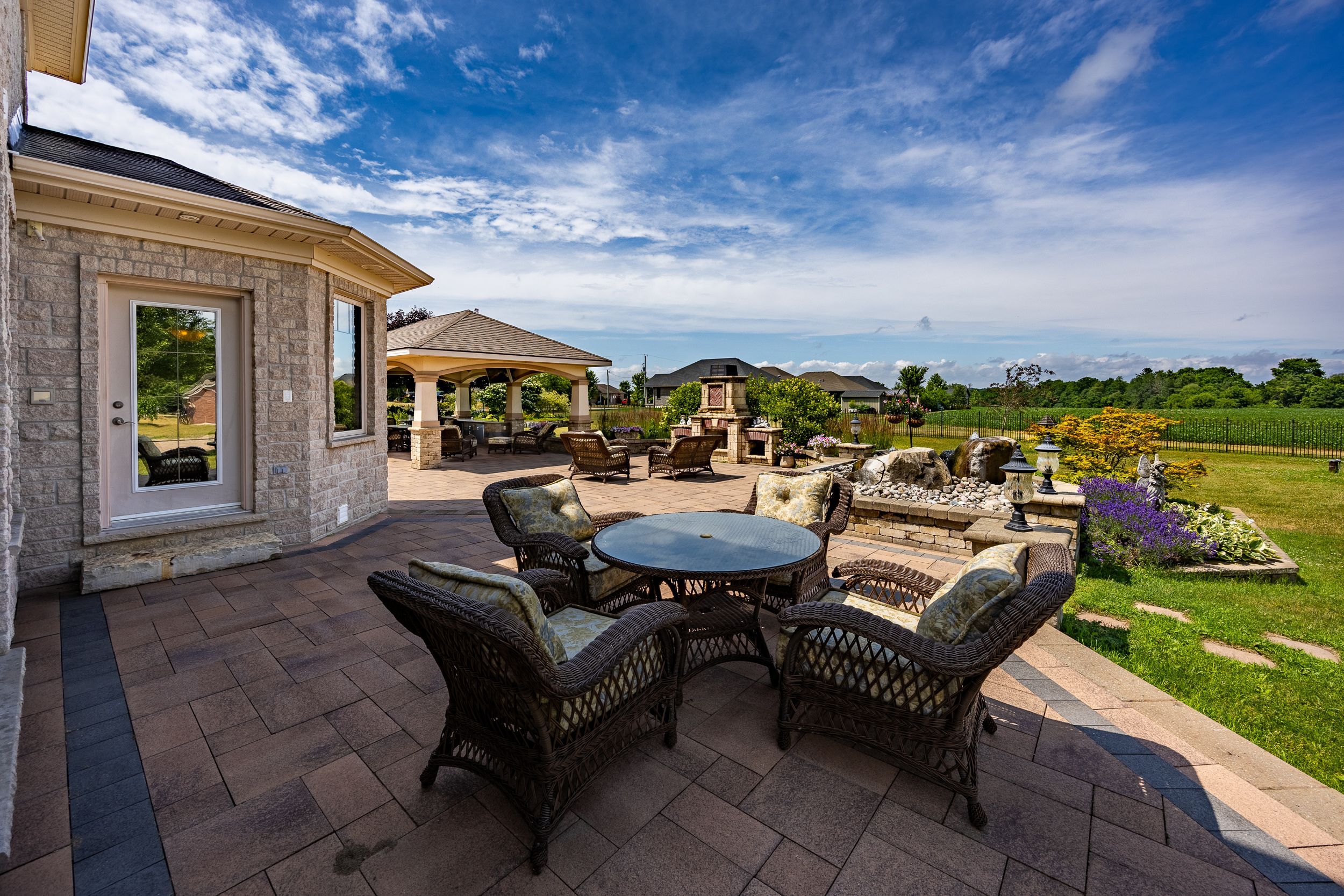 Luxurious estate with outdoor living oasis, dual garages and premier security. Welcome to your dream home. An exquisite estate that perfectly balances luxury, privacy, and everyday functionality. Designed for both families and sophisticated entertaining, this executive home offers spacious, thoughtfully planned living areas. As you enter the grand foyer a striking spiral staircase serves as a dramatic architectural focal point, leading to three generously sized bedrooms and two elegant bathrooms. Two floor-to-ceiling gas fireplaces enhance the ambiance in both the family room and formal living room, providing warmth and style. The formal dining room offers a warm and elegant space for family gatherings and entertaining guests, with room for a large table and decor suited to any occasion. A versatile den/home office provides a quiet and private area, ideal for working from home, studying, or managing daily tasks designed for comfort and productivity in mind. At the heart of the home, the expansive kitchen impresses with built-in appliances, quartz countertops, a walk-in pantry, breakfast bar, and a sun-filled dining area. The lower level boasts heated floors throughout the recreation room, games room, and bathroom ensuring year round comfort. Walk-up from basement to garage. The exterior is equally remarkable, featuring professionally landscaped grounds, a wide circular interlocking brick driveway and a stately brick facade that leaves a lasting first impression. The backyard is designed for connection, with multiple gathering area and a bubbling rock water feature. Water gently bubbles from the tops of three hand-selected stones, creating soothing sounds and a peaceful atmosphere an eye-catching focal point that blends naturally with the surrounding greenery. Enjoy dining in the covered, custom-built outdoor kitchen. The additional detached garage/shop offers extra space for vehicles, workshop or custom storage solutions.