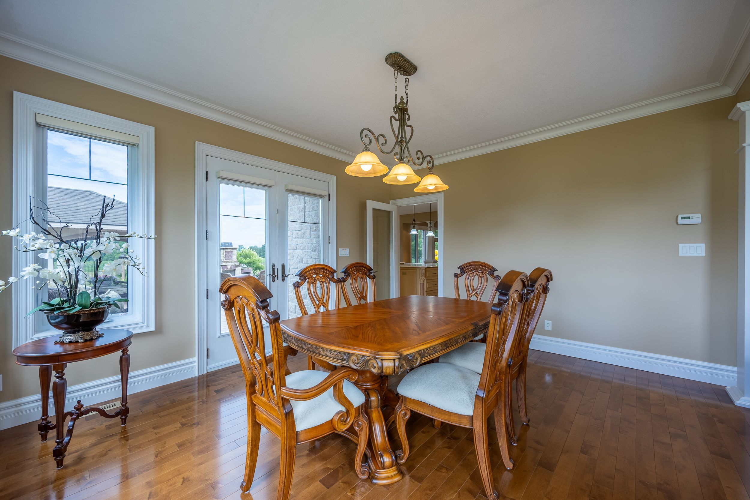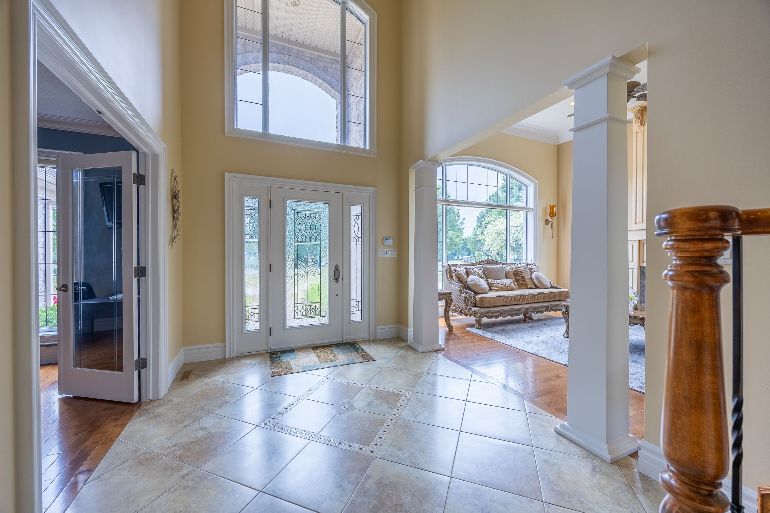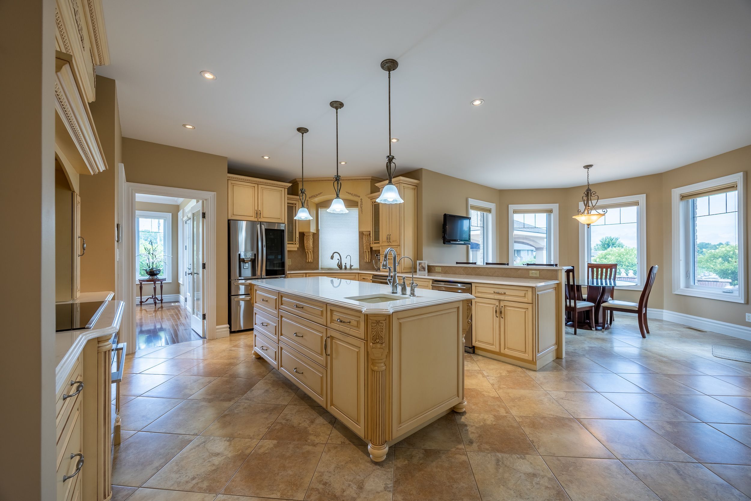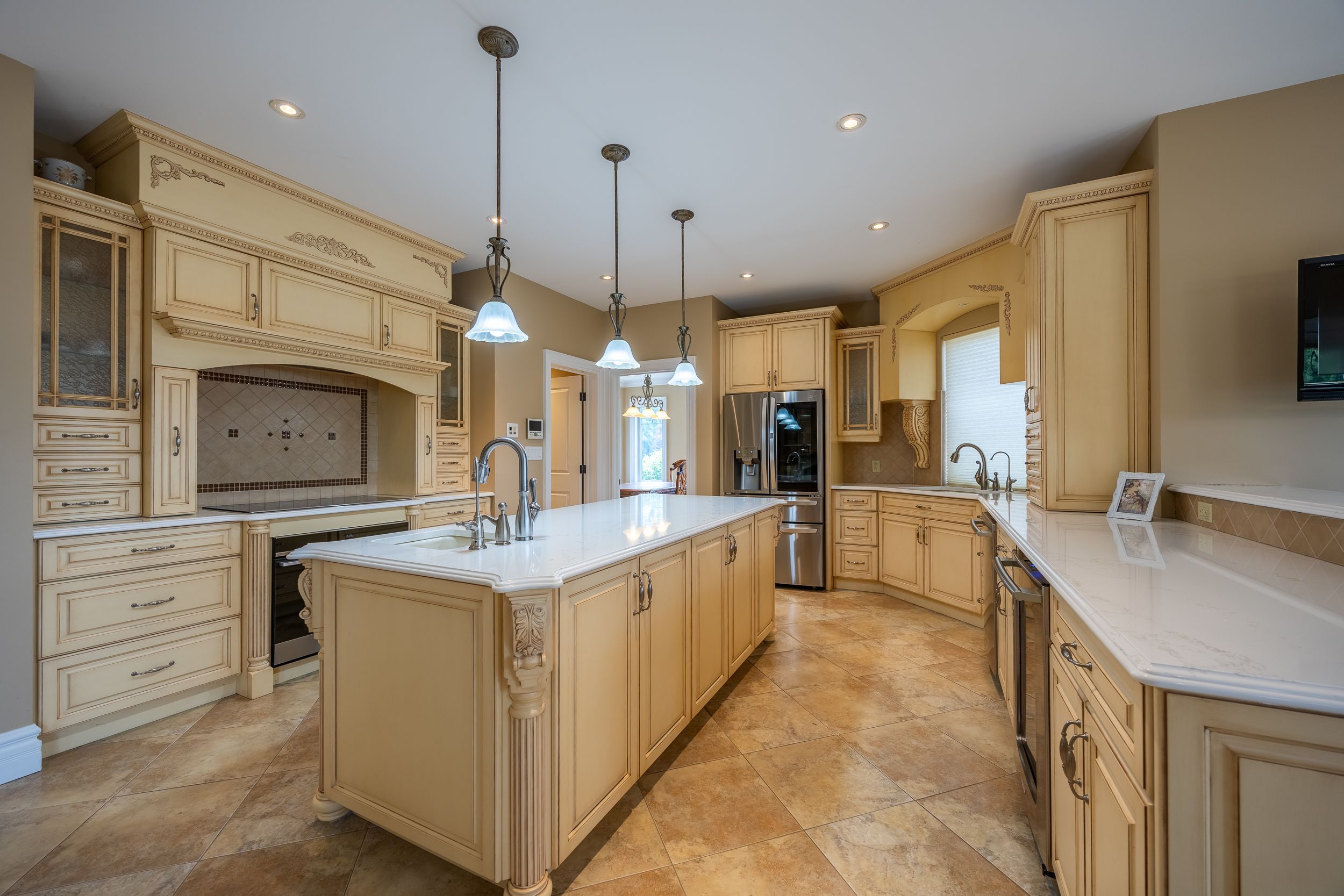 Luxurious estate with outdoor living oasis, dual garages and premier security. Welcome to your dream home. An exquisite estate that perfectly balances luxury, privacy, and everyday functionality. Designed for both families and sophisticated entertaining, this executive home offers spacious, thoughtfully planned living areas. As you enter the grand foyer a striking spiral staircase serves as a dramatic architectural focal point, leading to three generously sized bedrooms and two elegant bathrooms. Two floor-to-ceiling gas fireplaces enhance the ambiance in both the family room and formal living room, providing warmth and style. The formal dining room offers a warm and elegant space for family gatherings and entertaining guests, with room for a large table and decor suited to any occasion. A versatile den/home office provides a quiet and private area, ideal for working from home, studying, or managing daily tasks designed for comfort and productivity in mind. At the heart of the home, the expansive kitchen impresses with built-in appliances, quartz countertops, a walk-in pantry, breakfast bar, and a sun-filled dining area. The lower level boasts heated floors throughout the recreation room, games room, and bathroom ensuring year round comfort. Walk-up from basement to garage. The exterior is equally remarkable, featuring professionally landscaped grounds, a wide circular interlocking brick driveway and a stately brick facade that leaves a lasting first impression. The backyard is designed for connection, with multiple gathering area and a bubbling rock water feature. Water gently bubbles from the tops of three hand-selected stones, creating soothing sounds and a peaceful atmosphere an eye-catching focal point that blends naturally with the surrounding greenery. Enjoy dining in the covered, custom-built outdoor kitchen. The additional detached garage/shop offers extra space for vehicles, workshop or custom storage solutions.