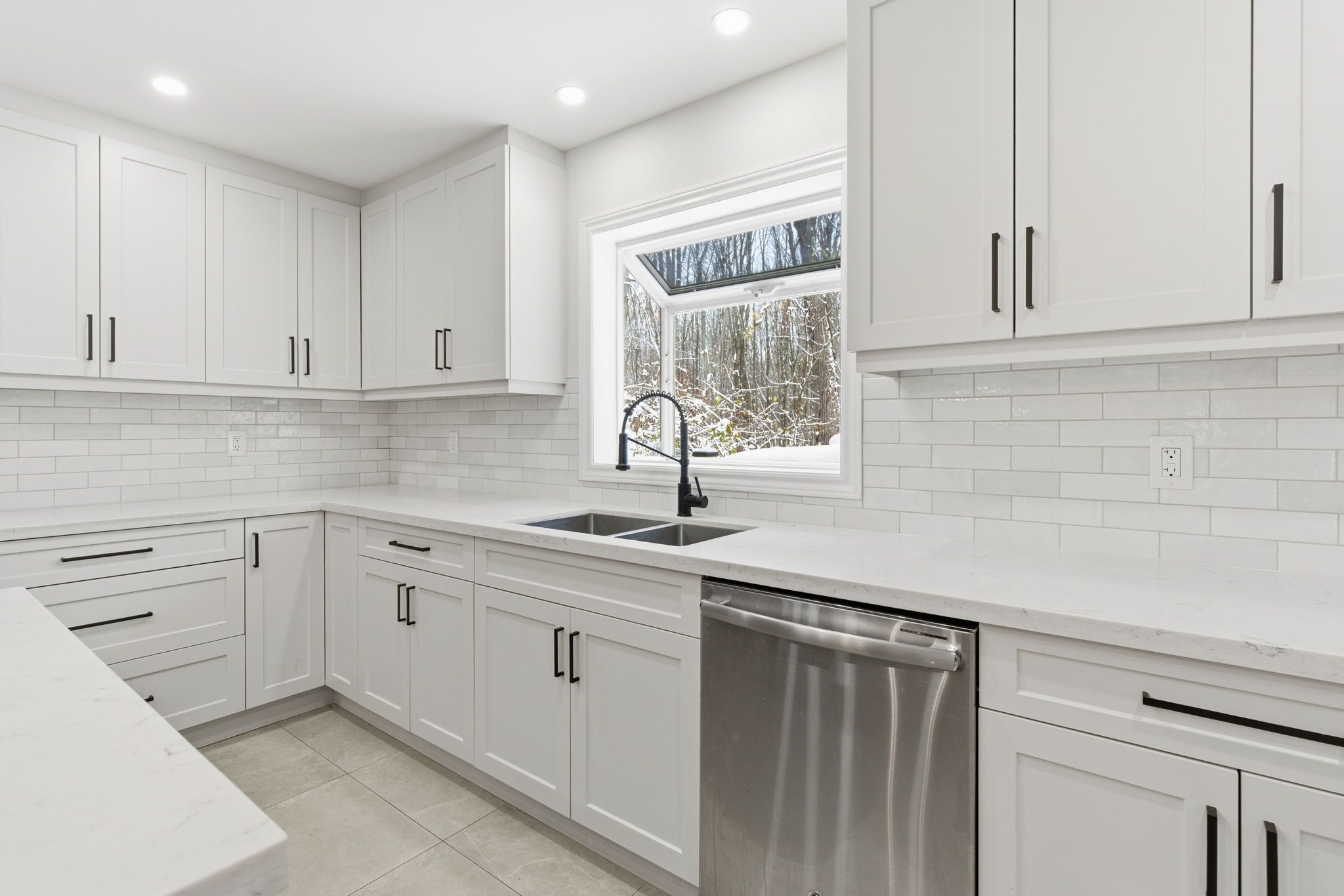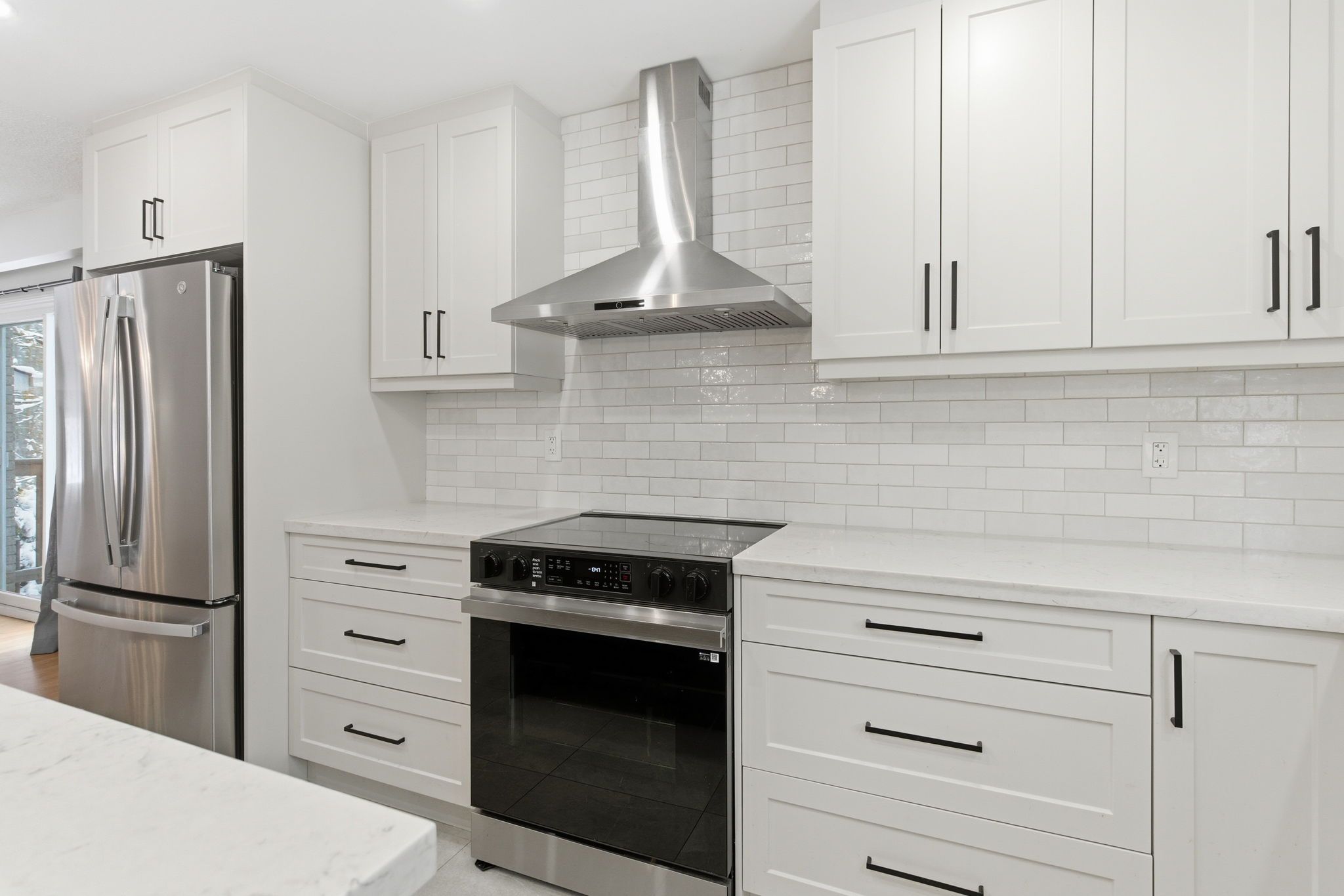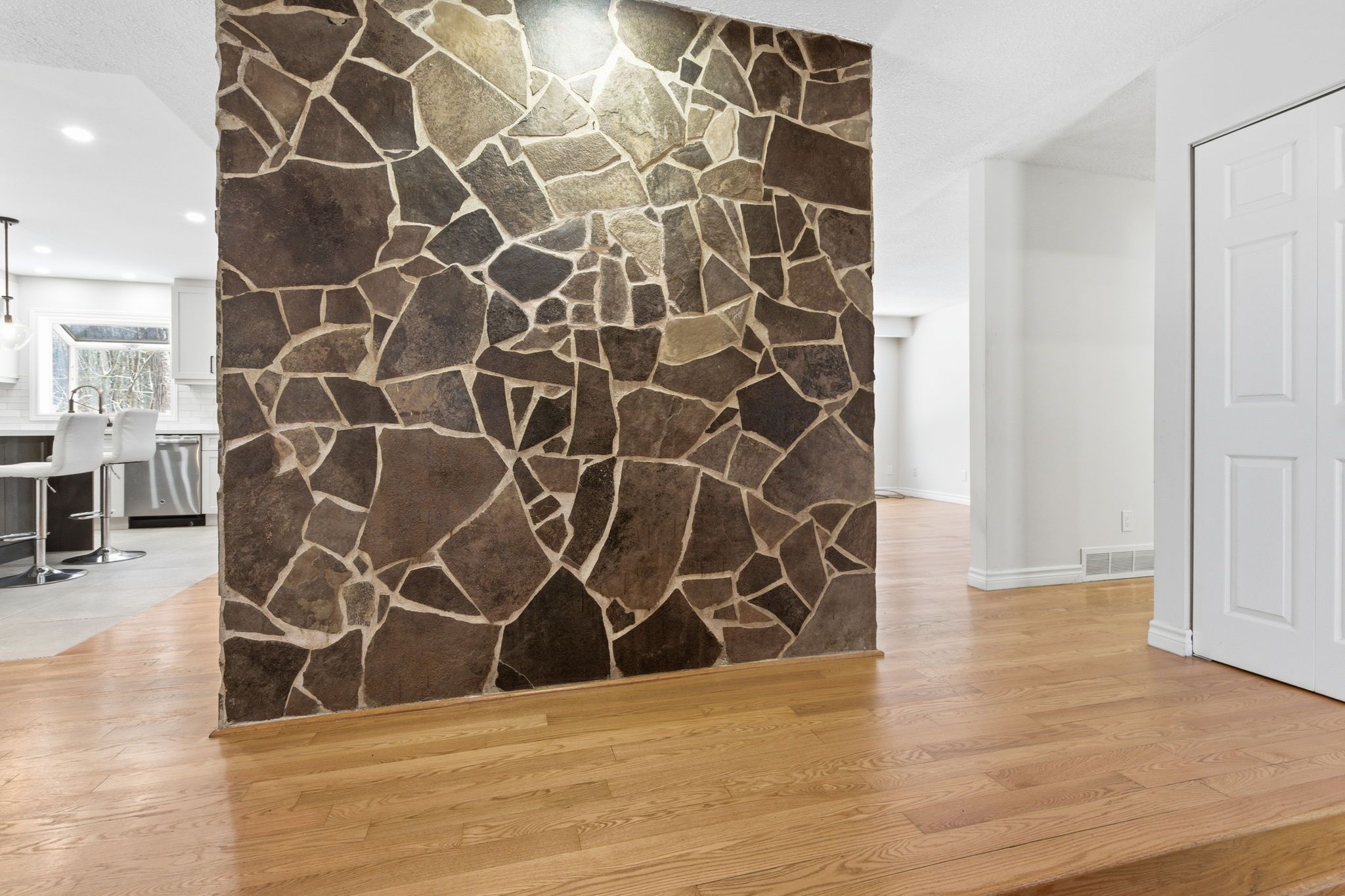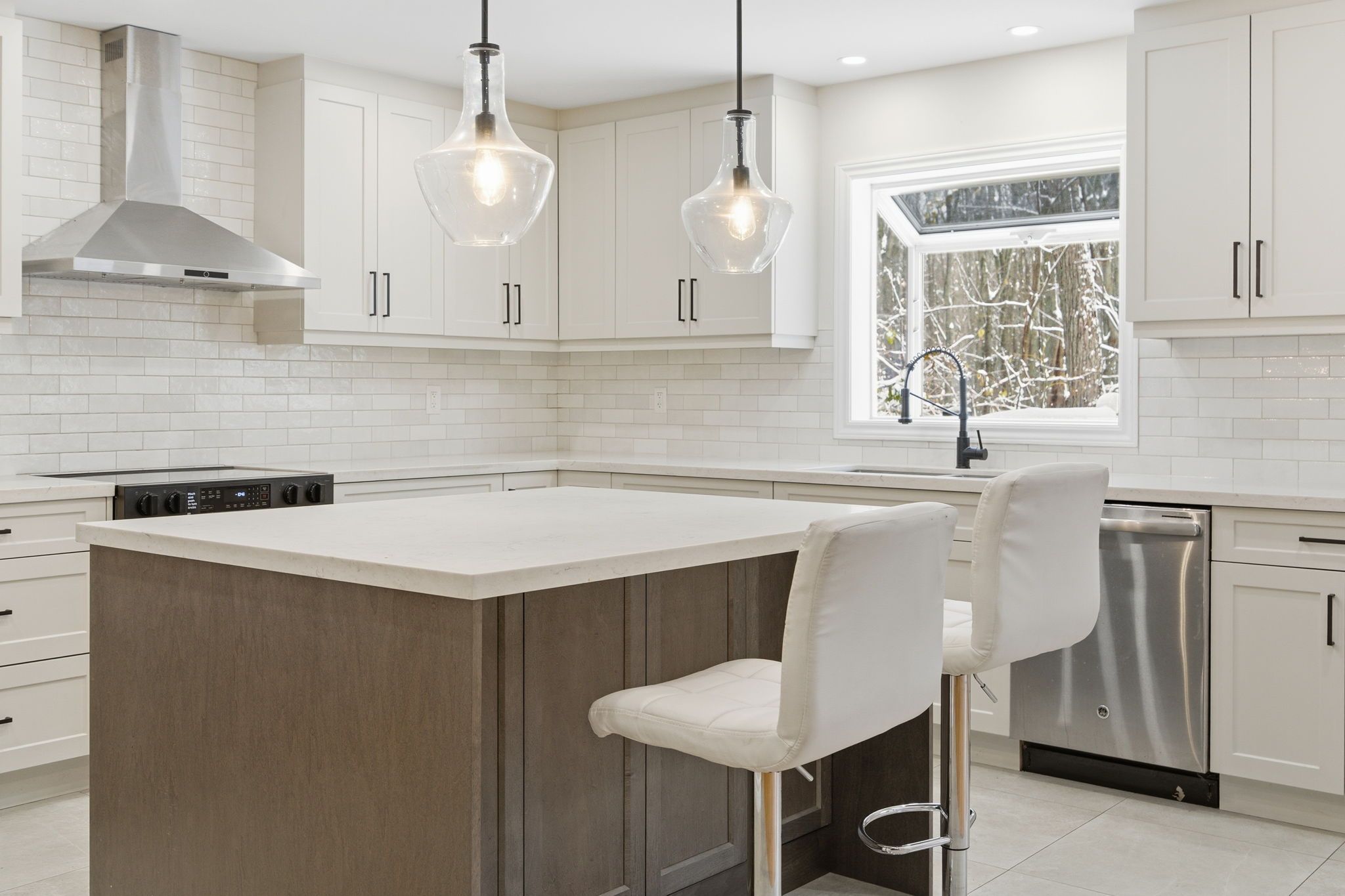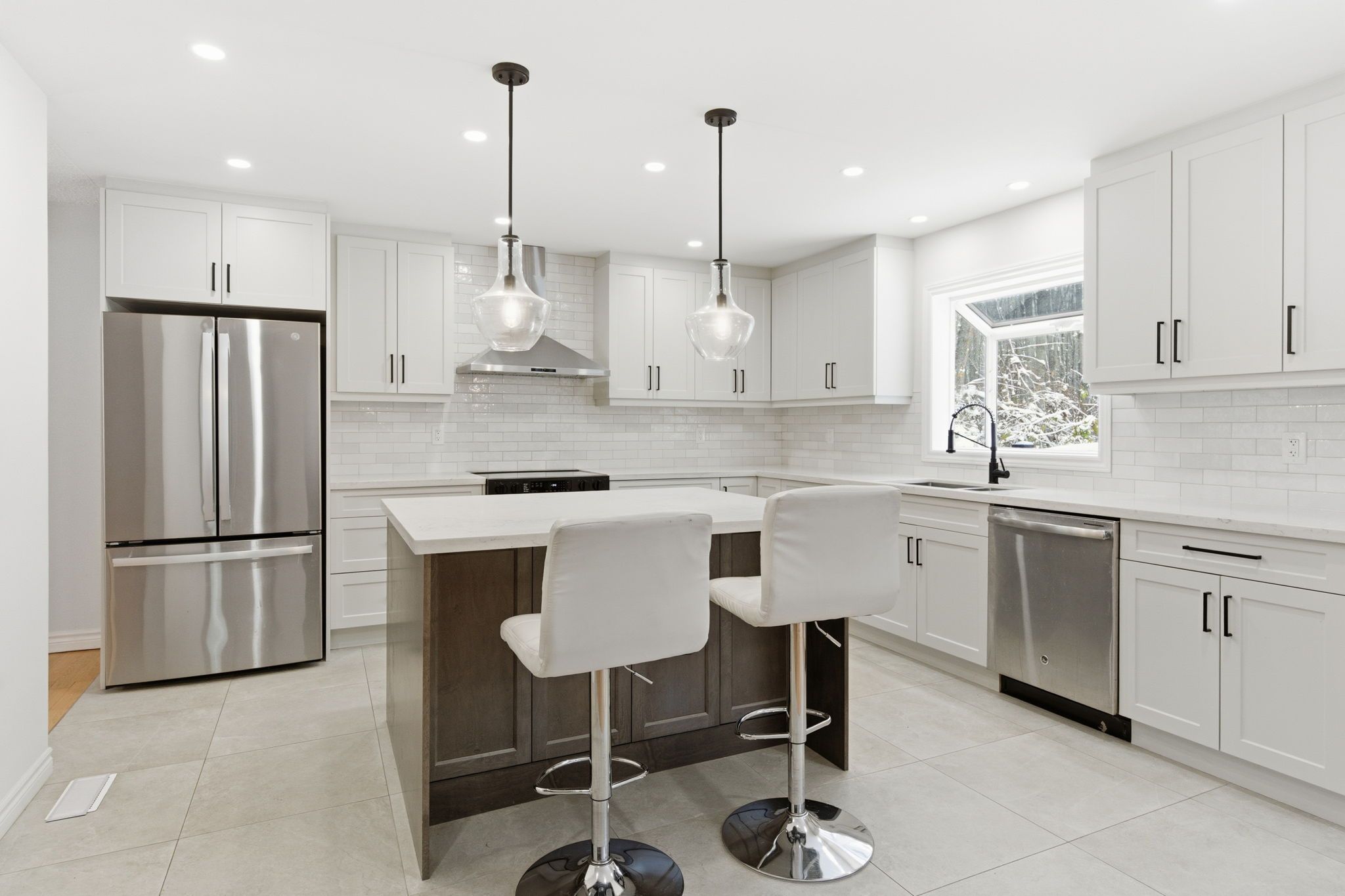 • Updated kitchen with a large island and stainless steel appliances.
