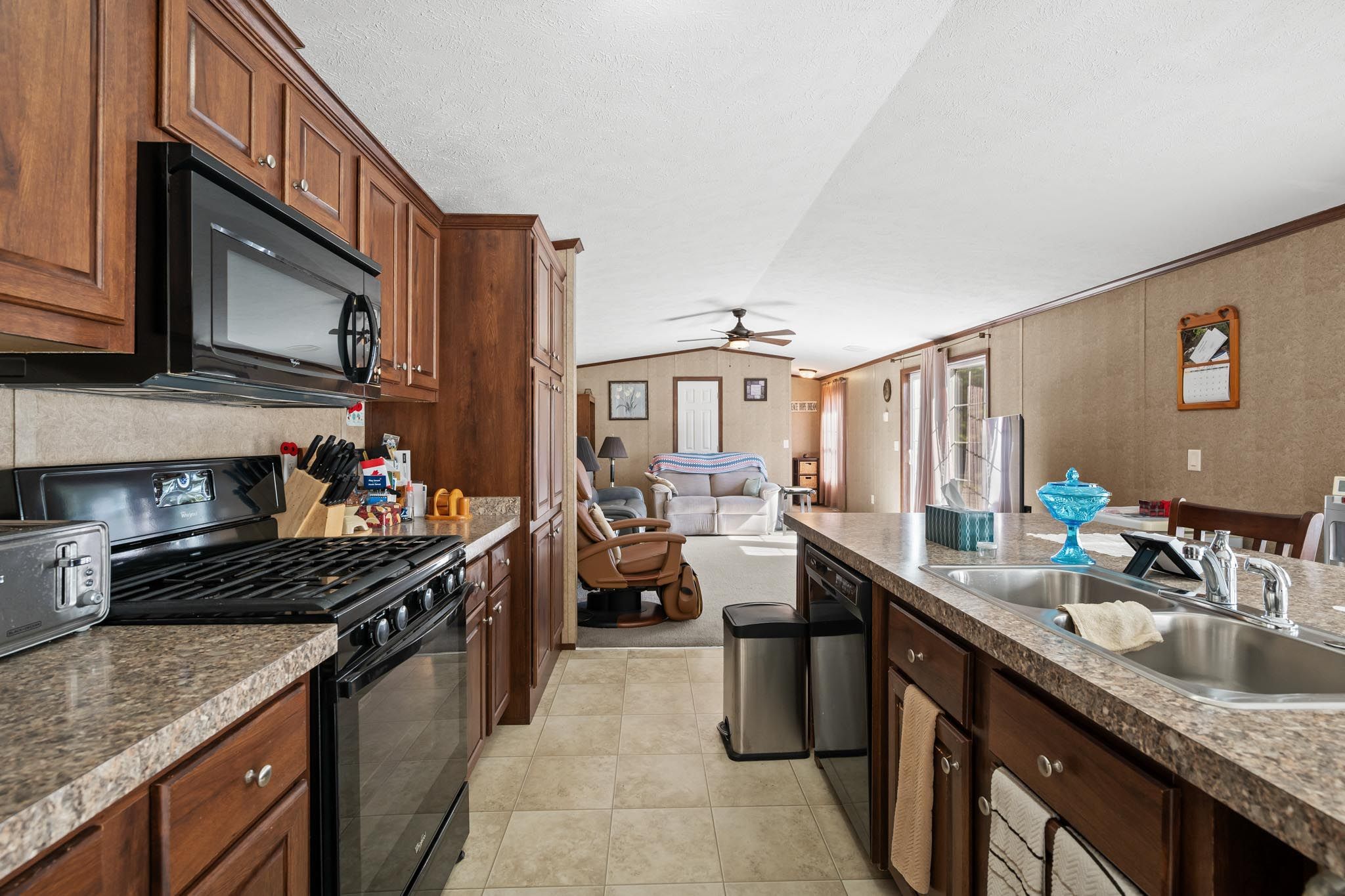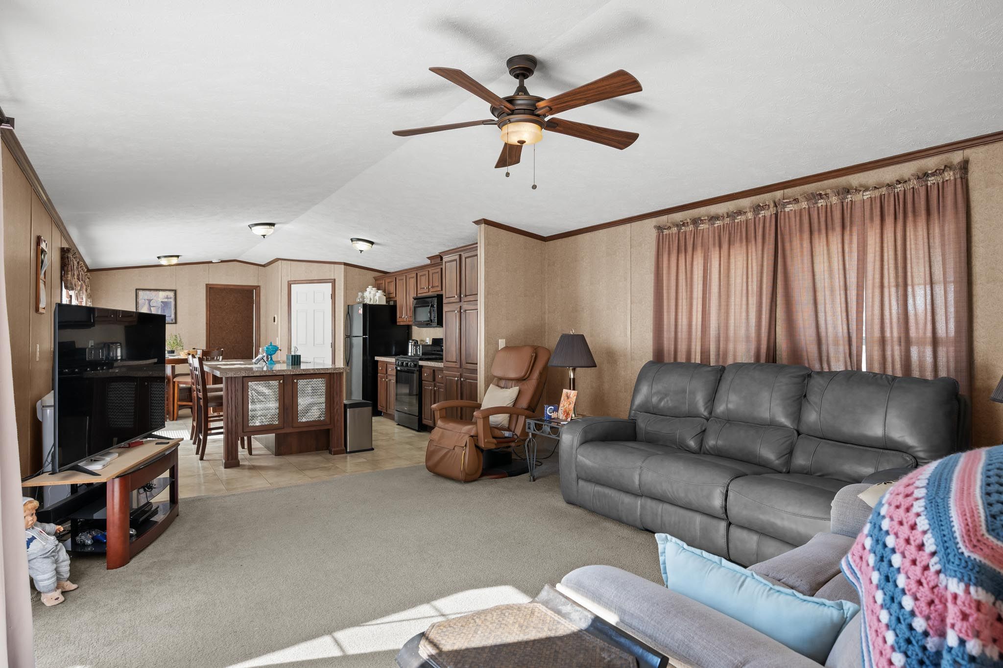 Set in a quiet, elevated location within a well-kept land-leased community, this modern 80 x 16 mobile home offers comfortable, low-maintenance living surrounded by nature. Designed for ease and functionality, the open-concept layout seamlessly blends the living room, kitchen, and dining area, perfect for both daily living and entertaining. The kitchen features rich cabinetry, a large center island, and ample storage space, creating a warm and inviting hub of the home. With two generously sized bedrooms thoughtfully placed at opposite ends, you'll enjoy maximum privacy. The spacious primary suite includes a luxurious ensuite with a deep soaker tub, while a second full bath conveniently serves guests and the second bedroom. Step outside to a large private deck, ideal for outdoor dining or simply unwinding in a serene setting. Recent upgrades include a new furnace and heat pump (june 2024), providing efficient, year-round comfort. Located just 15 minutes from kingston, this home offers a perfect blend of quiet countryside living and convenient access to city amenities. Park fees include property taxes for added peace of mind.