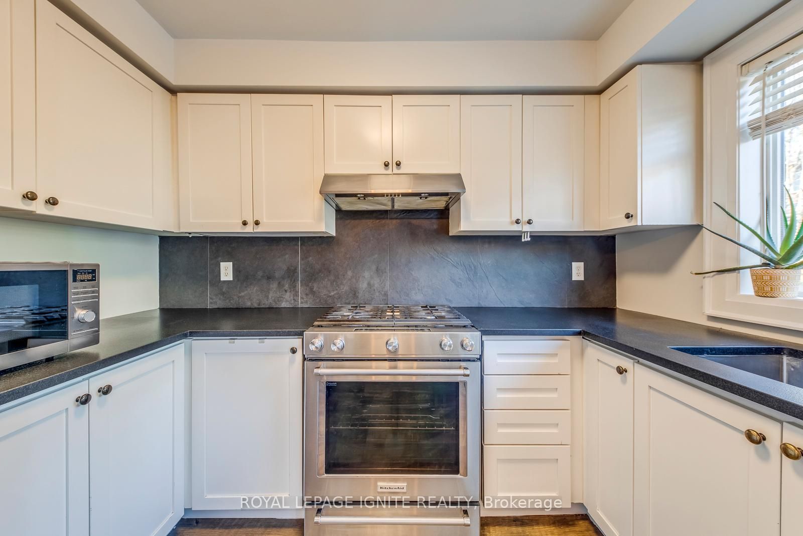• Modern kitchen with granite countertops and stainless steel appliances.