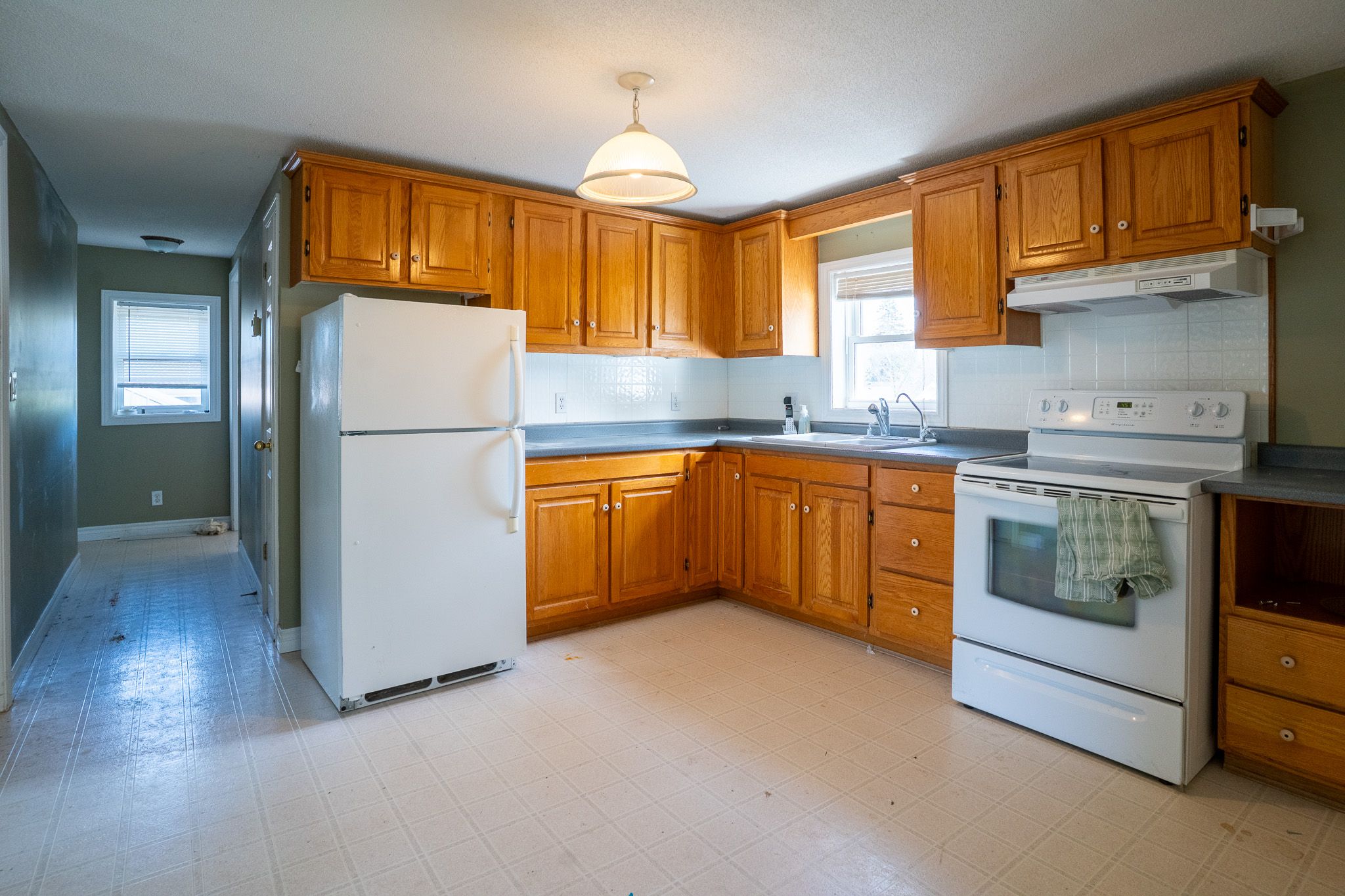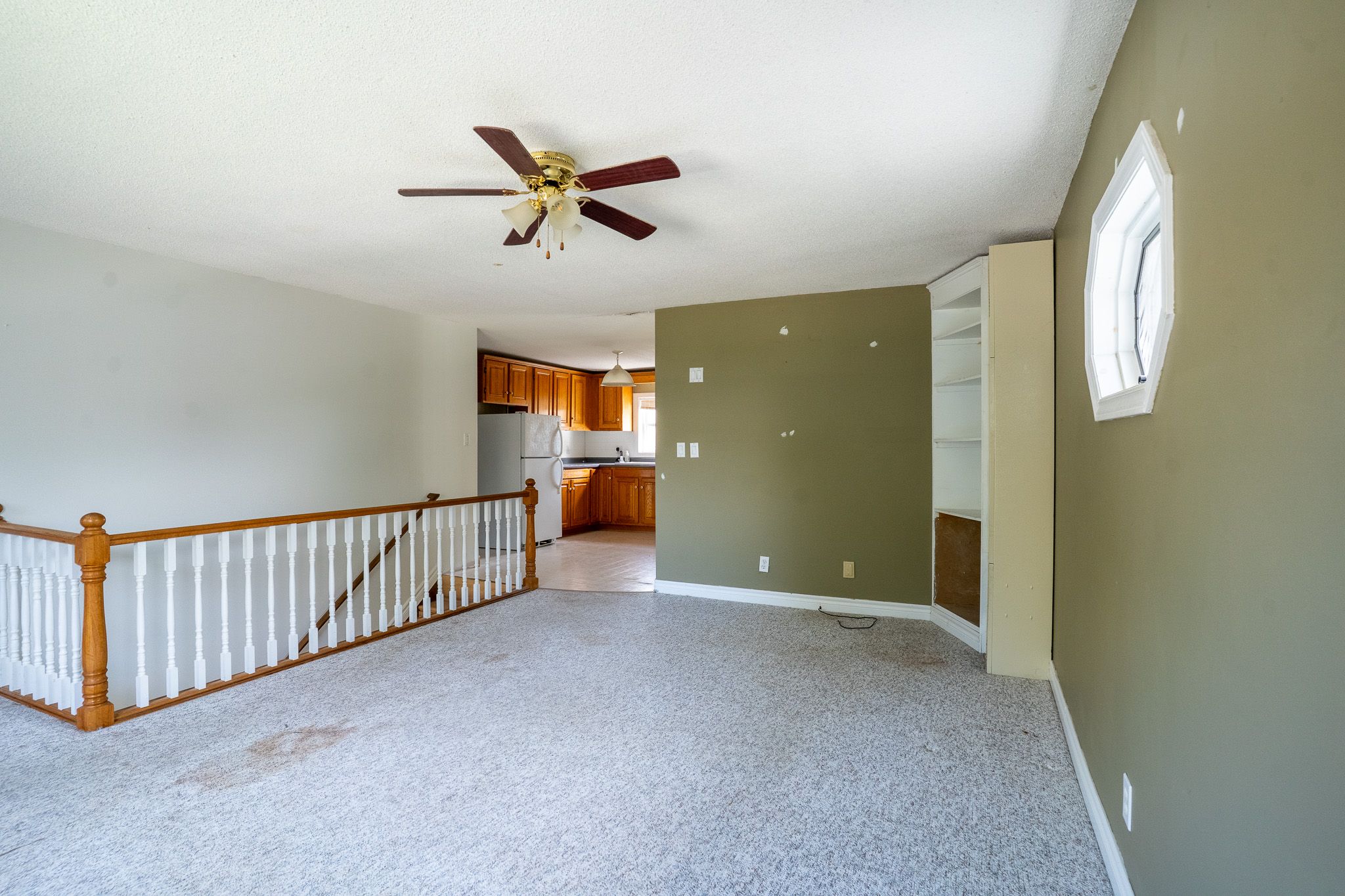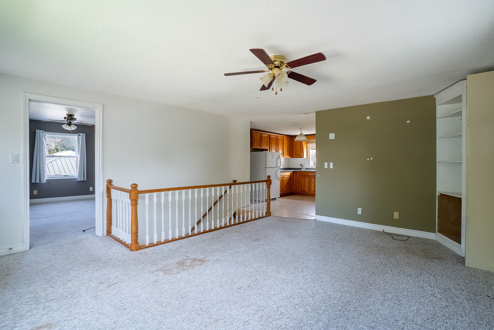 • Upstairs features a kitchen, two bedrooms, and a bathroom.