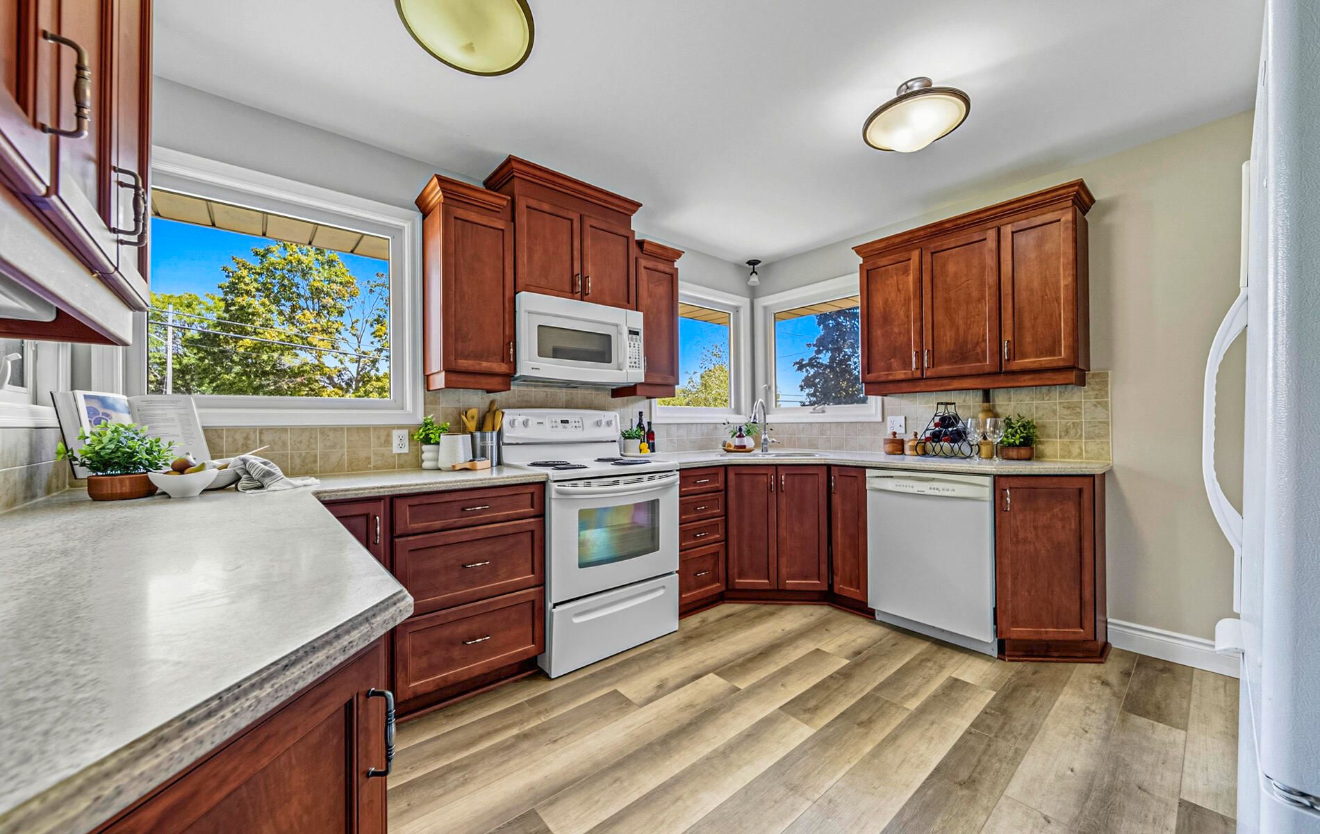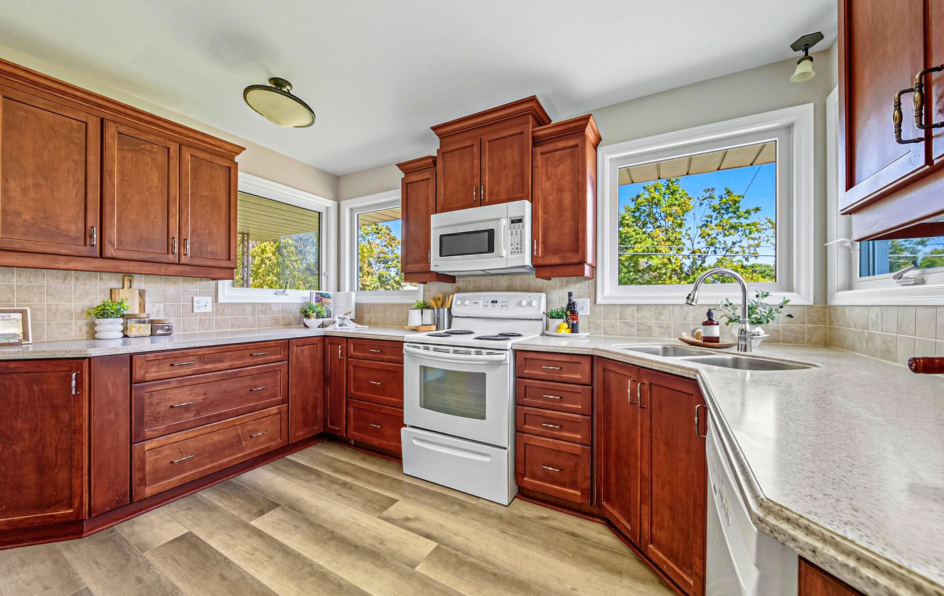 • Modern kitchen with ample hardwood cabinetry and oversized windows.
