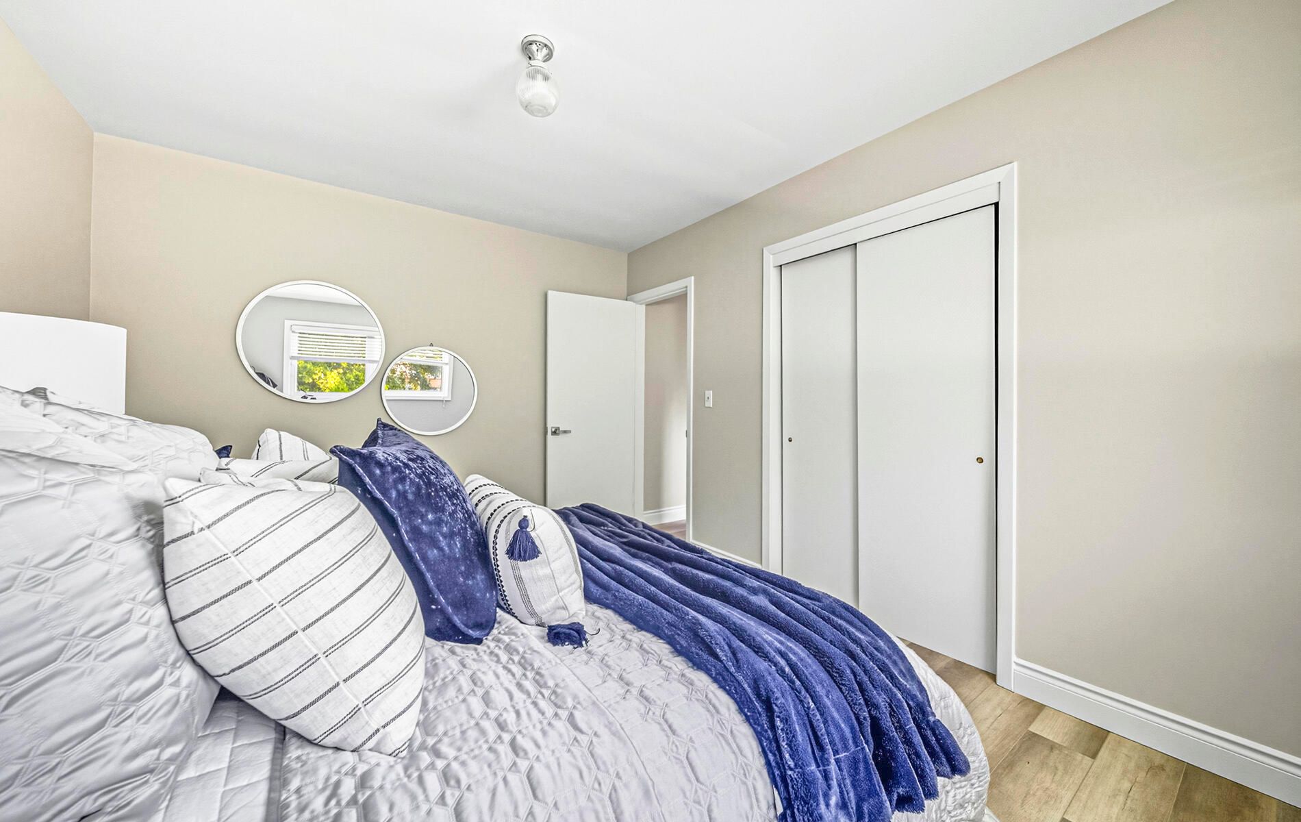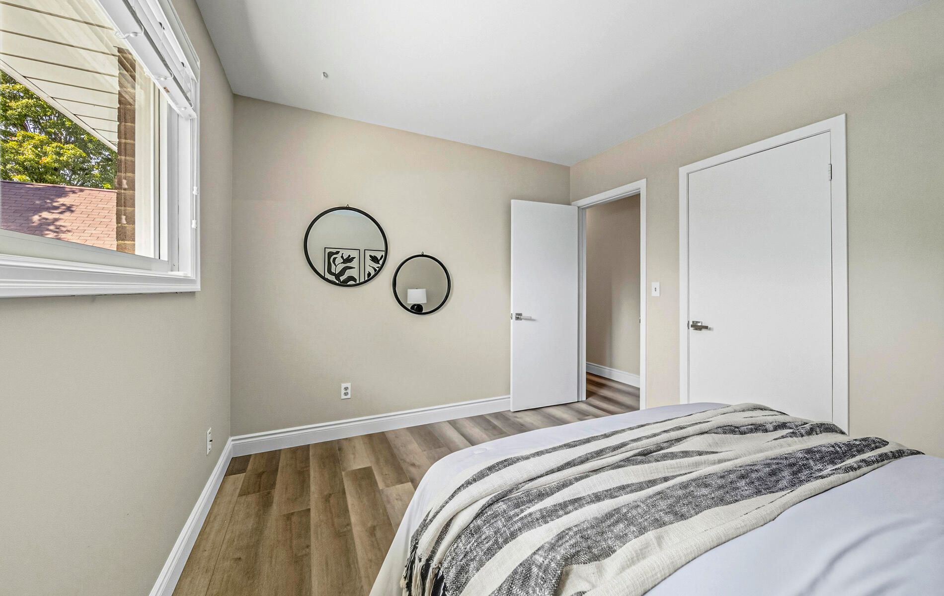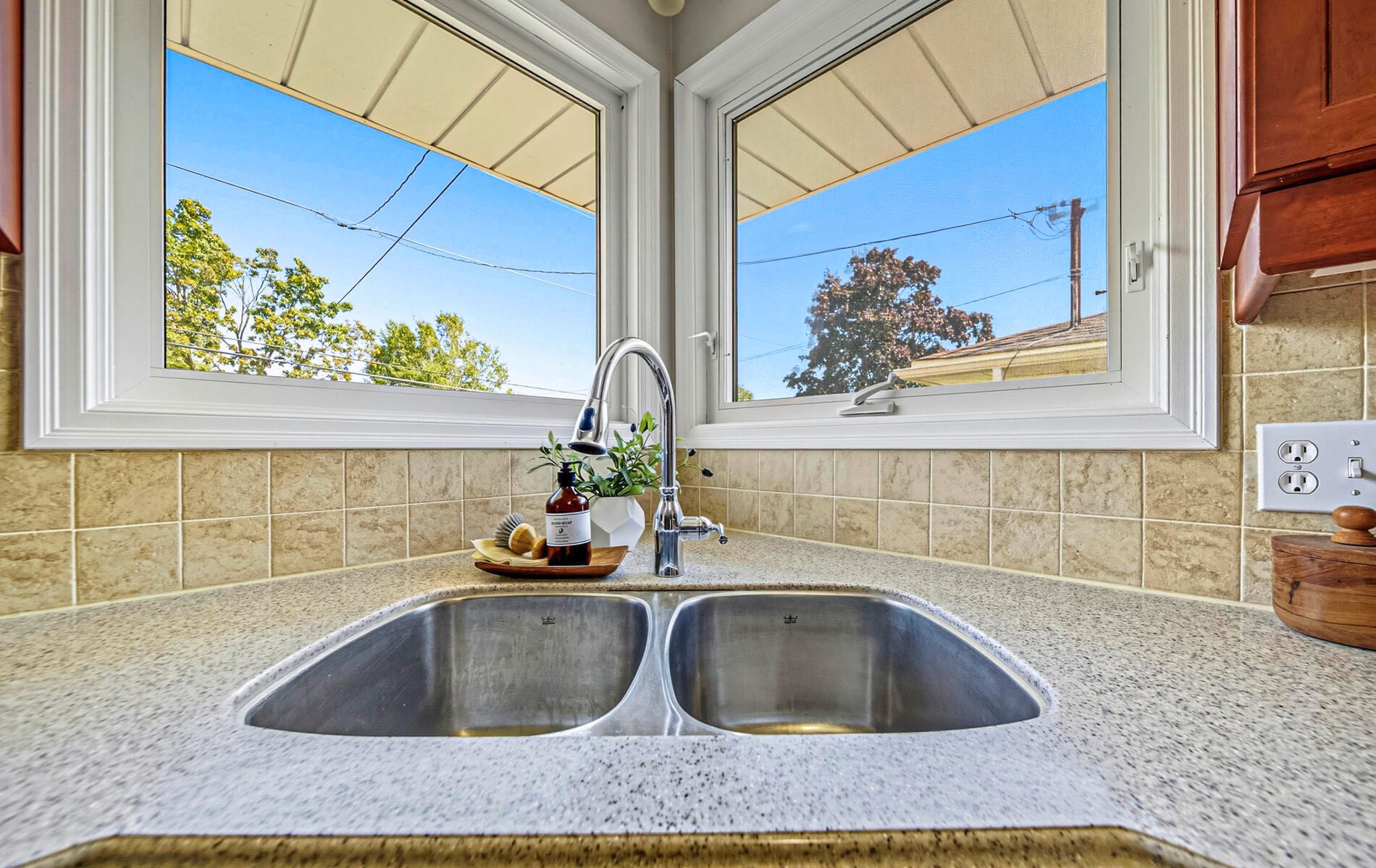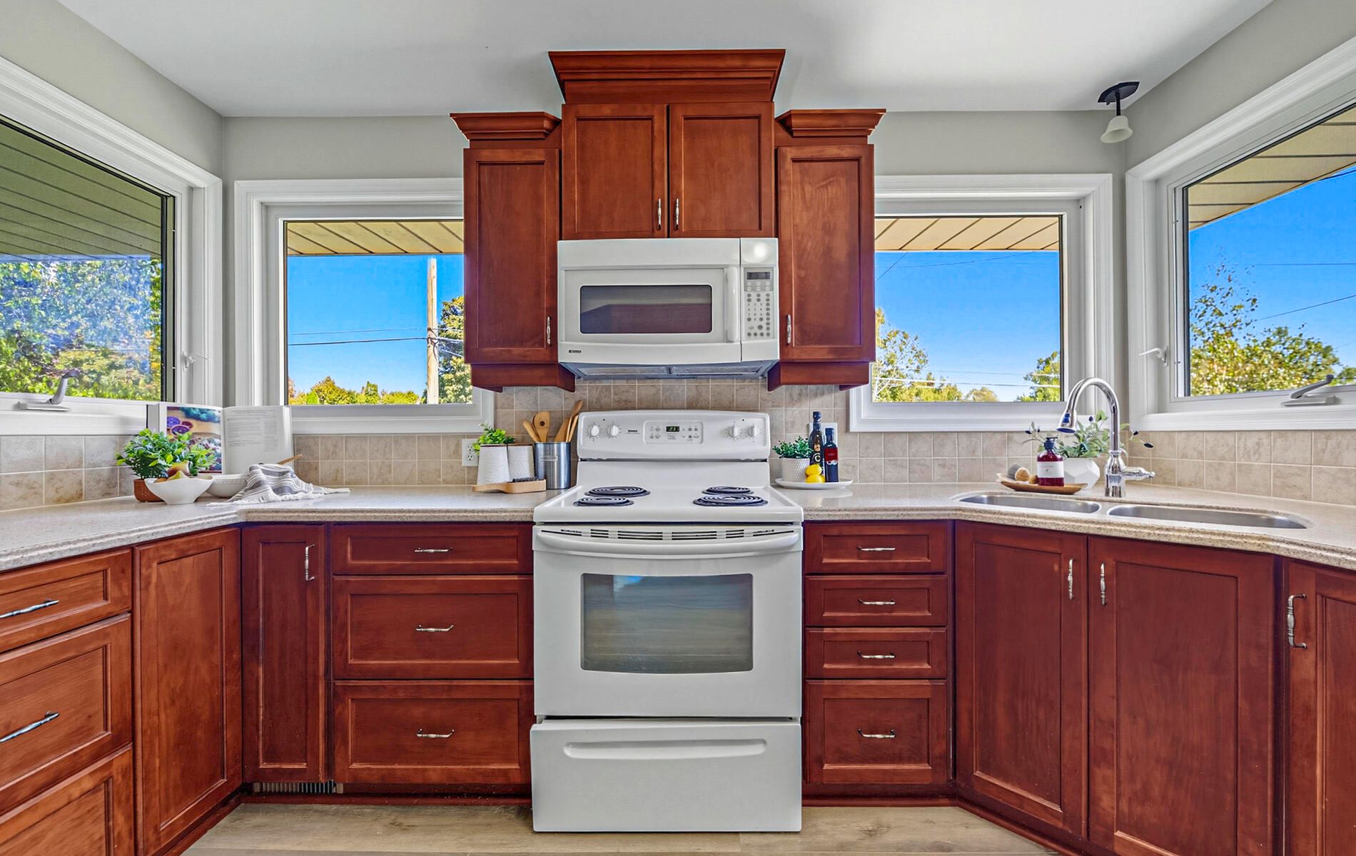 • Renovated kitchen with hardwood cabinetry and oversized windows for a welcoming feel.
