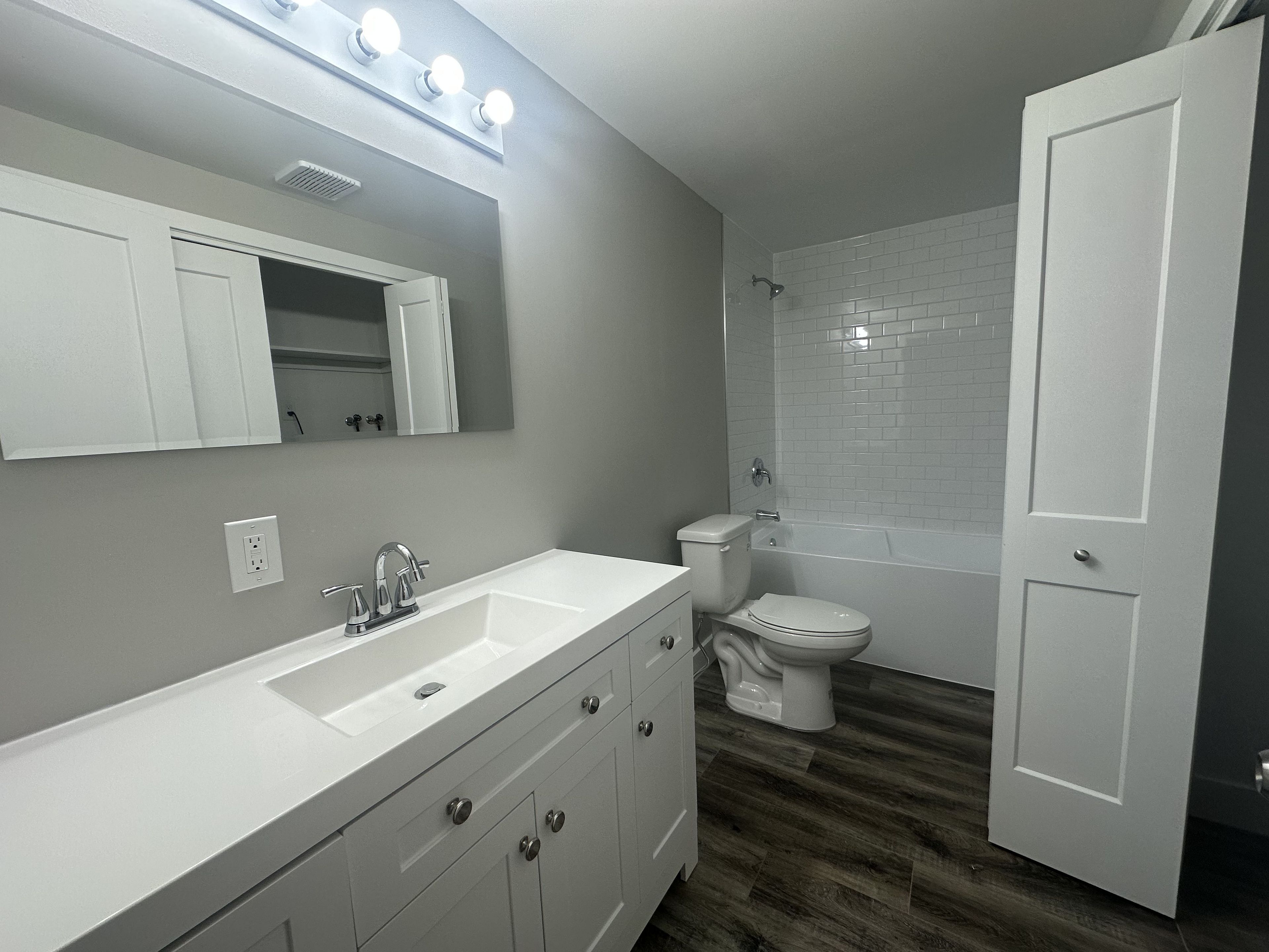 • Stylish bathroom featuring new vanity and modern tub/shower.