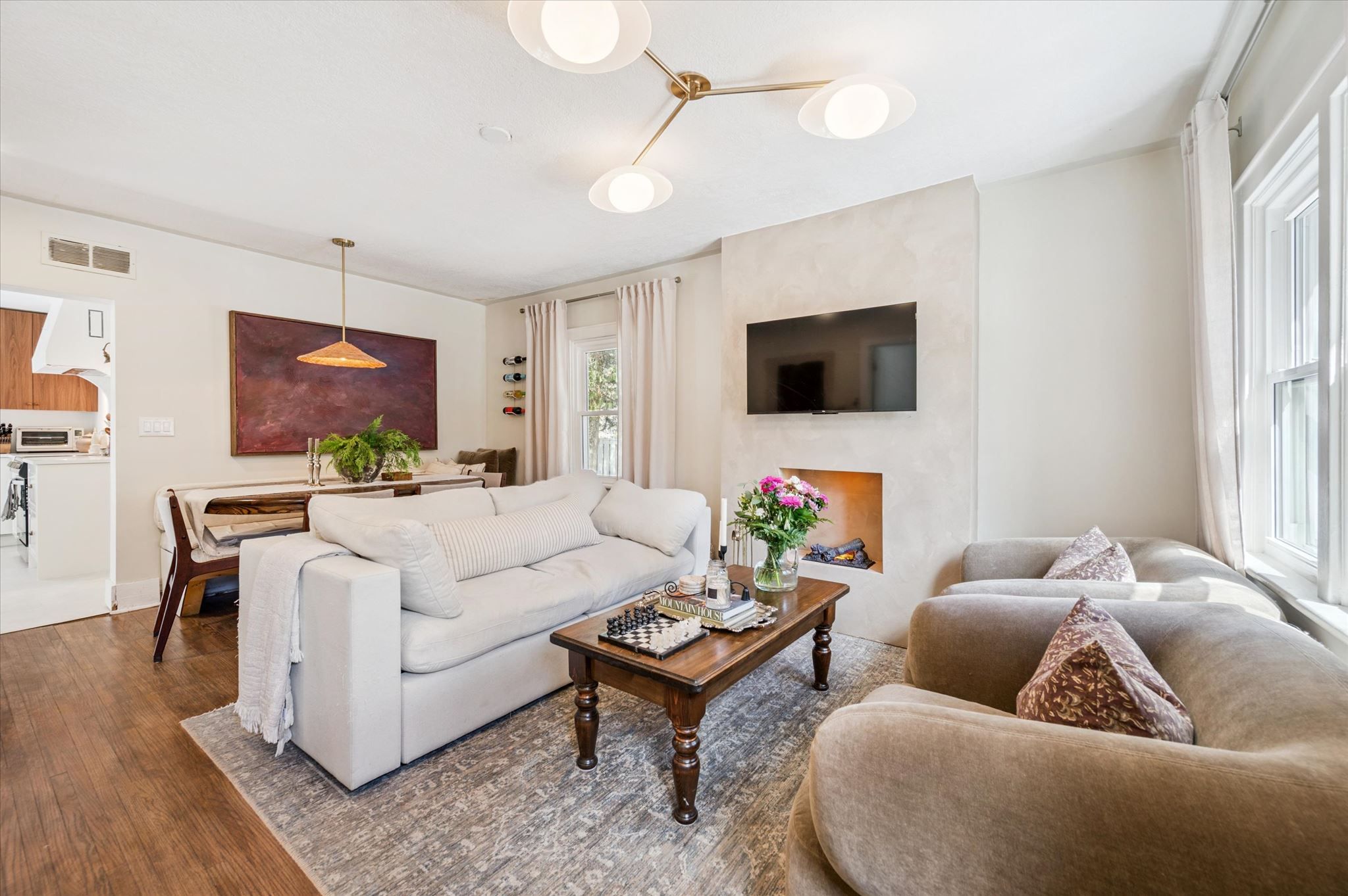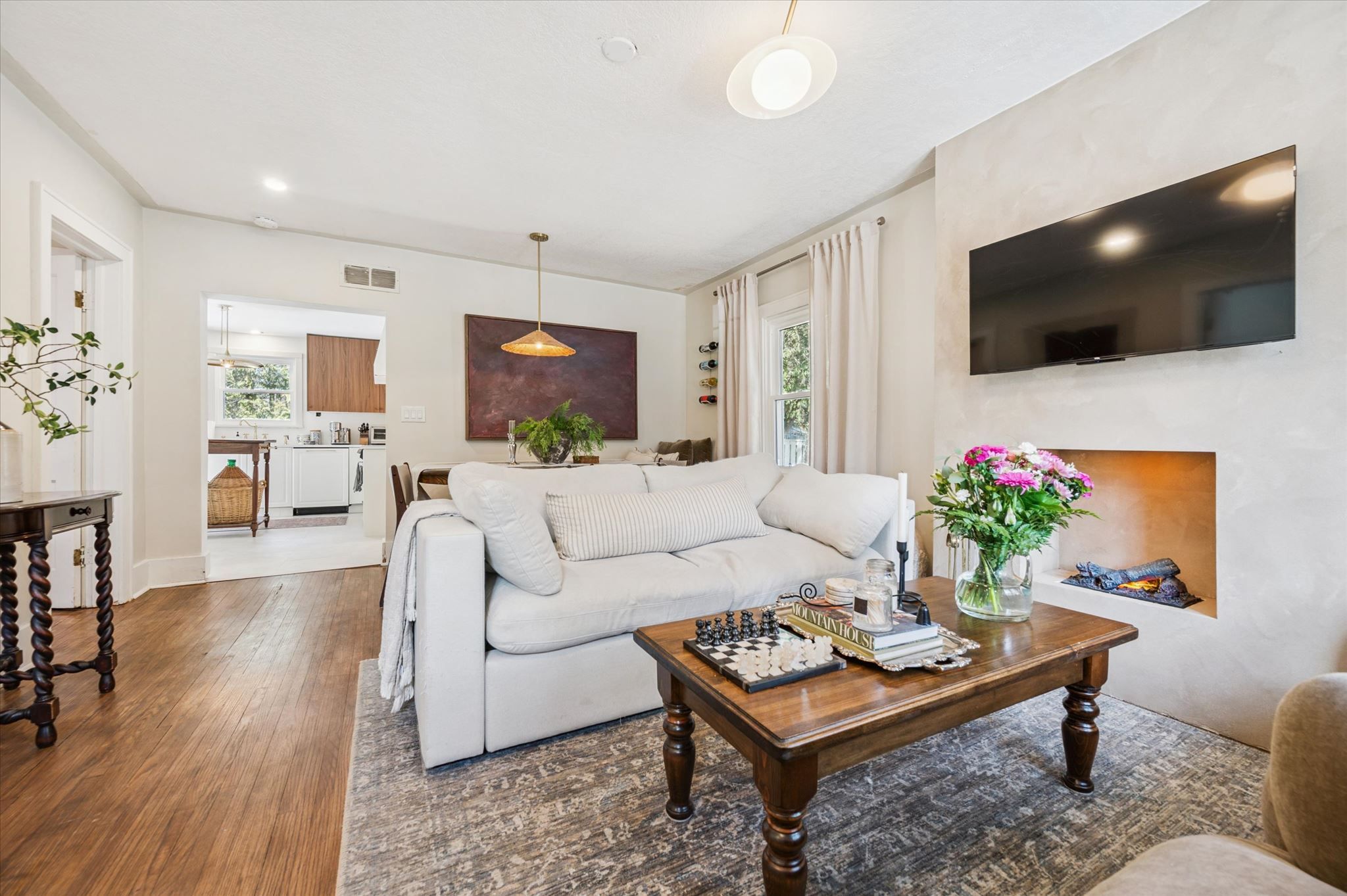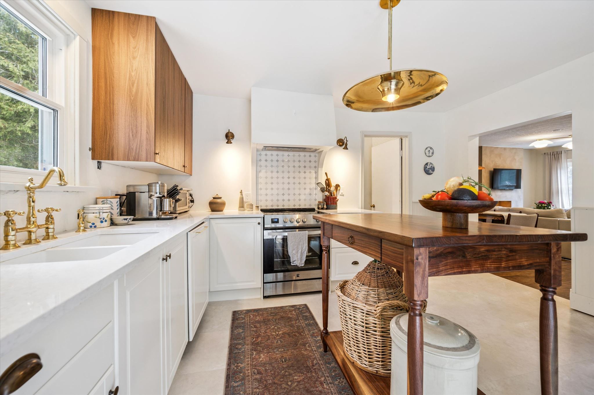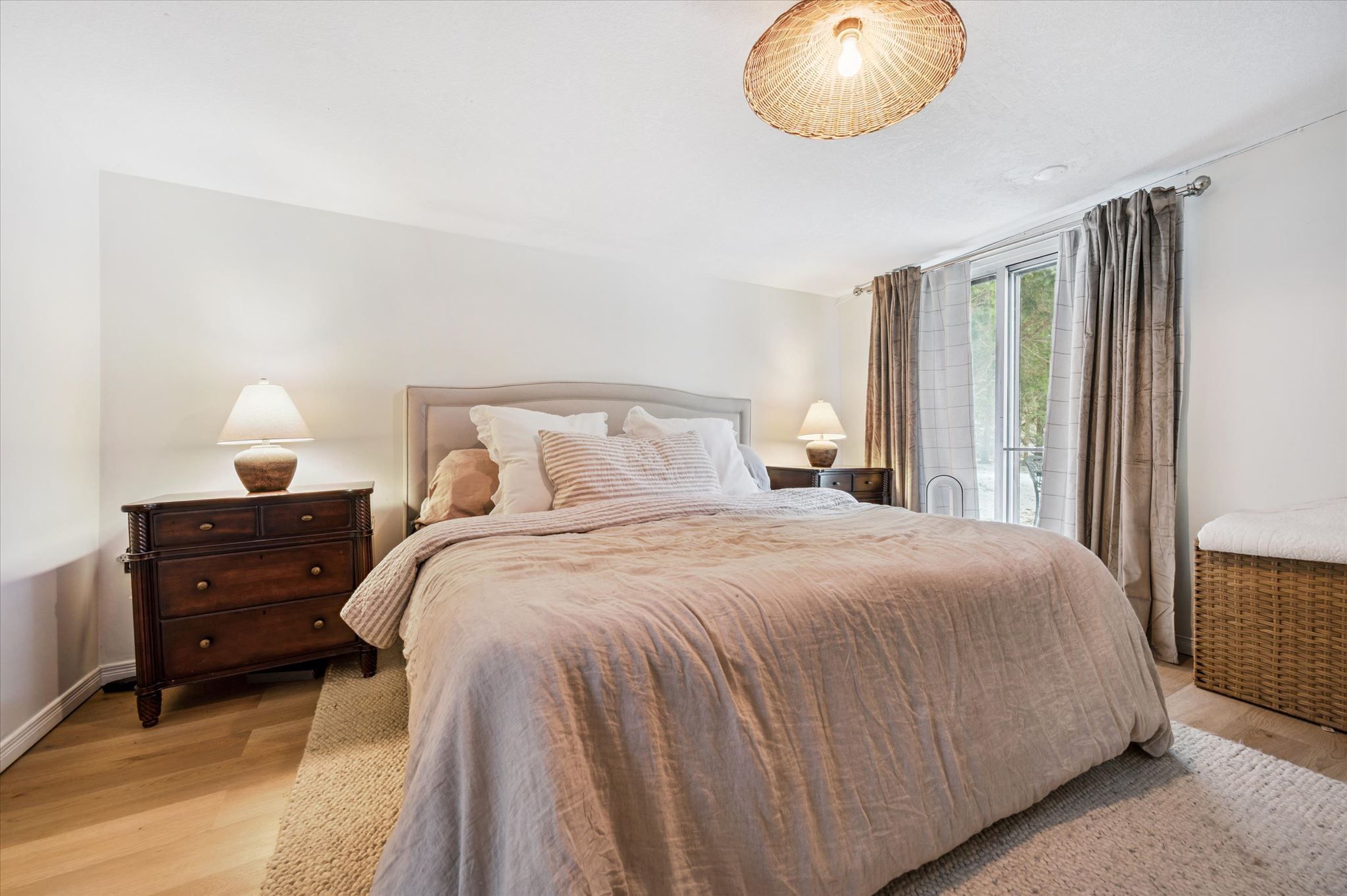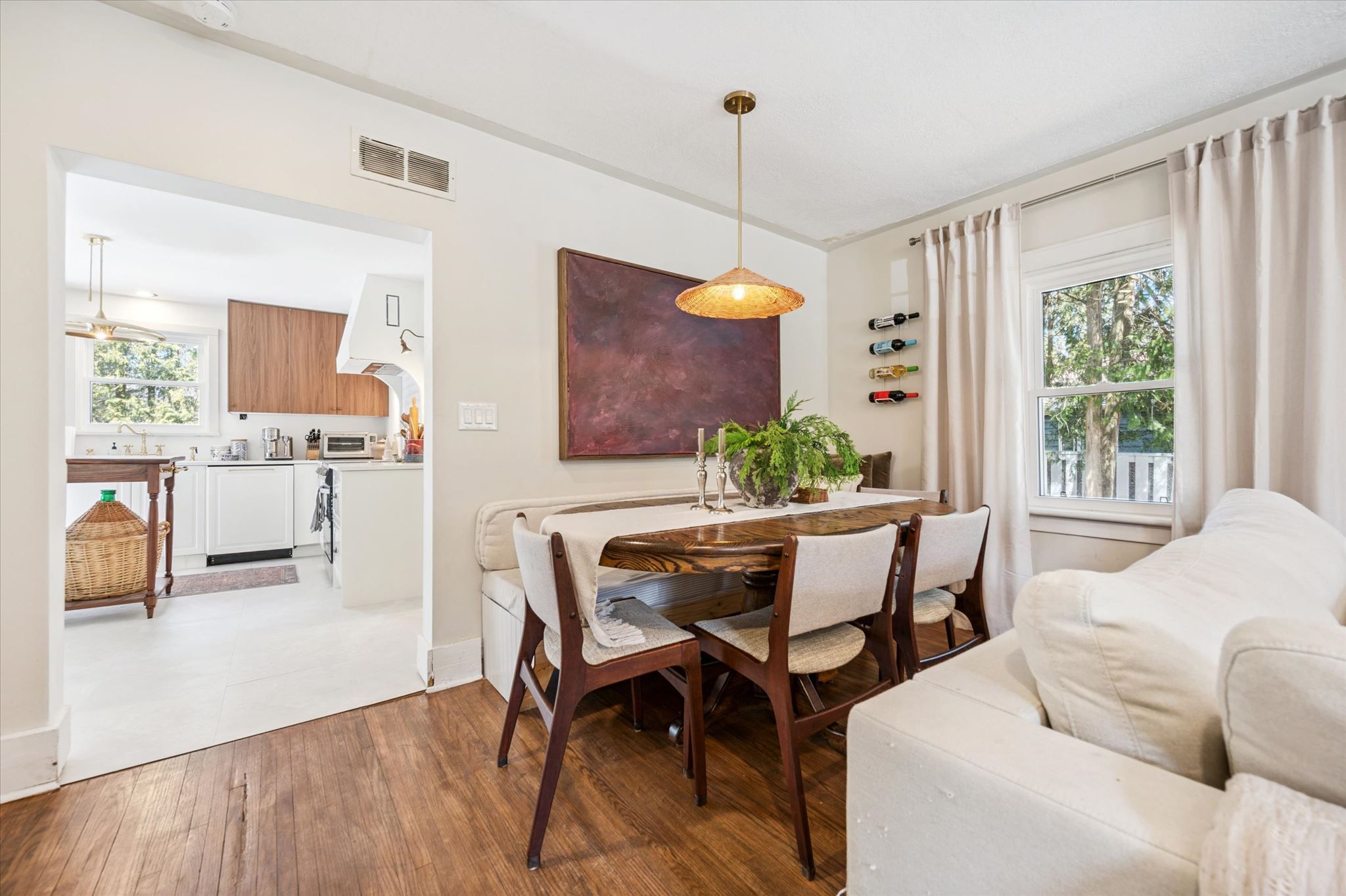 Location, location, location! Tucked away down a tree-lined lane, this charming cottage-inspired home offers the perfect blend of privacy and convenience, just moments from everything you need. Set on a mature 0. 6-acre lot, the home welcomes you with an inviting stone walkway and serene surroundings. Inside, a freshly painted living room sets the tone, featuring a striking micro-cement hearth and a unique optimyst water-vapour fireplace for a cozy, modern ambiance. The thoughtfully designed dining area includes a built-in bench, ideal for hosting and gathering, while the updated kitchen impresses with quartz countertops, integrated appliances, and a new sliding door that opens directly to the backyard, creating effortless indoor-outdoor living. This cozy home features a spacious primary bedroom with a walk-in closet, a bright and inviting second bedroom, and a versatile office or nursery just off the living room, providing flexible space to suit your lifestyle. Indulge in the fully renovated bathroom, complete with a freestanding tub, exposed brass shower fixtures, new vanity, and toilet, offering a spa-like experience at home. A new all-in-one washer/dryer adds everyday convenience. Surrounded by nature yet perfectly situated in town, you're just steps to the river, scenic trails, and close to arterial roads for an easy commute. A property of this size and setting is a rare offering so close to town, an exceptional opportunity to enjoy peaceful living without compromise.