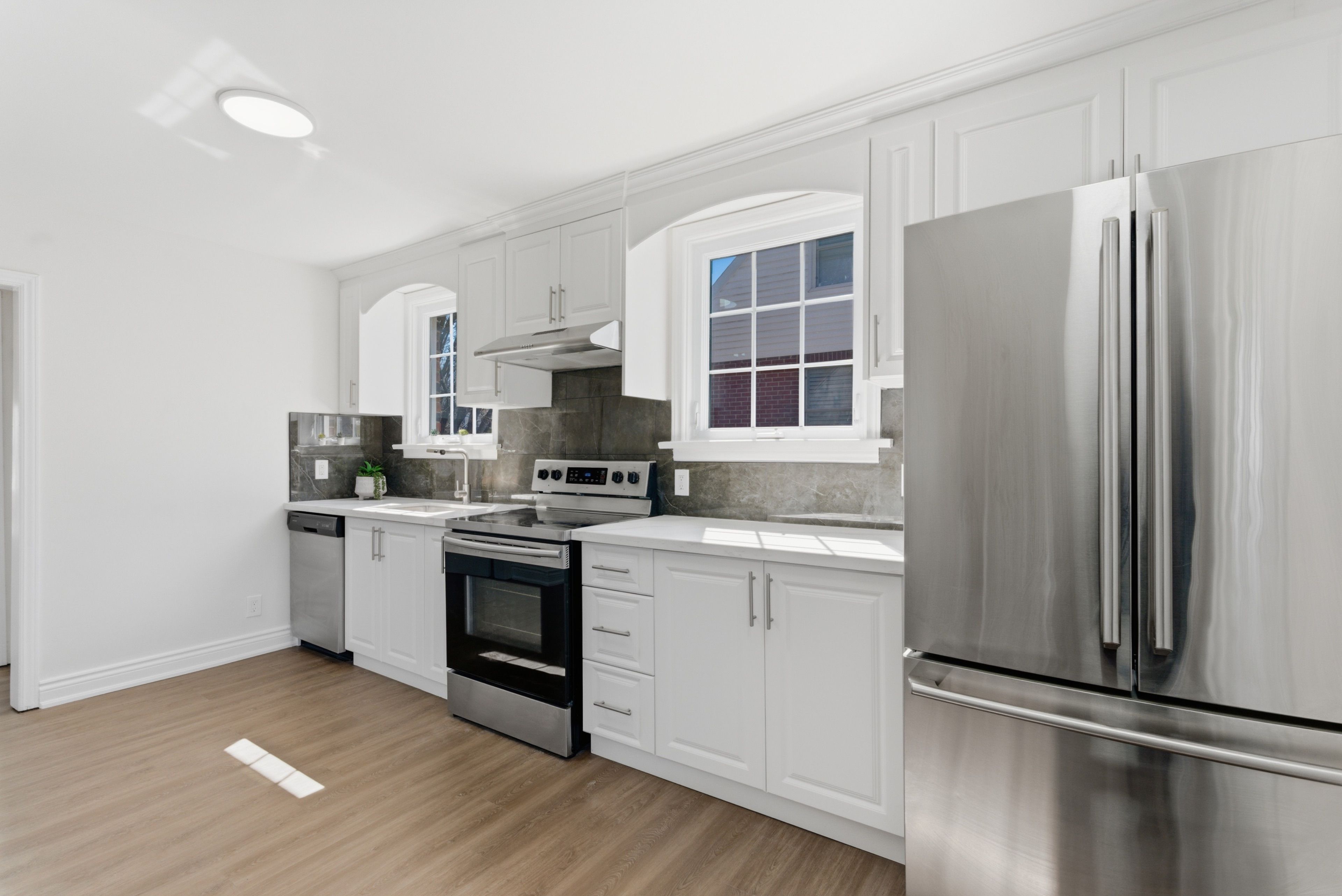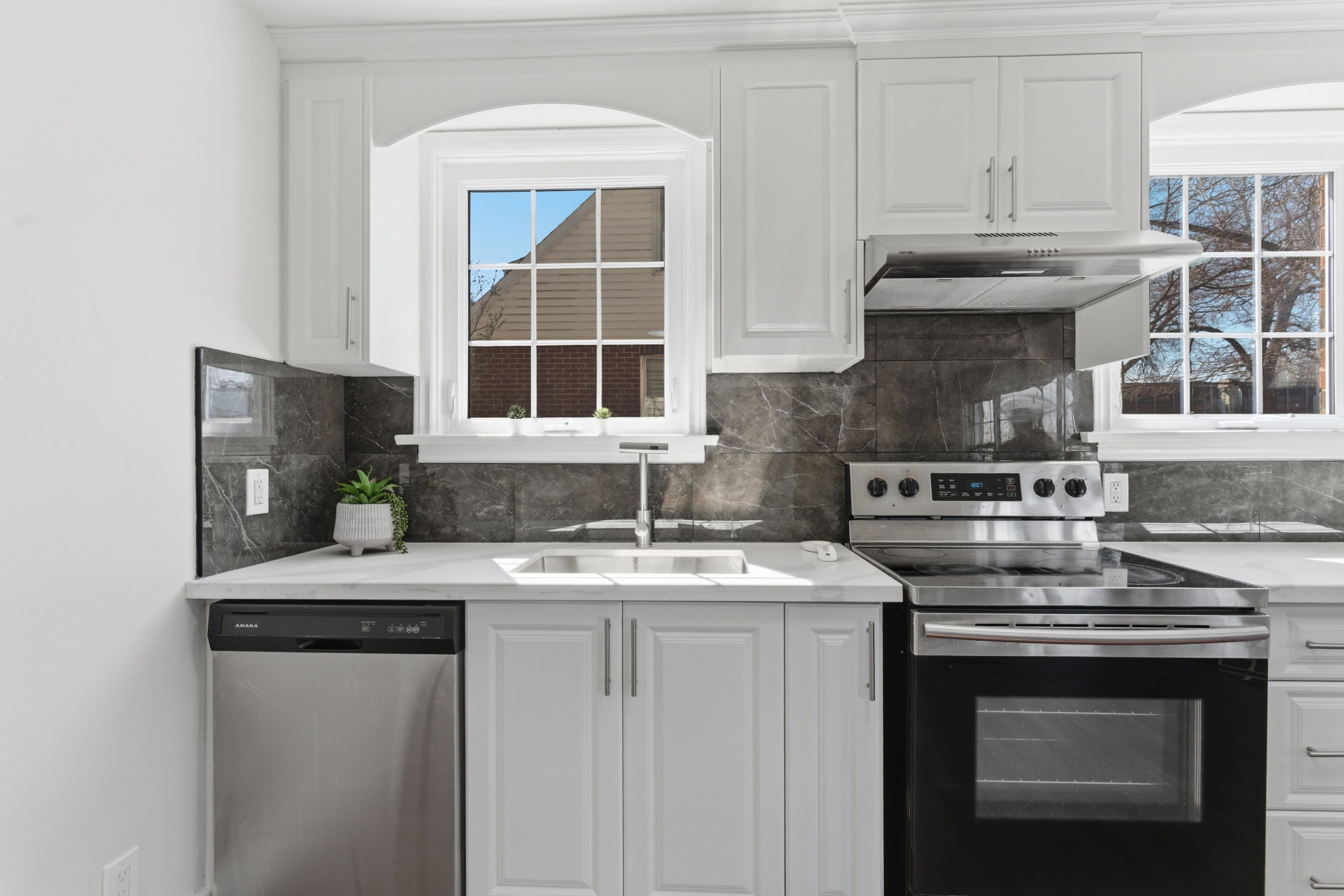 • Modern kitchen featuring durable Quartz countertops for style and functionality.