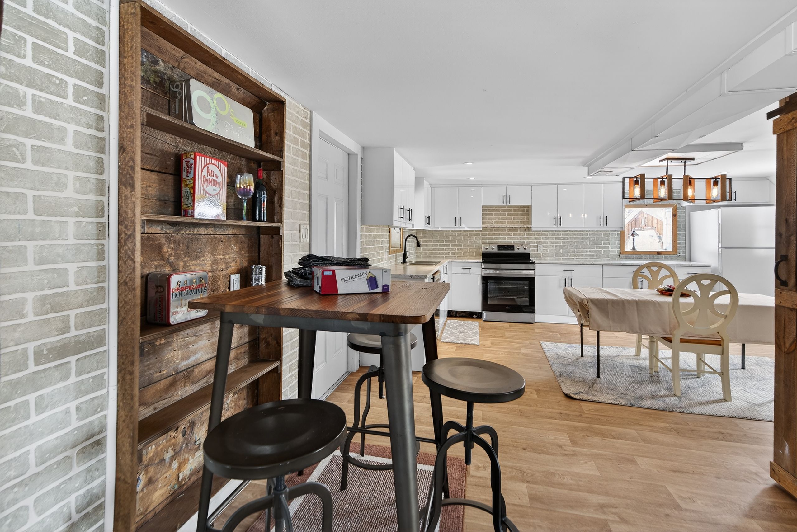 • Large country kitchen flowing into the cozy living room with fireplace.
