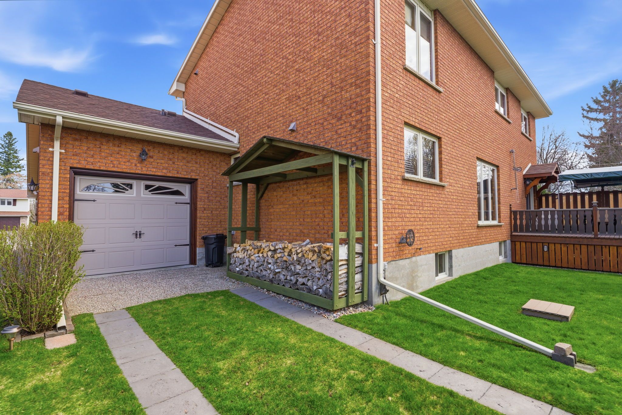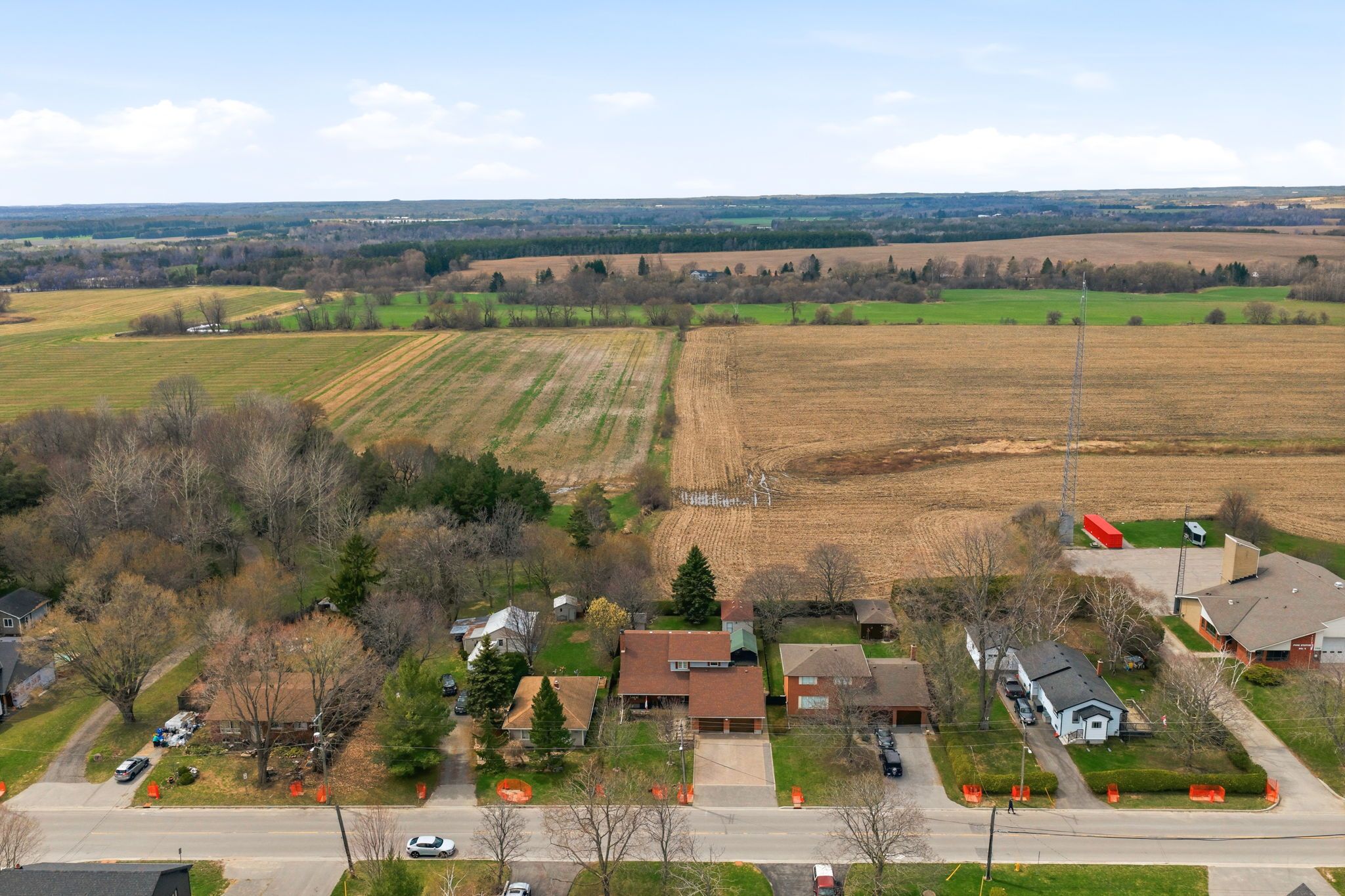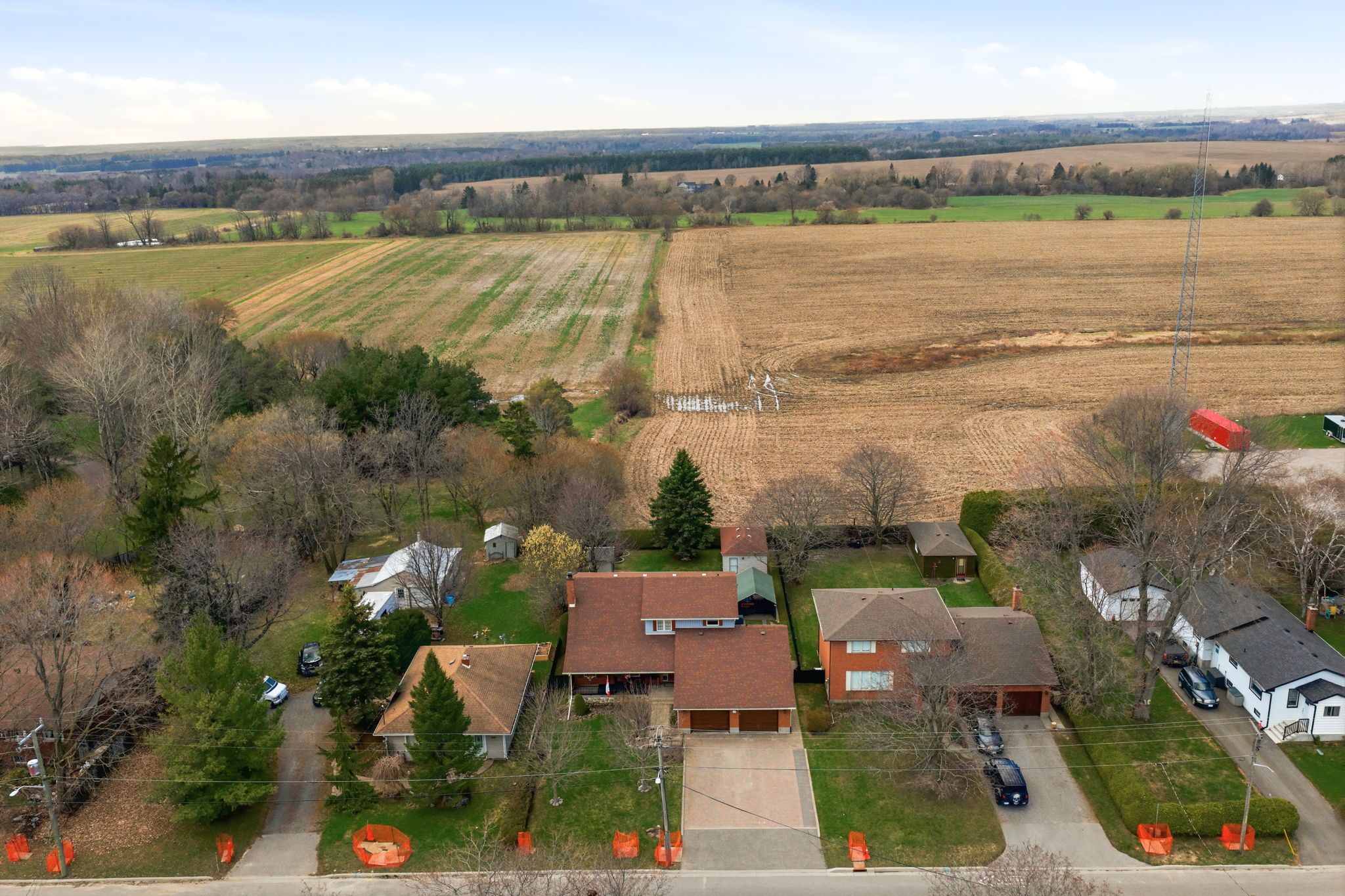 Beautiful brick 2100 sf residence with a charming veranda plus a finished basement and an attached double garage. Nestled on a generous 1/4 acre lot, this property backs onto farmlands, providing a peaceful country setting. As you enter, you're greeted by a beautiful foyer leading into the great room, where the cedar vaulted ceiling adds warmth and character. The main floor features a versatile den with walkout to a cedar deck, perfect for outdoor relaxation. The expansive kitchen and eating area boasts a breakfast bar with stylish pendant lights, closet pantry, torrey's vinyl flooring, and includes the appliances. Convenient main floor laundry room, featuring double and single sinks, ceramic backsplash, vinyl flooring, 3-piece washroom and direct access to the double garage. 3 spacious bedrooms on the upper level with the primary suite having hardwood flooring, double closet, single closet, and 5-piece ensuite bathroom with hallway access. The finished recreation area features a dry bar with vinyl flooring. There's also an office equipped with built-in cabinets and a ceramic backsplash. A large 2-room music studio is fully wired with sound proofing in the ceiling and walls, also holds potential for conversion into an additional bedroom if needed. The basement also includes a separate cold room, furnace room, and ample storage options. The attached double garage is designed for convenience, featuring three overhead doors, two at the front and one at the rear, allowing for 6+ vehicle parking on the brick driveway. Additional highlights include a fully insulated and heated vinyl-sided shop (24x14) with a subfloor, 60 amp service and welder plug, as well as a negotiable outside canvas dome. Note - roof shingles were replaced in 2017, 200 amp service, cladded windows, rogers internet, and basement sub-floor.