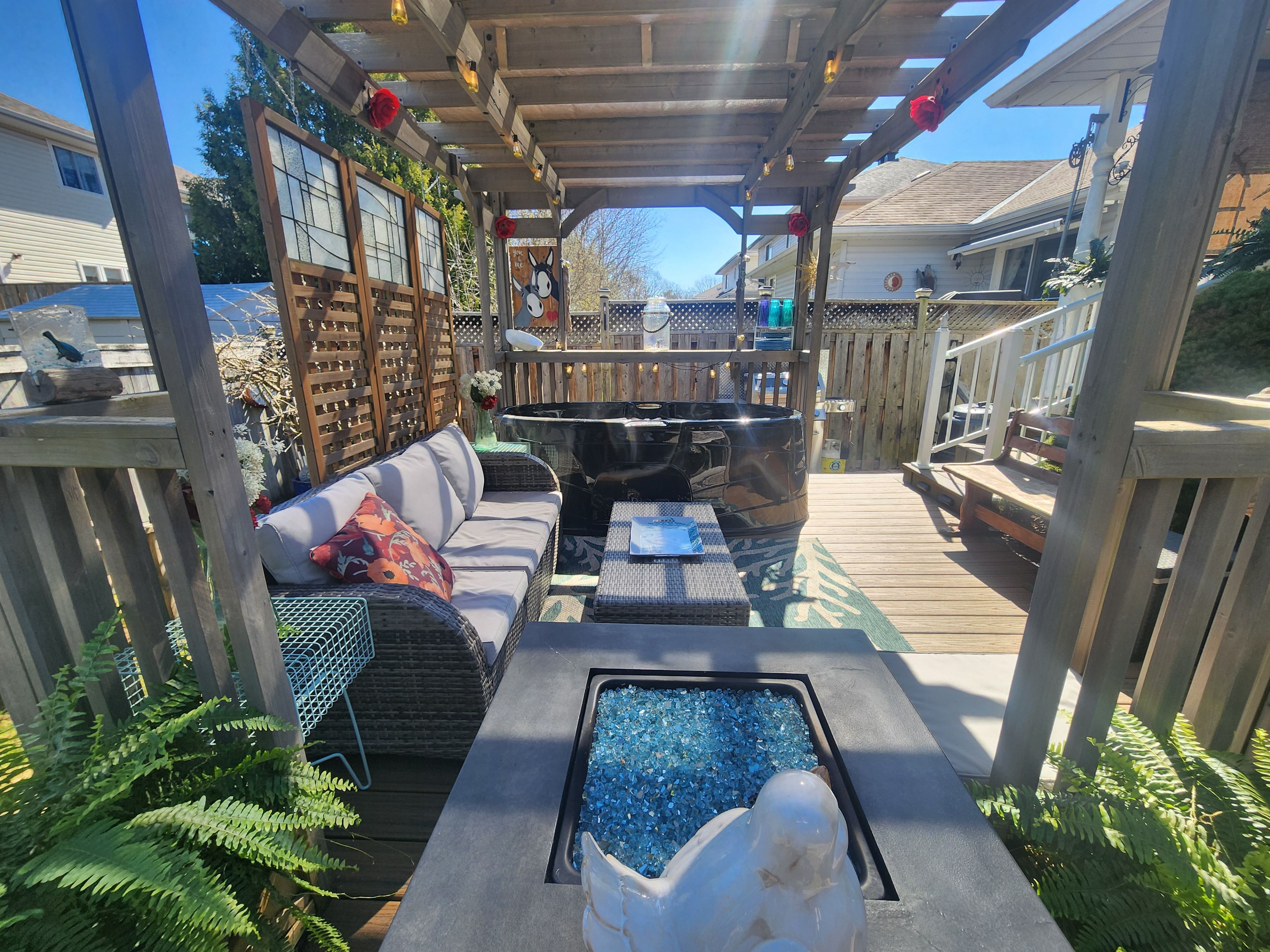 • Covered rear porch and hot tub create a perfect outdoor retreat.