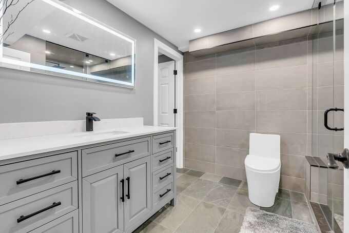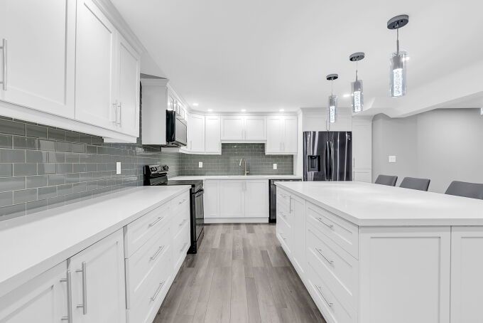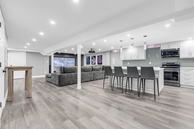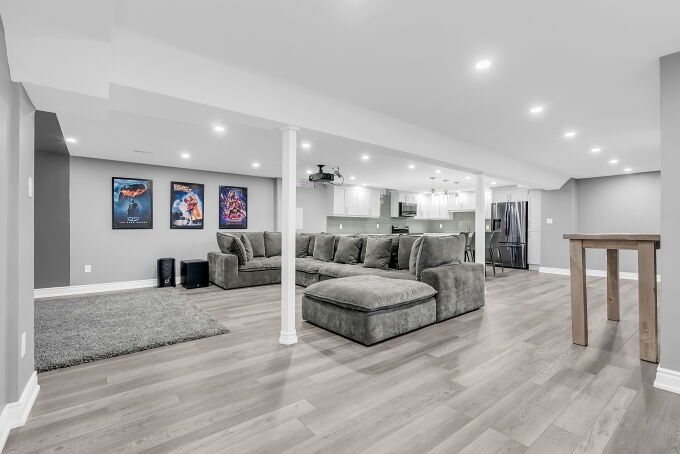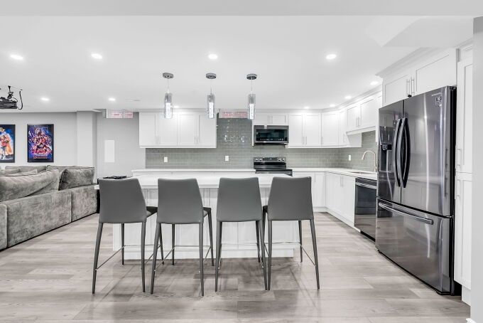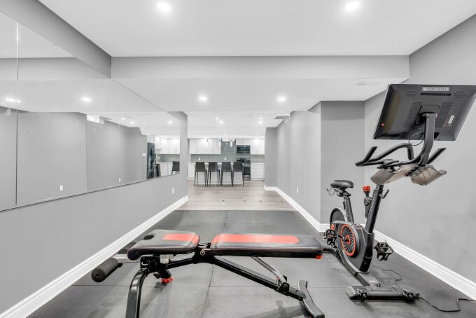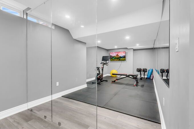 • Finished basement features gym, equipped kitchen, and recreation area.