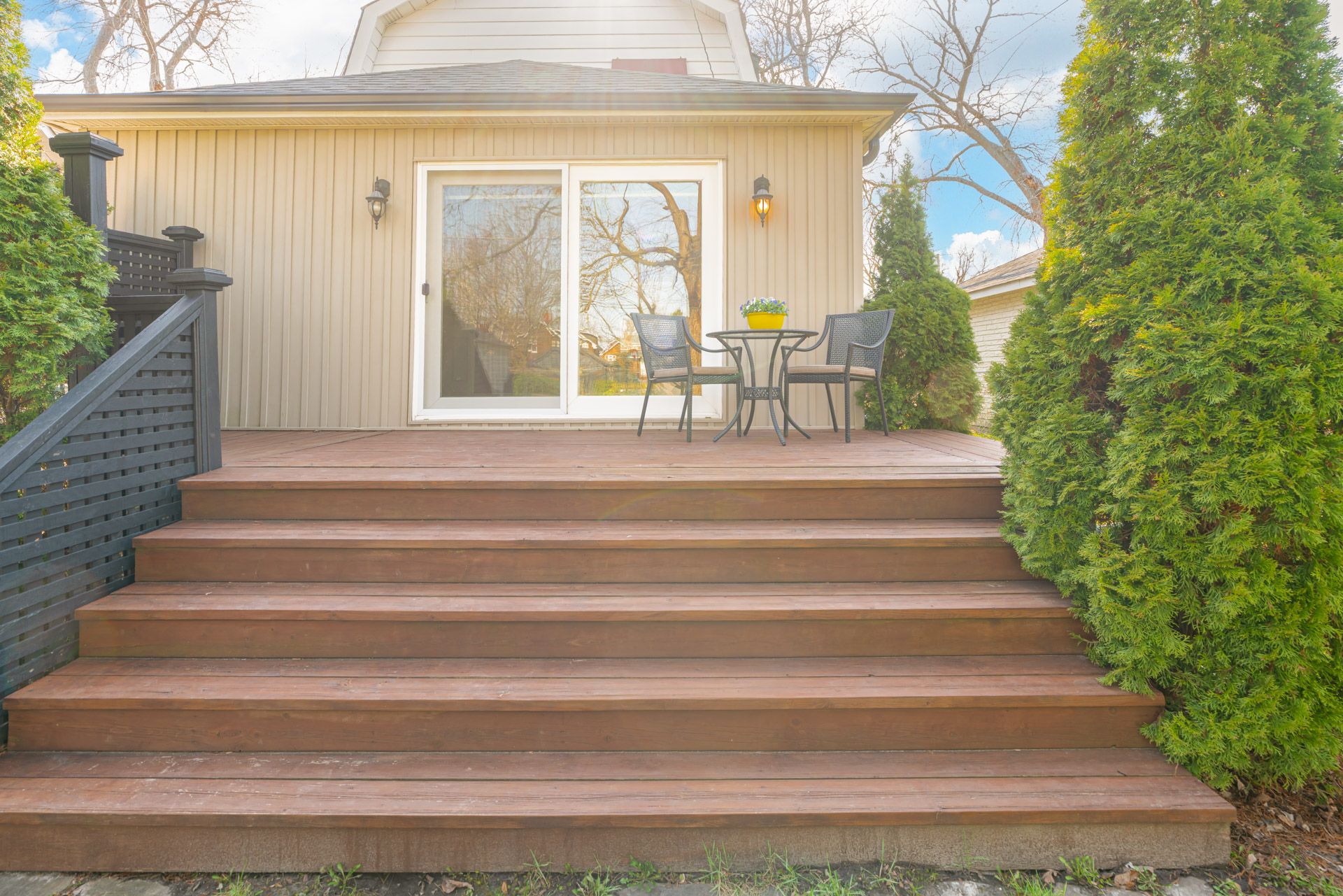 • Private, fully fenced backyard with mature trees and a garden shed.