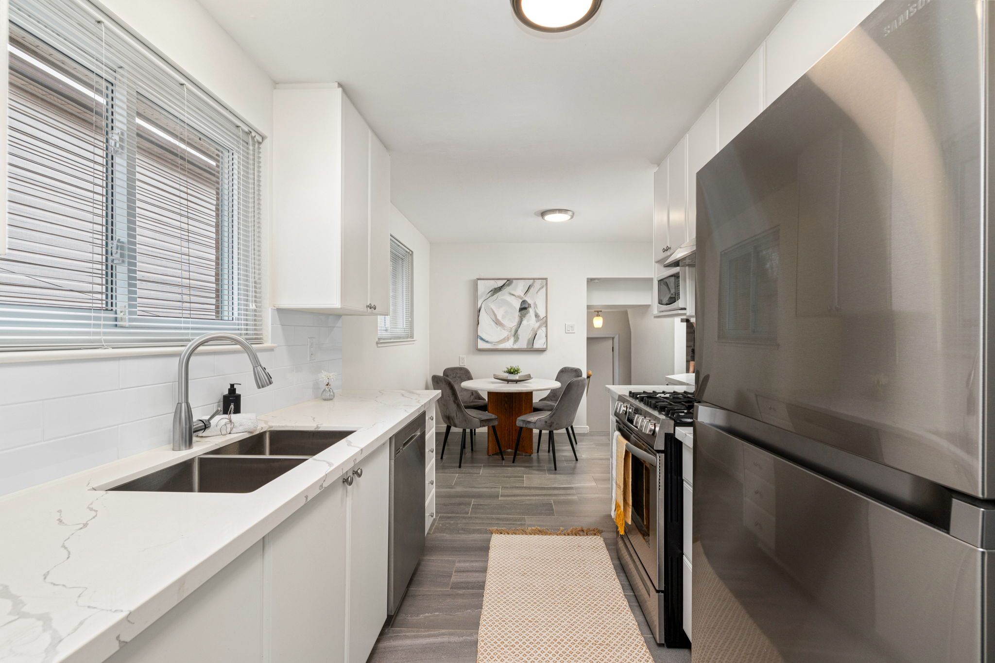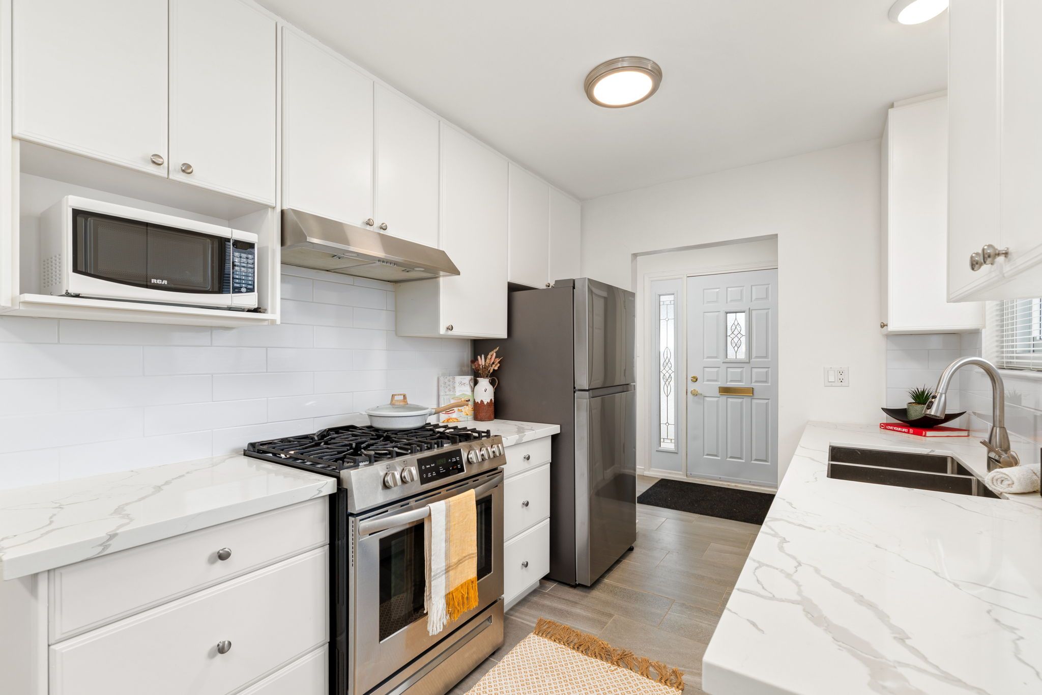 • Bright kitchen with quartz countertops and stainless steel appliances.