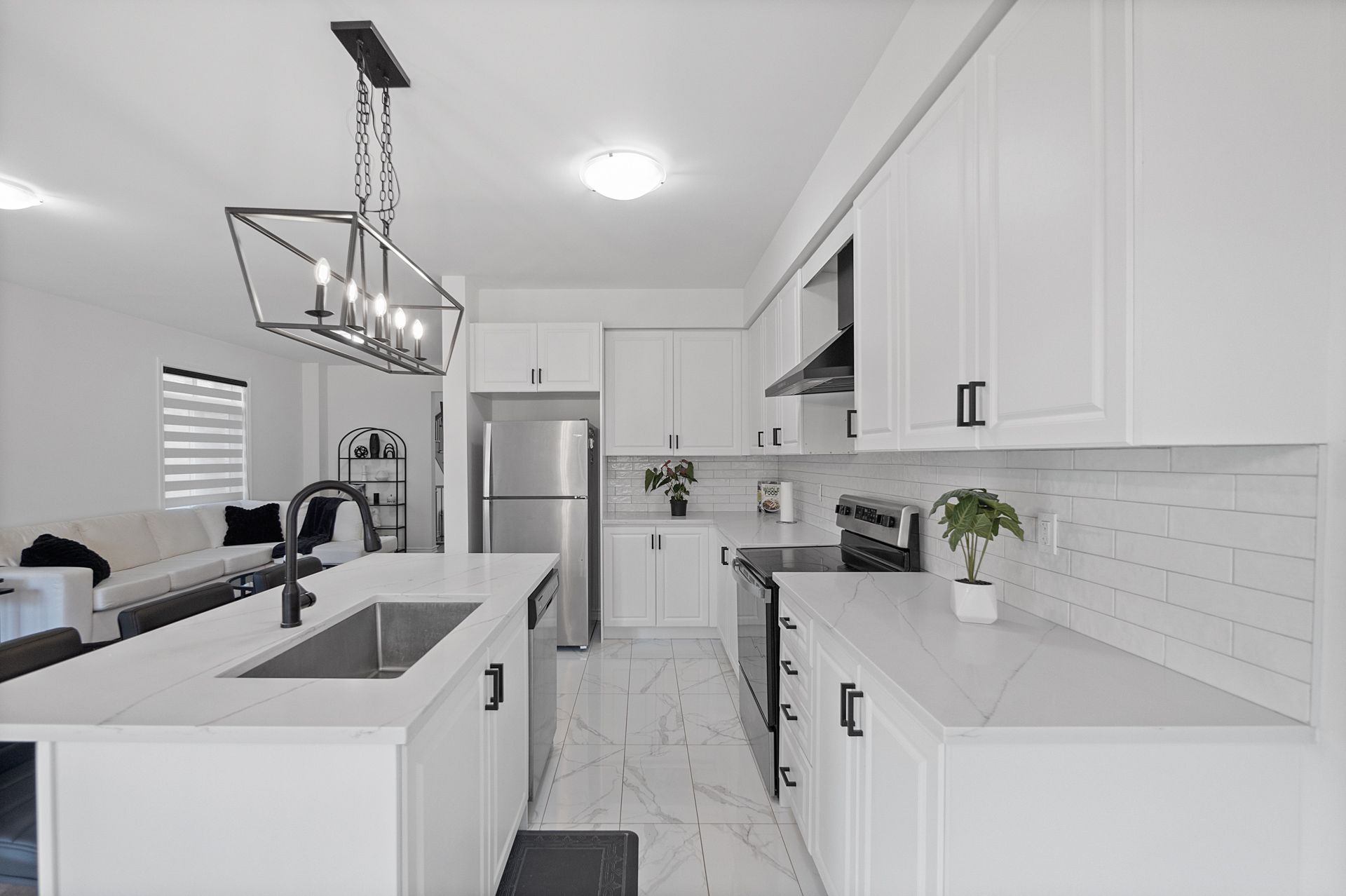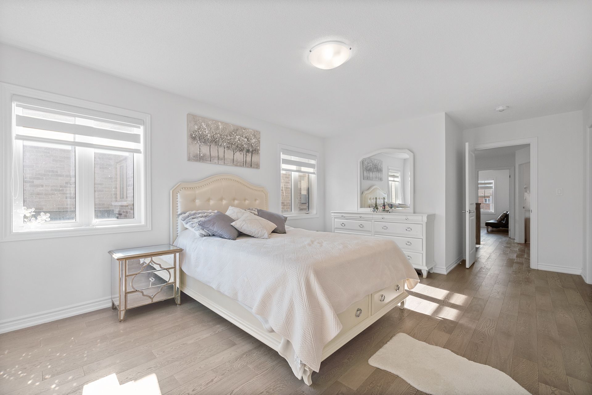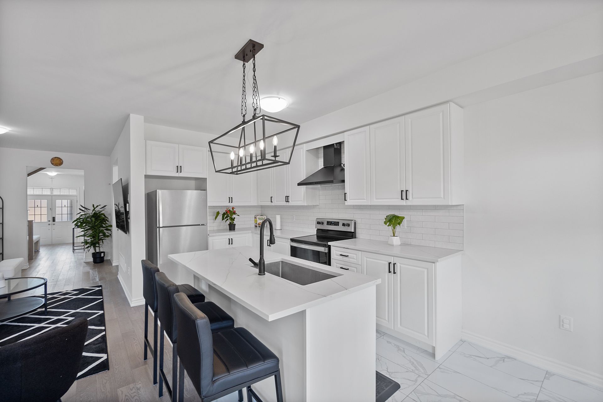 • Bright open-concept living area with 9-foot ceilings and hardwood flooring.