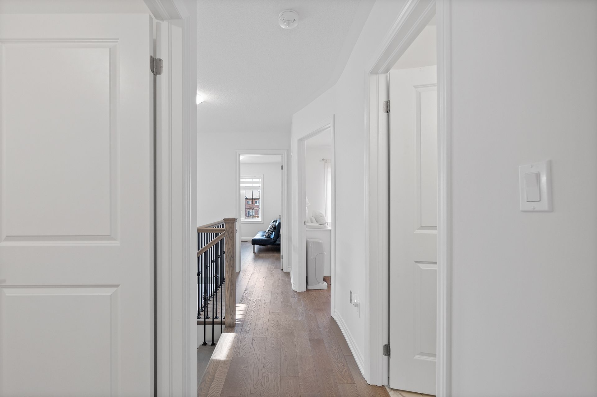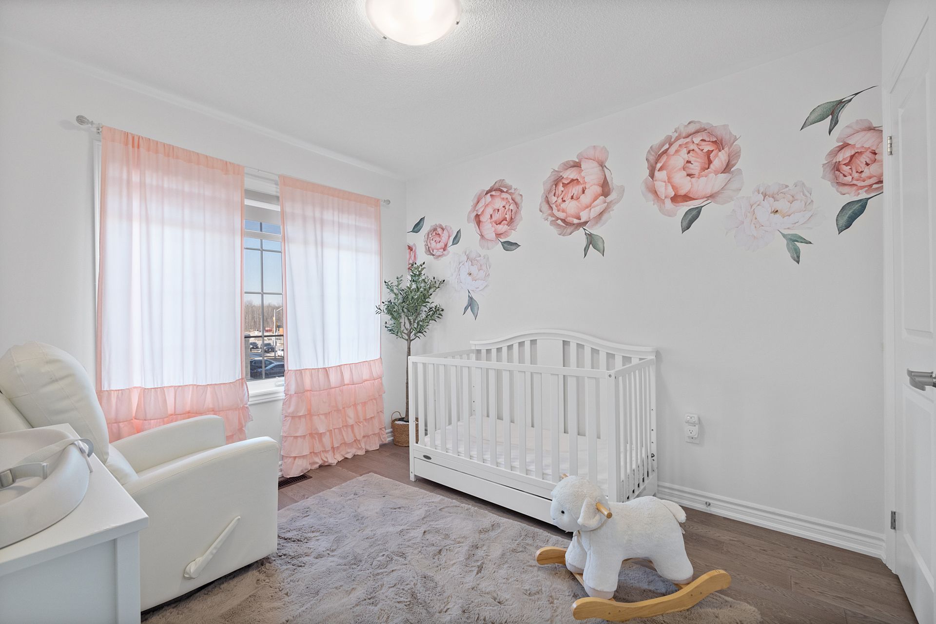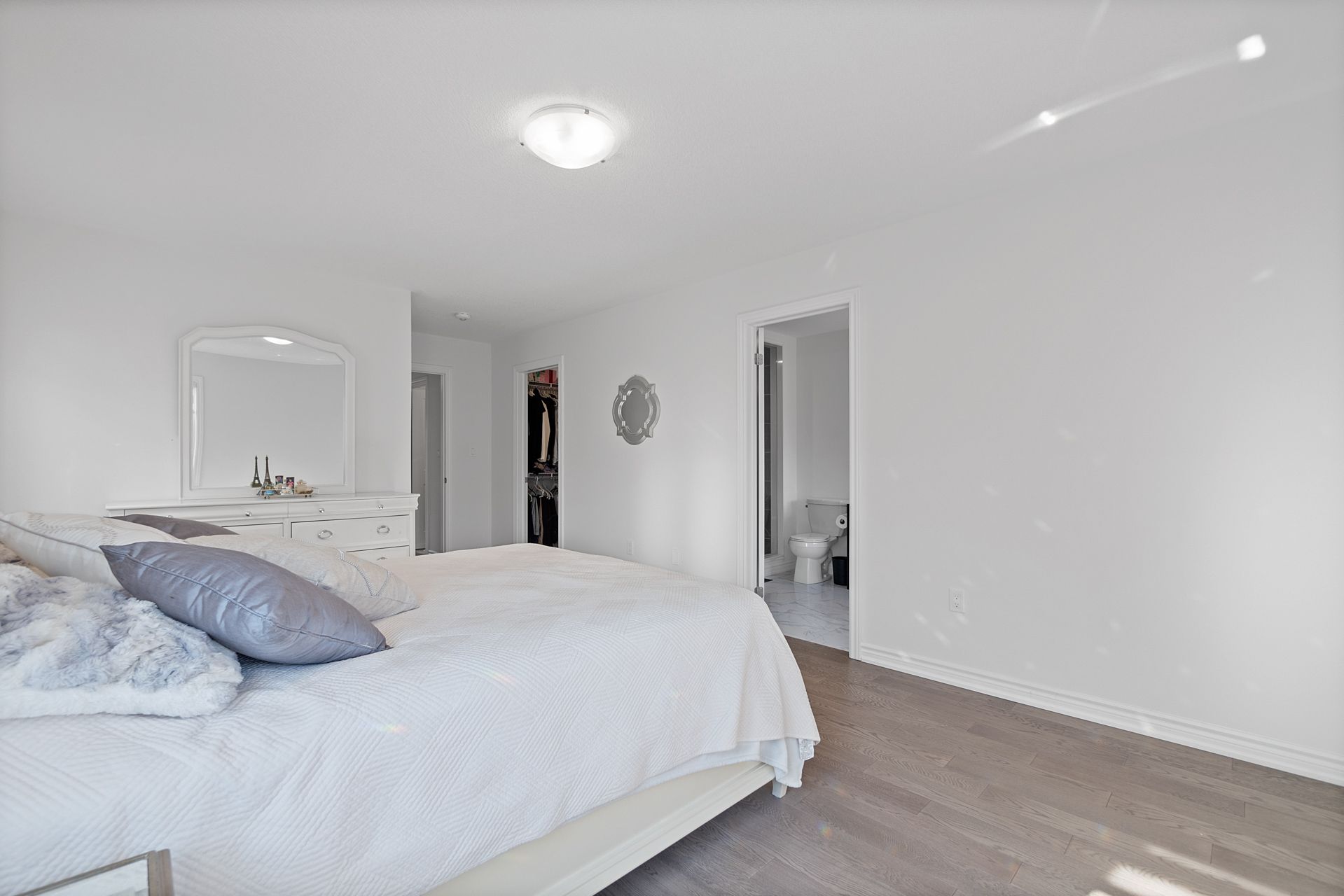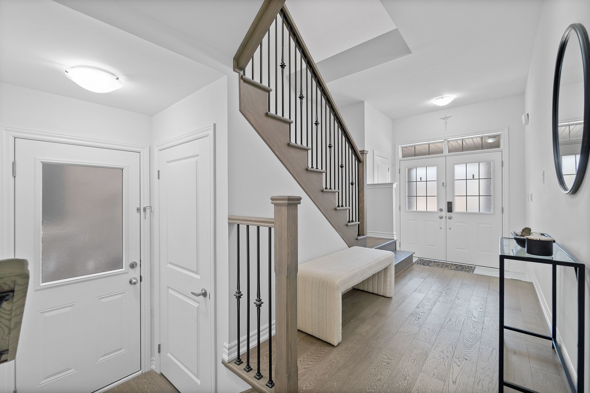 • Bright open-concept living area with 9-foot ceilings and hardwood flooring.