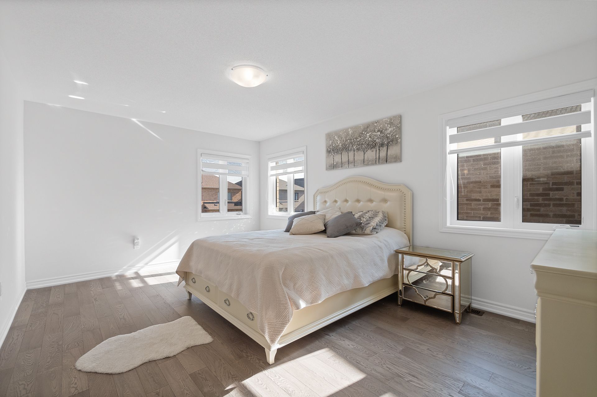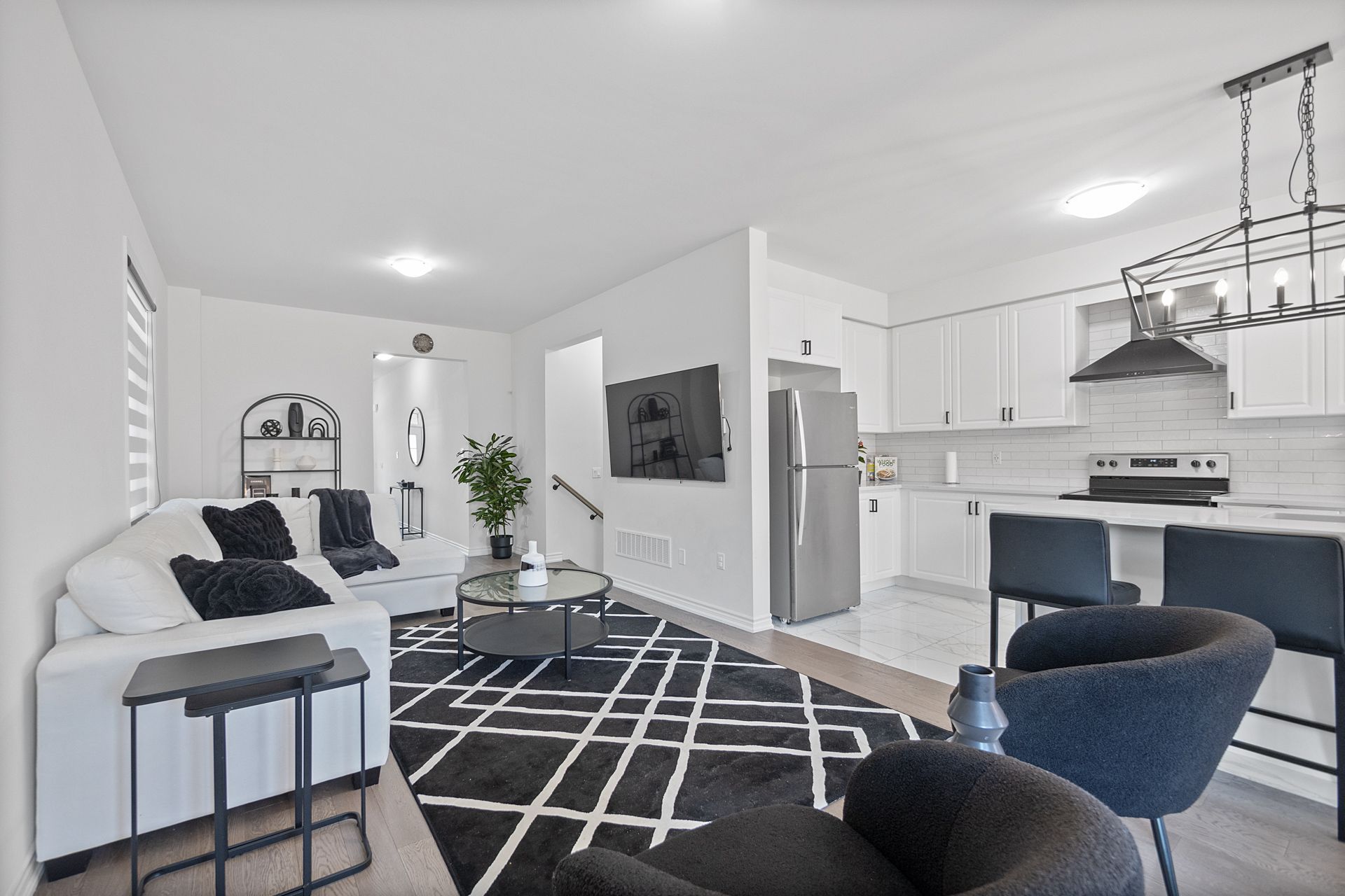 Welcome to this beautifully crafted semi-detached home nestled in a warm, family-friendly neighborhood. Offering nearly 1,800 square feet of thoughtfully designed living space with hardwood flooring throughout, this home features 3 spacious bedrooms and 3 stylish bathrooms. The exterior boasts an upgraded driveway with no sidewalk, allowing parking for 4 cars, and includes a newly installed ev charger. A grand double-door entry leads into a bright, open-concept living and dining area with smooth 9-foot ceilings on the main floor. The modern, oversized kitchen is perfect for entertaining, featuring a flush breakfast bar, sleek stainless steel appliances, a new quartz countertop, and a stylish tile backsplash. The expansive breakfast area opens onto a lovely patio and a generously sized backyard equipped with a gas line for bbqs. Upstairs, the luxurious primary bedroom offers a large walk-in closet and an upgraded 5-piece ensuite with his-and-hers sinks, a standalone tub, and a glass-enclosed shower. Two additional bedrooms share a beautifully finished bathroom with quartz countertops. For added convenience, the second floor includes a laundry room with built-in cabinetry, a laundry sink, and a quartz countertop. Ideally located close to schools, grocery stores, public transit, a community center, bradford go station, and highway 400, this home offers the perfect blend of comfort, style, and convenience.
