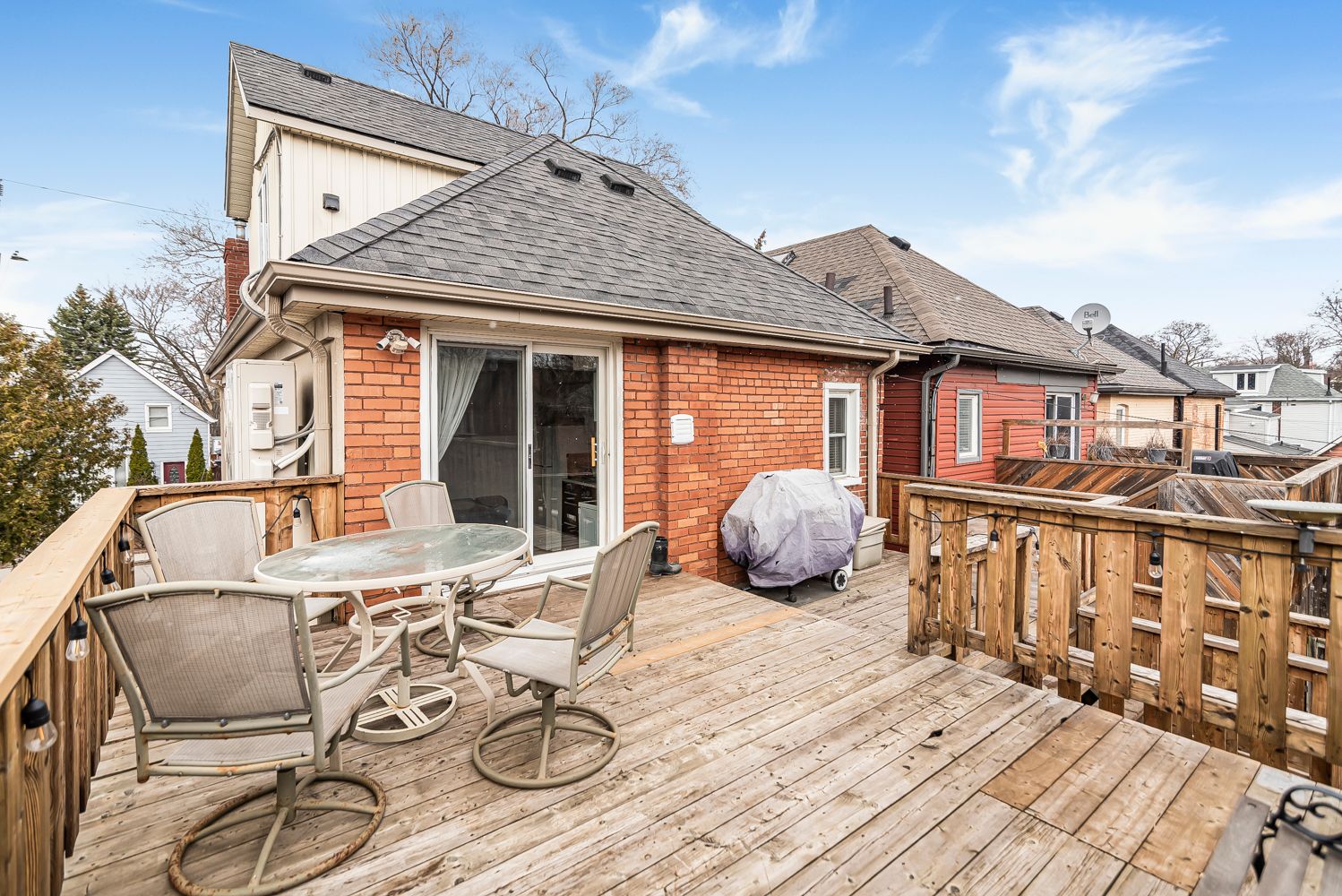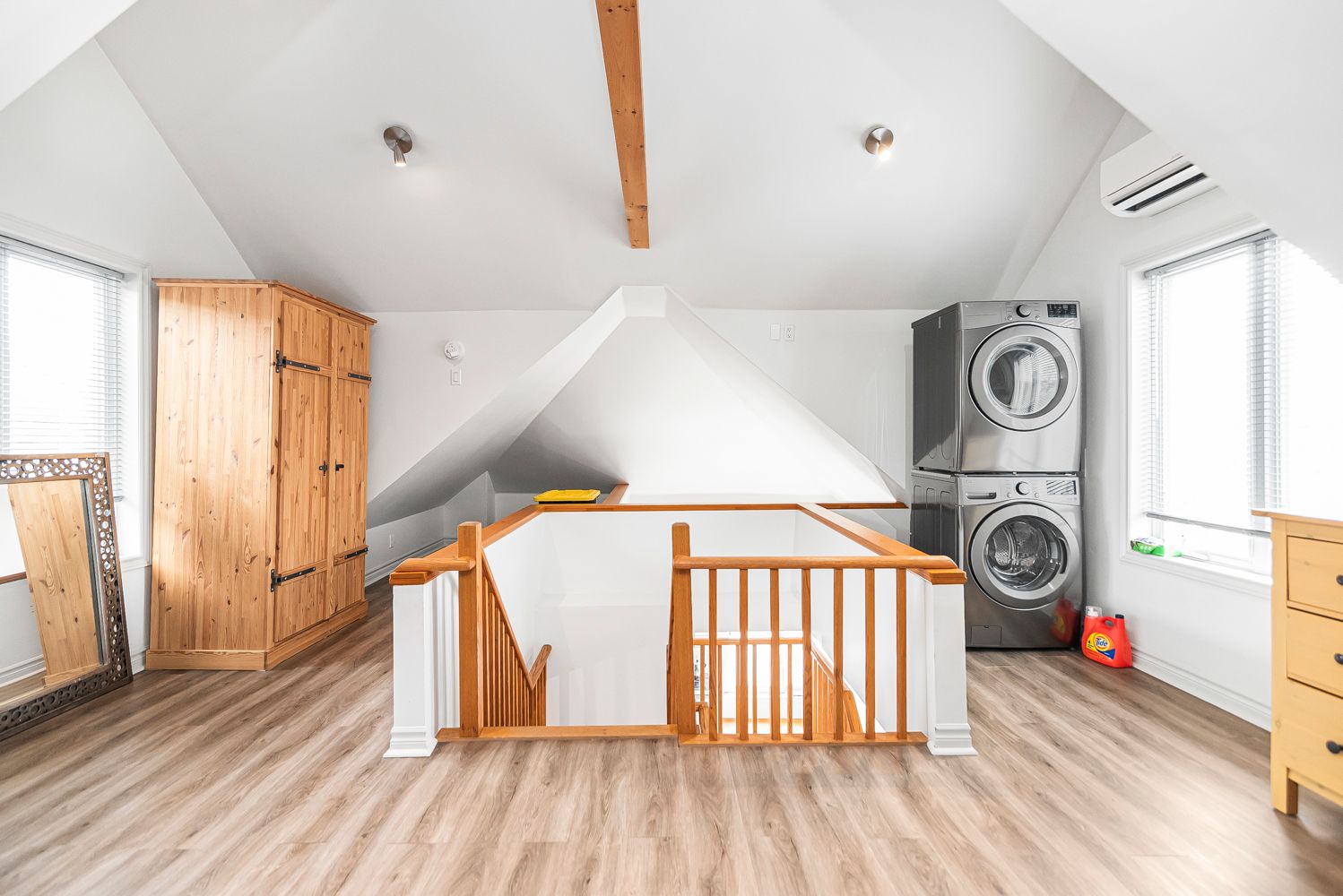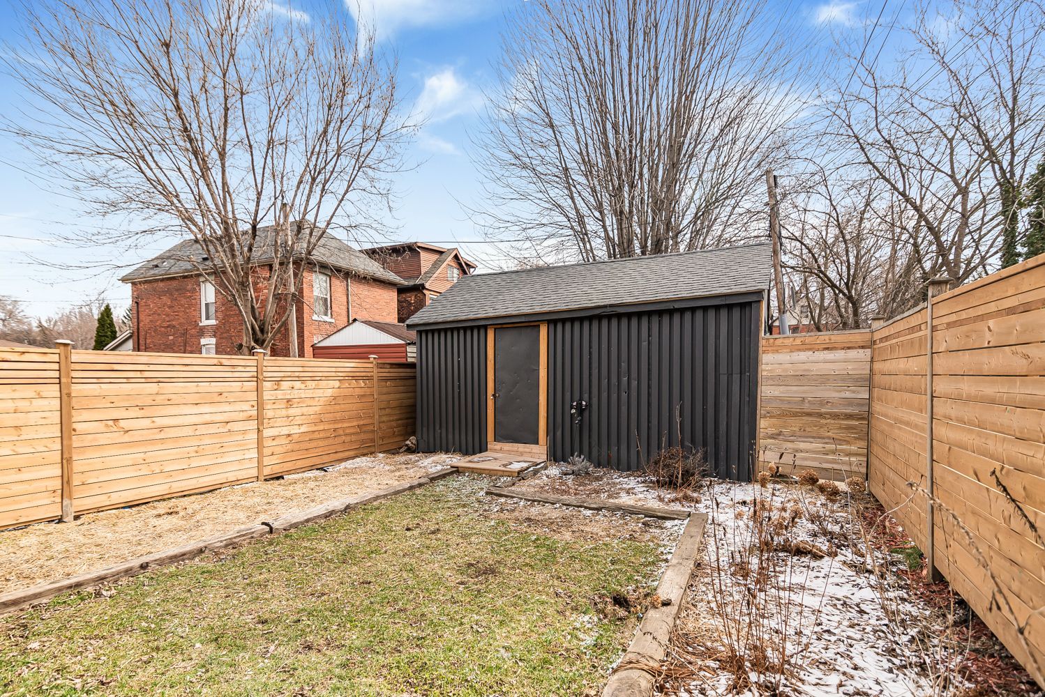 Two family home set up with separate entrances and separate hydro, offering flexibility for investors or buyers looking to live in one unit and use the other for extended family or income potential. Main floor unit is currently rented and features 2 bedrooms, open-concept kitchen with eating area and living room, 3-piece bathroom, and in-unit laundry. 9. 5 ft ceilings and tall windows add to the sense of space, and the kitchen offers a walk out to the backyard deck. Upper unit spans the second and third floors with open-concept kitchen, dining, and living area. The 2nd floor kitchen features exposed wood beams and walks out to a generous deck with fire escape. Third-floor loft features a spacious primary bedroom with vaulted ceiling, exposed beams, heat pump for heating and cooling, and laundry. Updated flooring, freshly painted, and tasteful lighting fixtures throughout. Furnace and water heater approximately 4 years old. Unfinished basement. Double detached garage off alley plus 2-car interlocking driveway at the front. Ample green space in fully fenced backyard. Located in west hamilton on a family-friendly street, just minutes to locke street shops, restaurants, and cafés, dundurn castle, the waterfront, and mcmaster university, with convenient access to transit and major routes.