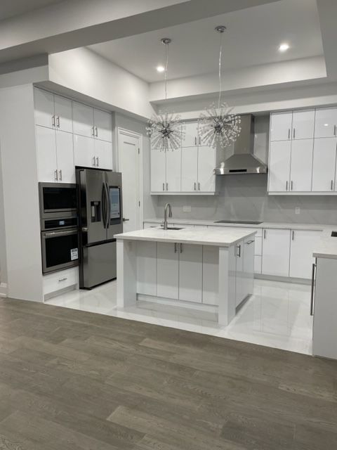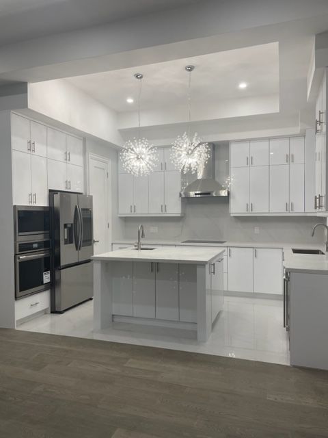 • Open concept kitchen equipped with modern appliances and quartz counters.