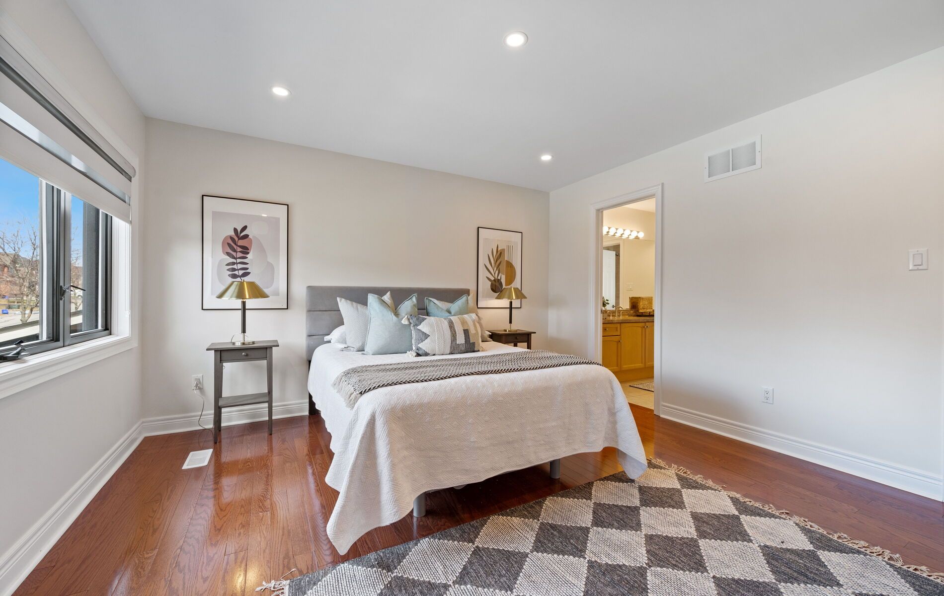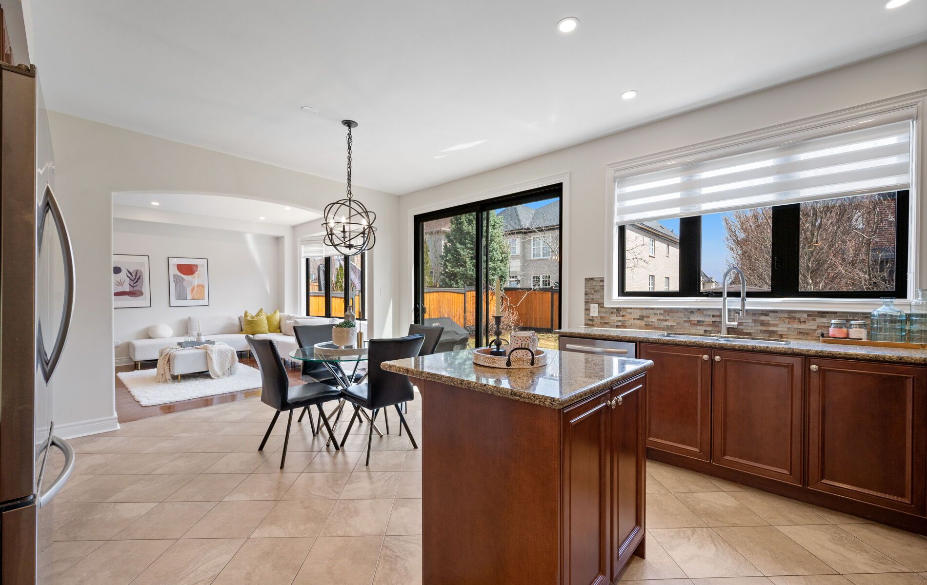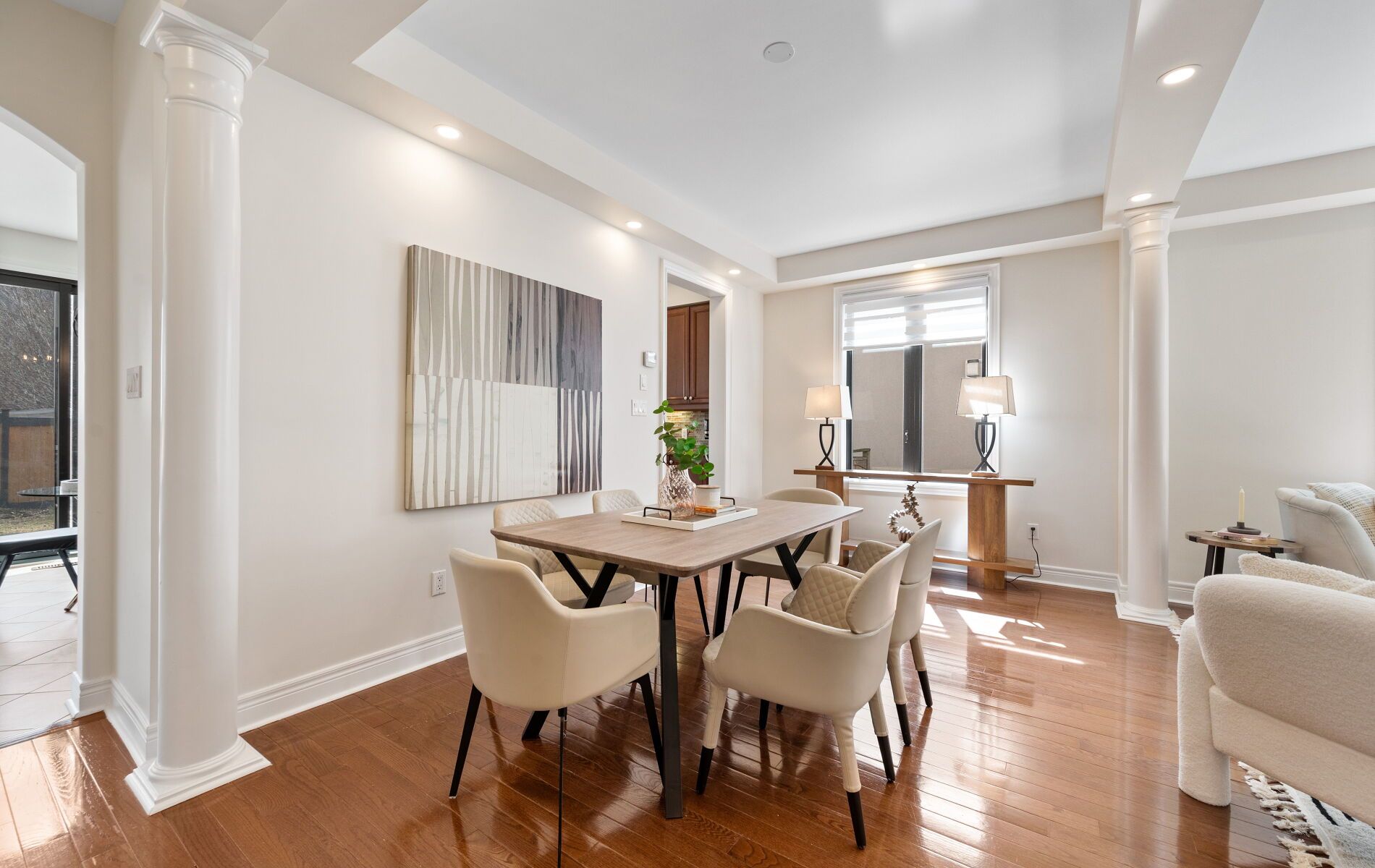 • Open-concept living and dining area with hardwood flooring and pot lights.