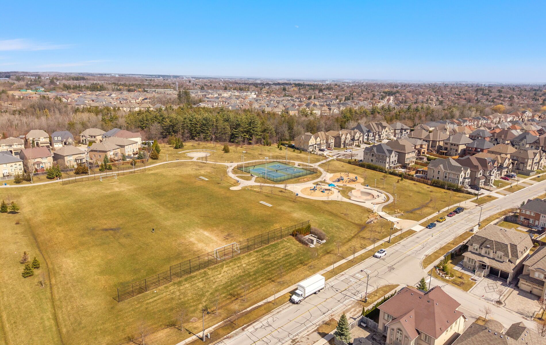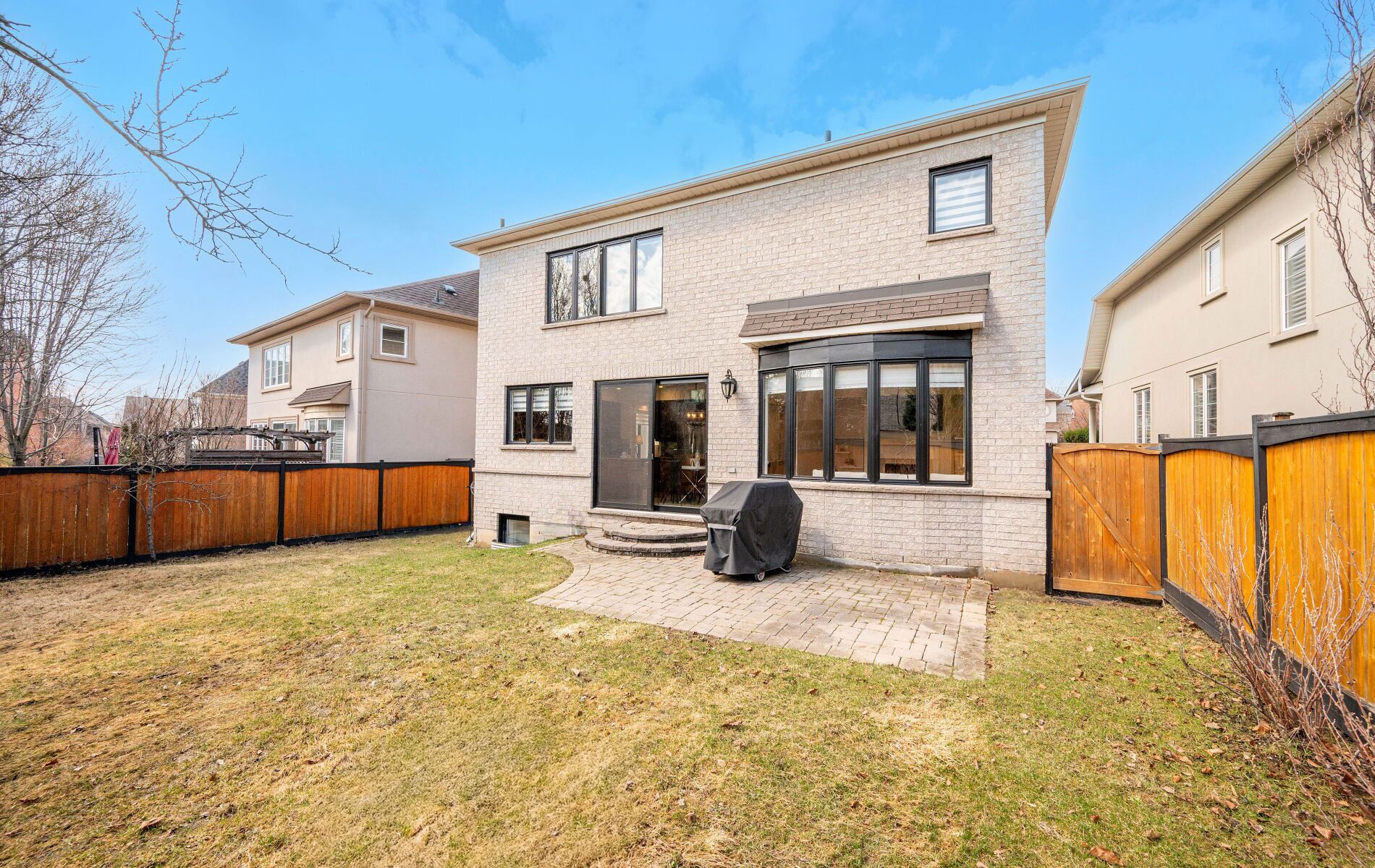 Situated on a premium pie-shaped lot in upper thornhill estates, this beautifully maintained 4-bedroom, 5-bathroom executive residence stands out in one of vaughan's most desirable communities. A striking stone-accented façade, covered front porch, and juliette balcony define the exterior, while parks, scenic green space, and walking trails are just moments away. The front foyer opens into a seamless open-concept living and dining area, complemented by hardwood flooring and pot lights throughout, while a private main floor office offers an ideal space to work, focus, or unwind. The layout flows into a sun-filled family room centered around a cozy gas fireplace creating an inviting place to gather and share special moments. The spacious kitchen features a centre island, stainless steel appliances and a bright breakfast area with sliding doors providing direct access to a fully fenced backyard - perfect for hosting and time spent with family and friends. Expansive windows with updated glass and custom blinds fill the home with natural light throughout. Upstairs, four generously sized bedrooms are thoughtfully arranged, including a primary suite with a walk-in closet and 5-piece ensuite, a jack-and-jill bath connecting bedrooms two and three and a fourth bedroom with its own private ensuite. A soaring skylight enhances the upper level with an airy feel. The finished basement extends the living space with two massive recreation areas, complete with oversized windows and a 3-piece bath-well suited for a home theatre, gym, play space, or guest setup, offering flexibility to suit your lifestyle. Located near well-regarded schools including herbert h. Carnegie public school, as well as parks, community amenities, shopping and transit, this is truly an exceptional home in a highly sought-after location.
