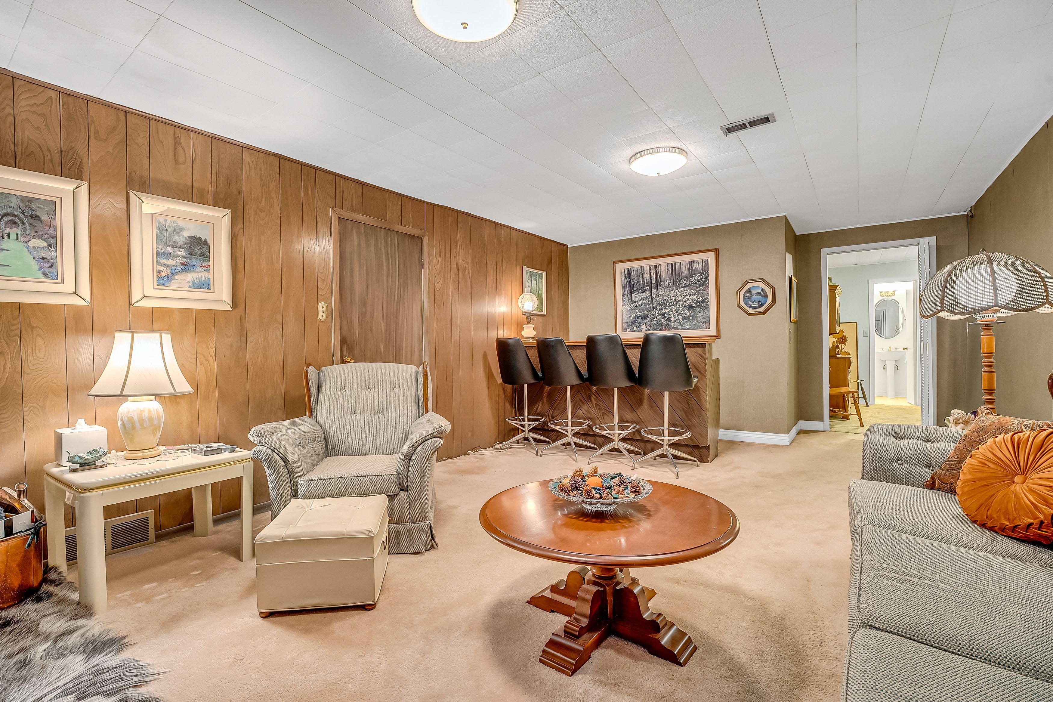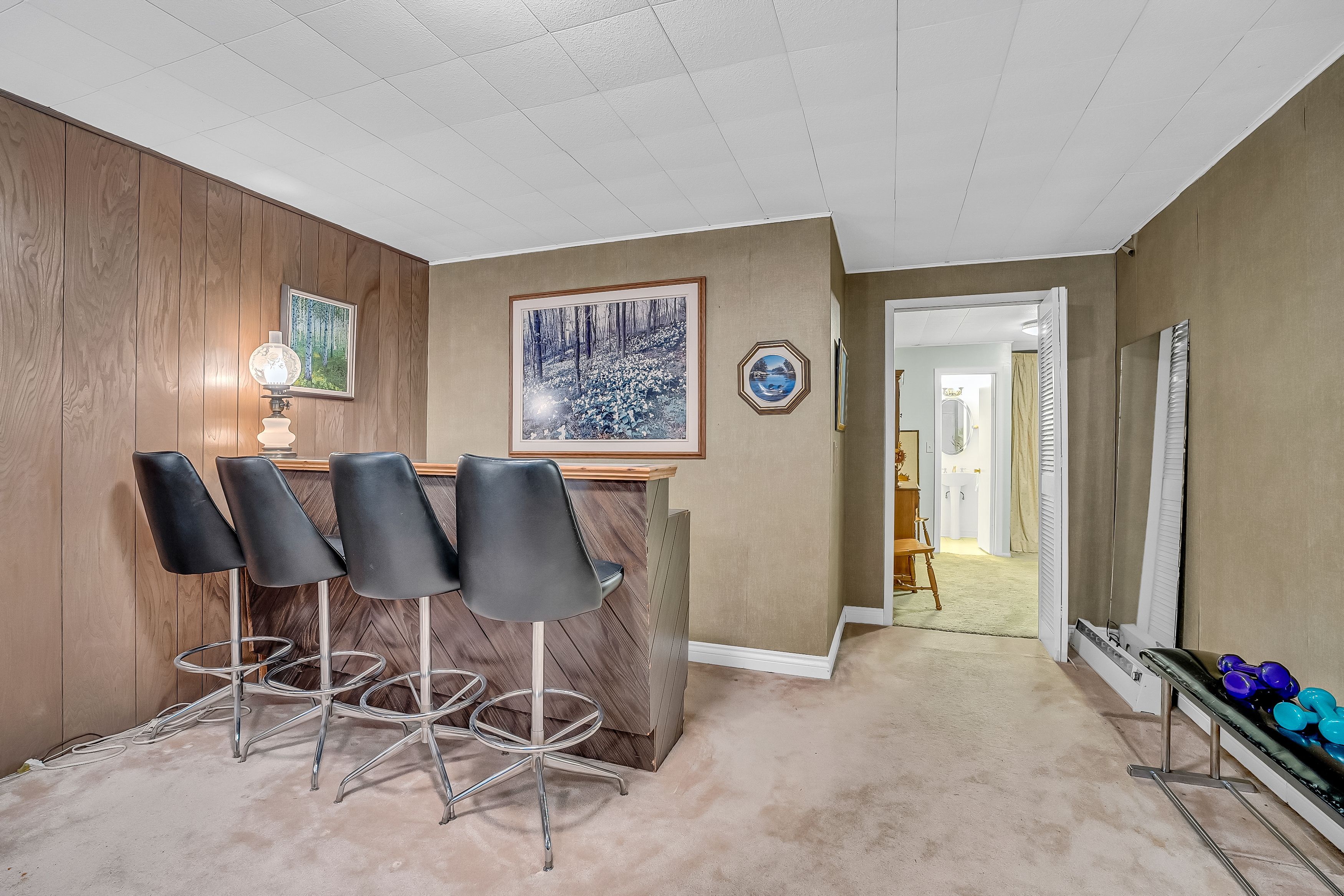 • Finished lower level featuring a large rec room and wood-burning fireplace.