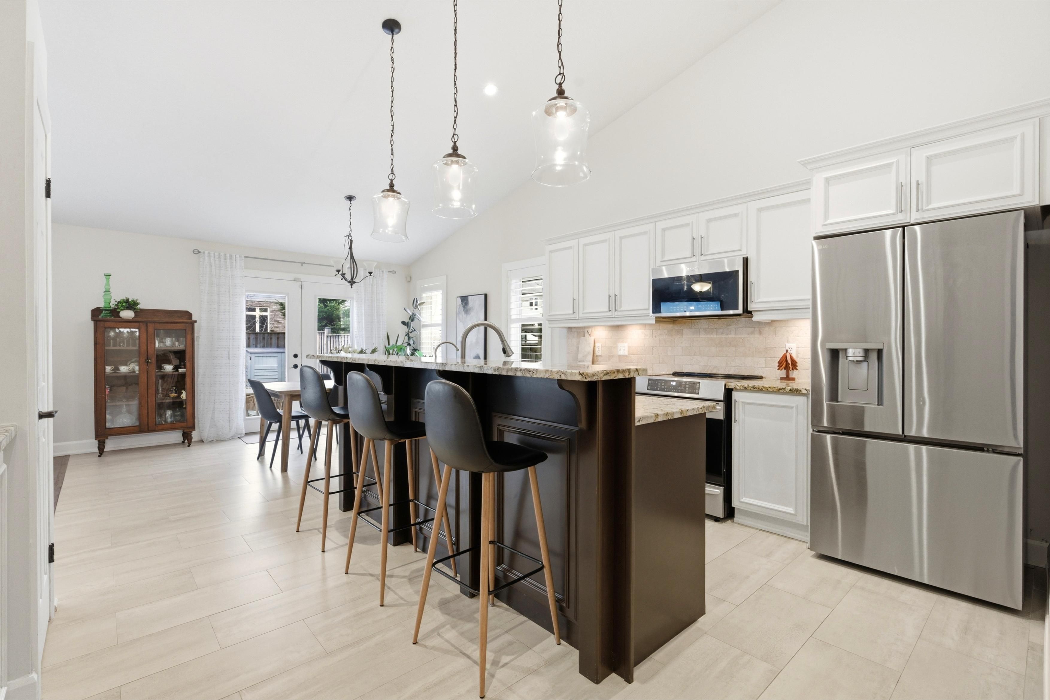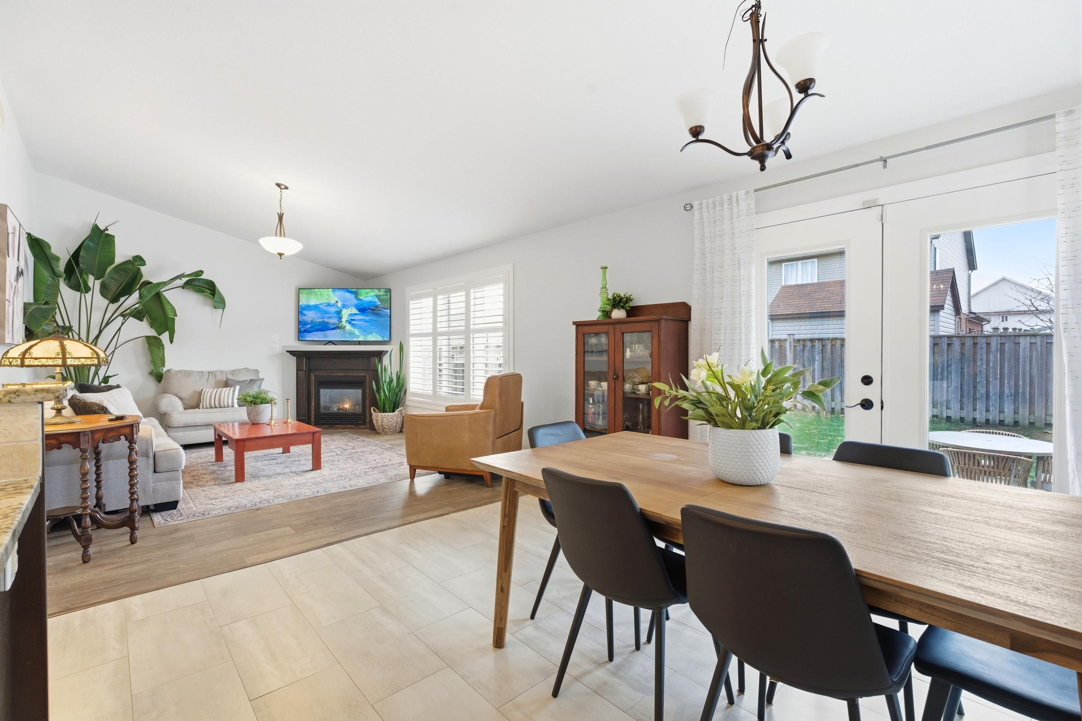 • Bright living area with fireplace and access to a fenced backyard patio.