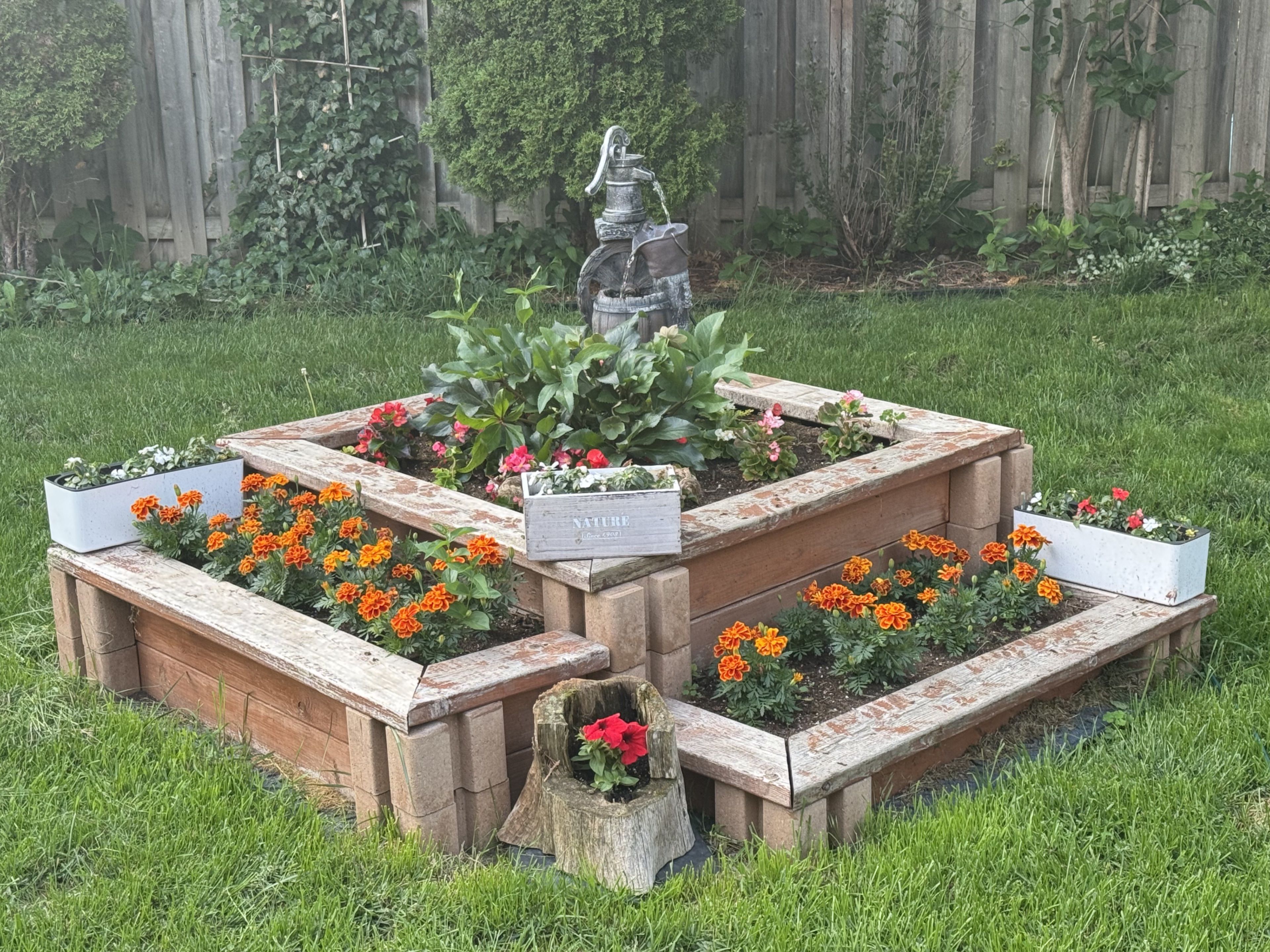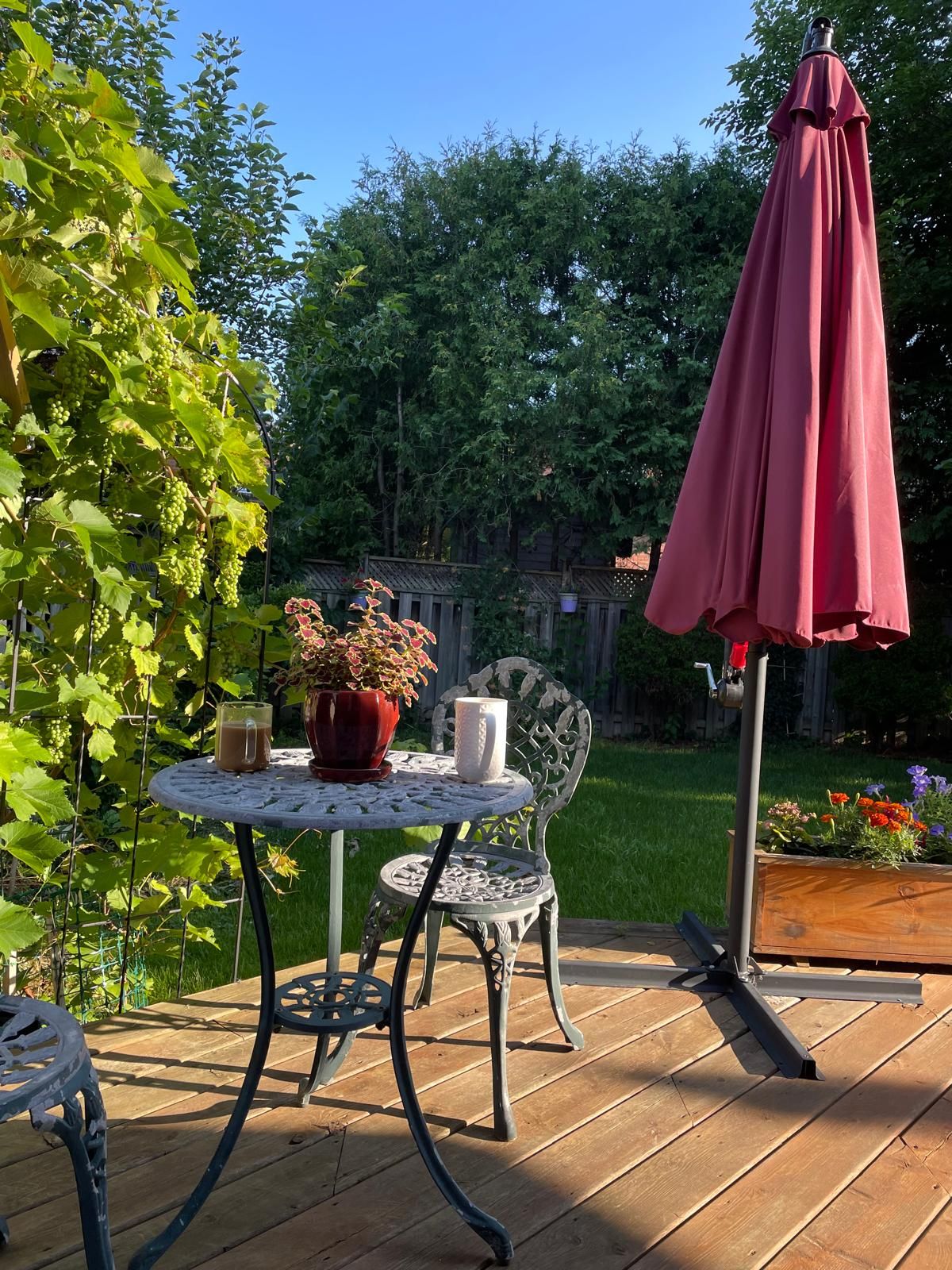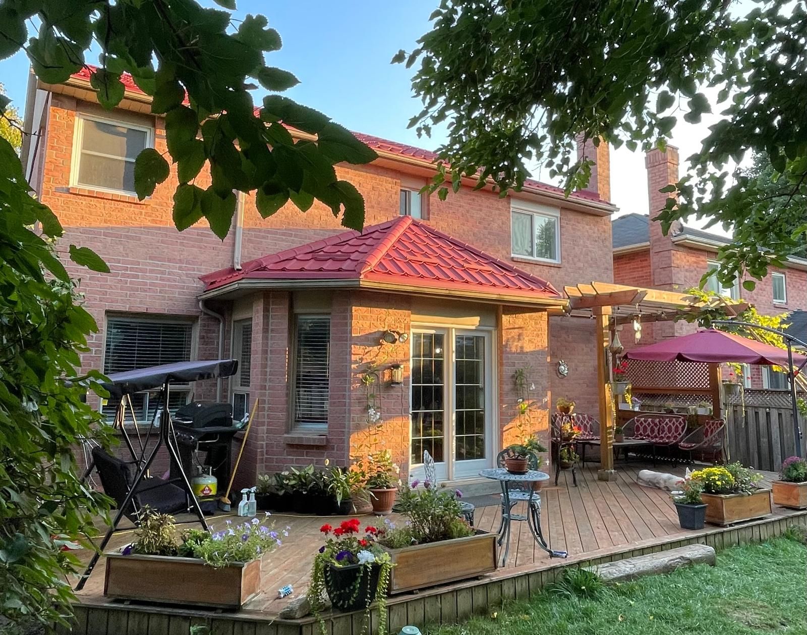 • Large private backyard featuring a deck, pergola, and mature gardens.