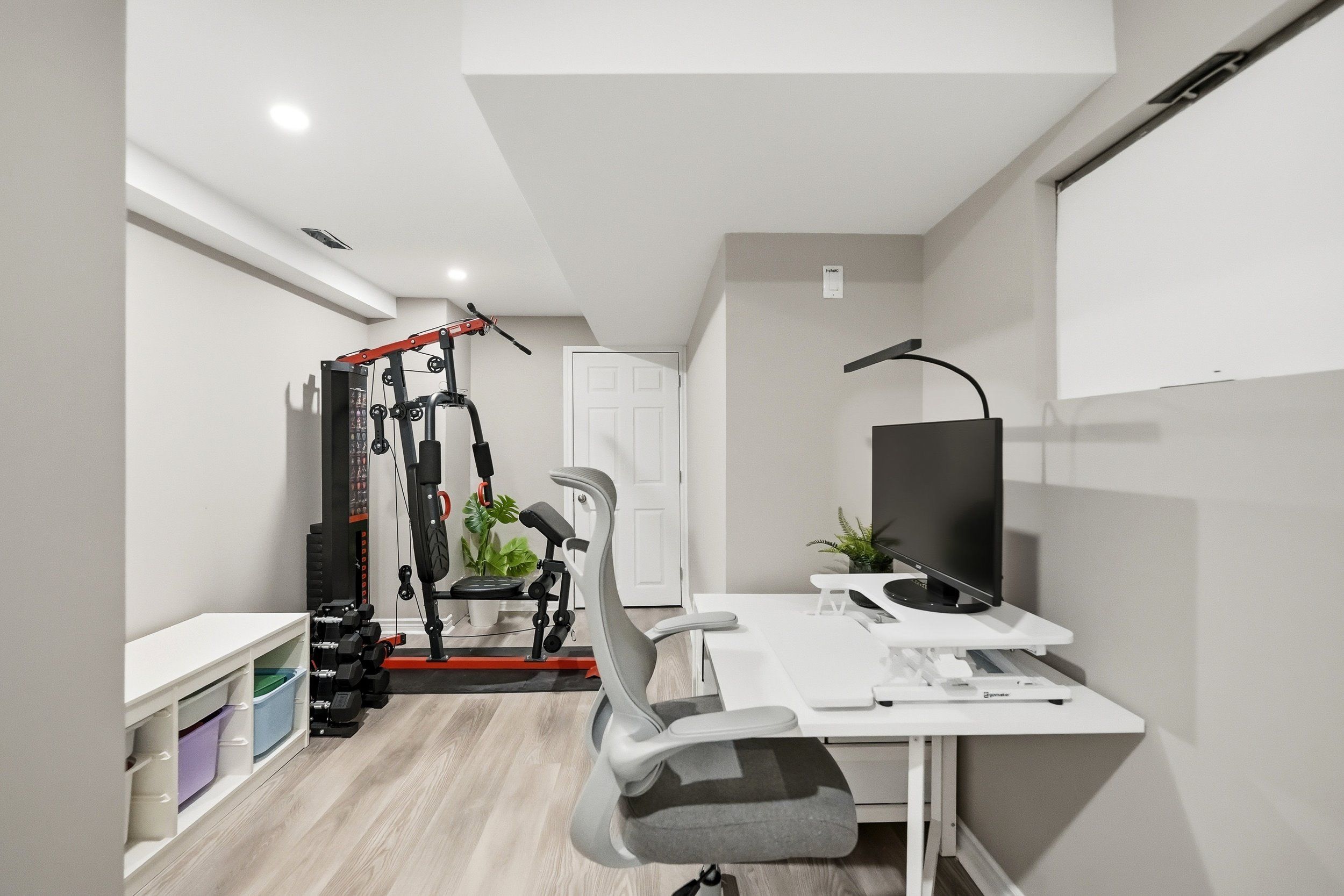 • Finished basement with projector, electric fireplace, and additional bonus room.
