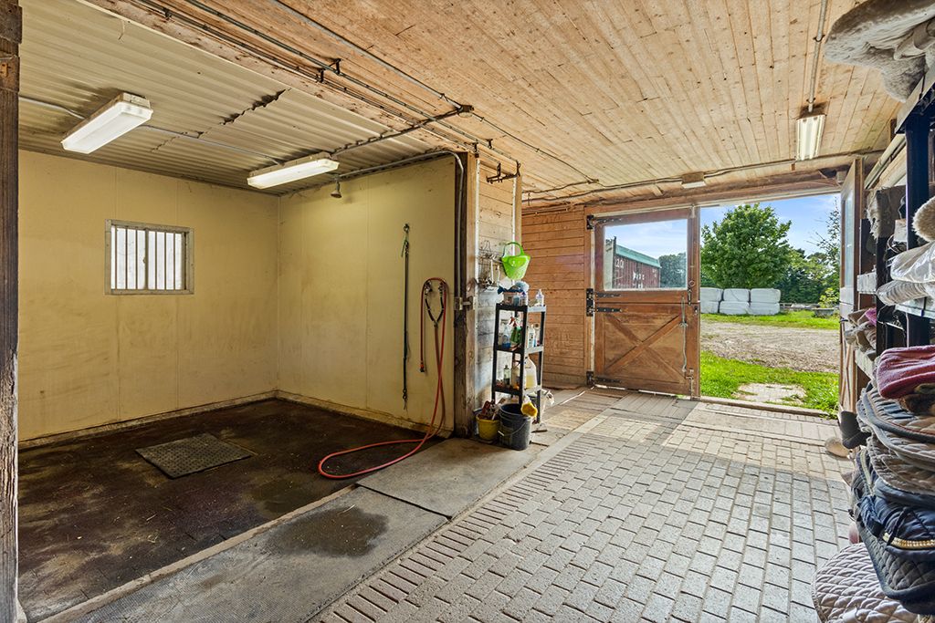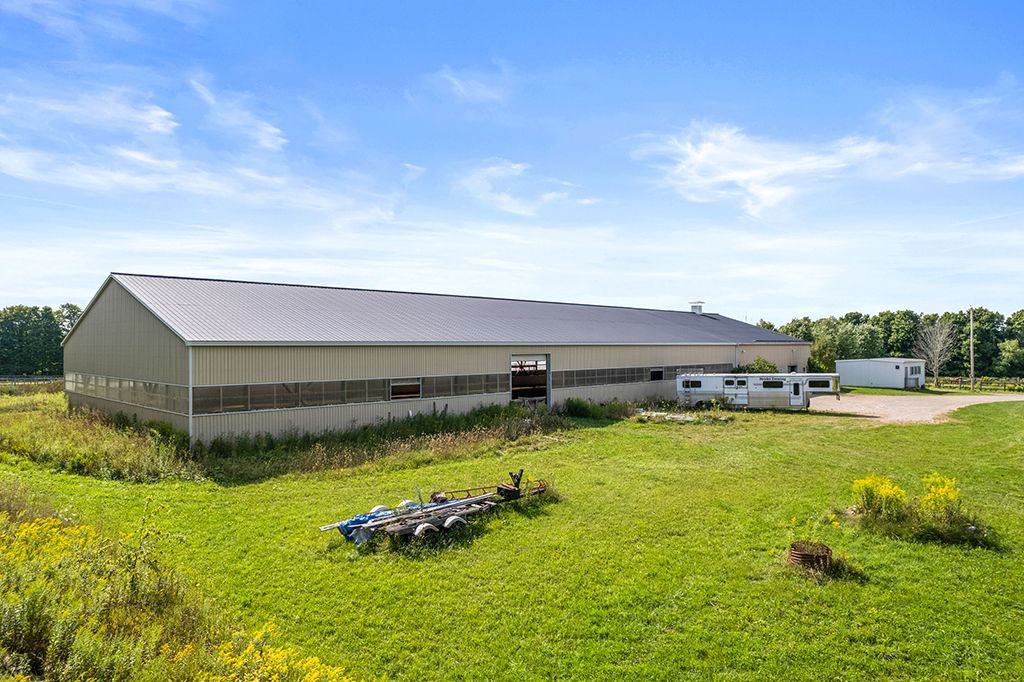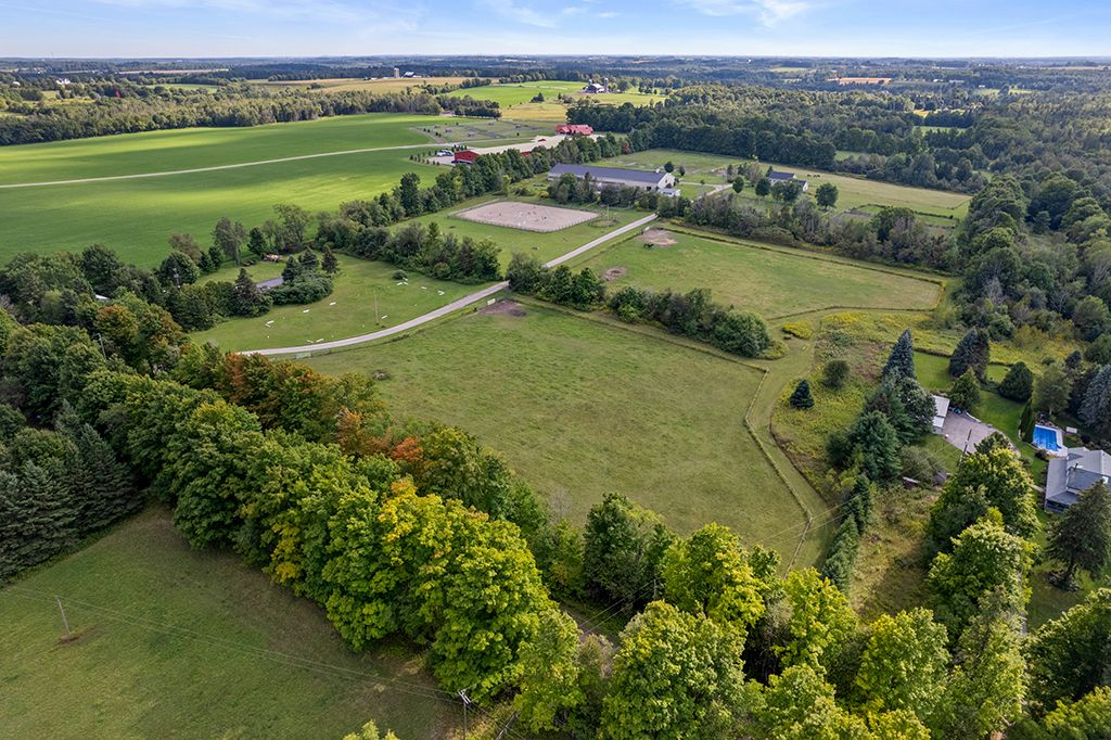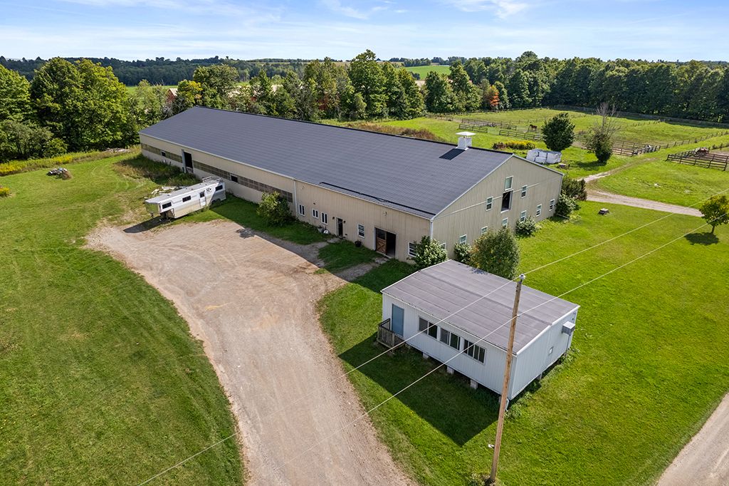 Turnkey 49-acre equestrian facility - a rare opportunity for the serious horse professional. Currently operating as a successful pleasure riding & eventing facility, this exceptional 49-acre property is fully equipped for boarding or training in any discipline. The farm features 10 lush paddocks with frost-free hydrants and power for heated winter water, plus an insulated, ventilated 20-stall barn complete with heated tack room, 3-piece bath, feed room, wash and grooming stalls, & a hay loft with drops. Train year-round in the attached 76' x 160' indoor arena with operable windows and quality footing, or enjoy the outdoor jumping field, 150' x 200' sand ring, and grass dressage field. Two productive hayfields provide income potential or self-sufficiency. A 23' x 30' heated portable building with hydro offers flexible use as an office or storage. The 2,877 sq. Ft. Residence (1997) delivers a refined and luxurious base of operations. Wide-plank, hand-scraped hickory hardwood floors and soaring cathedral ceilings set an elegant tone. The chef's kitchen features a wolf cooktop and leathered granite counters, flowing seamlessly into the dining area and great room with beamed cathedral ceiling. Flexible accommodations include a main-floor bedroom with ensuite and three additional bedrooms upstairs, along with beautifully renovated bathrooms featuring heated floors and towel warmers. The primary suite offers a private retreat with dressing room, walk-in closet with organizers, and a spa-inspired ensuite. An unspoiled walk-out lower level provides endless future potential. Recent upgrades focused on efficiency and reliability include a 2024 cold-climate heat pump with propane backup, generac generator powering farm essentials, durable goodfellow siding, and original energy-efficient pella windows. Ideally located minutes from angelstone, meadowlarke north, and palgrave, this is an entrepreneur's dream-a fully operational equestrian boarding or training facility ready to go.